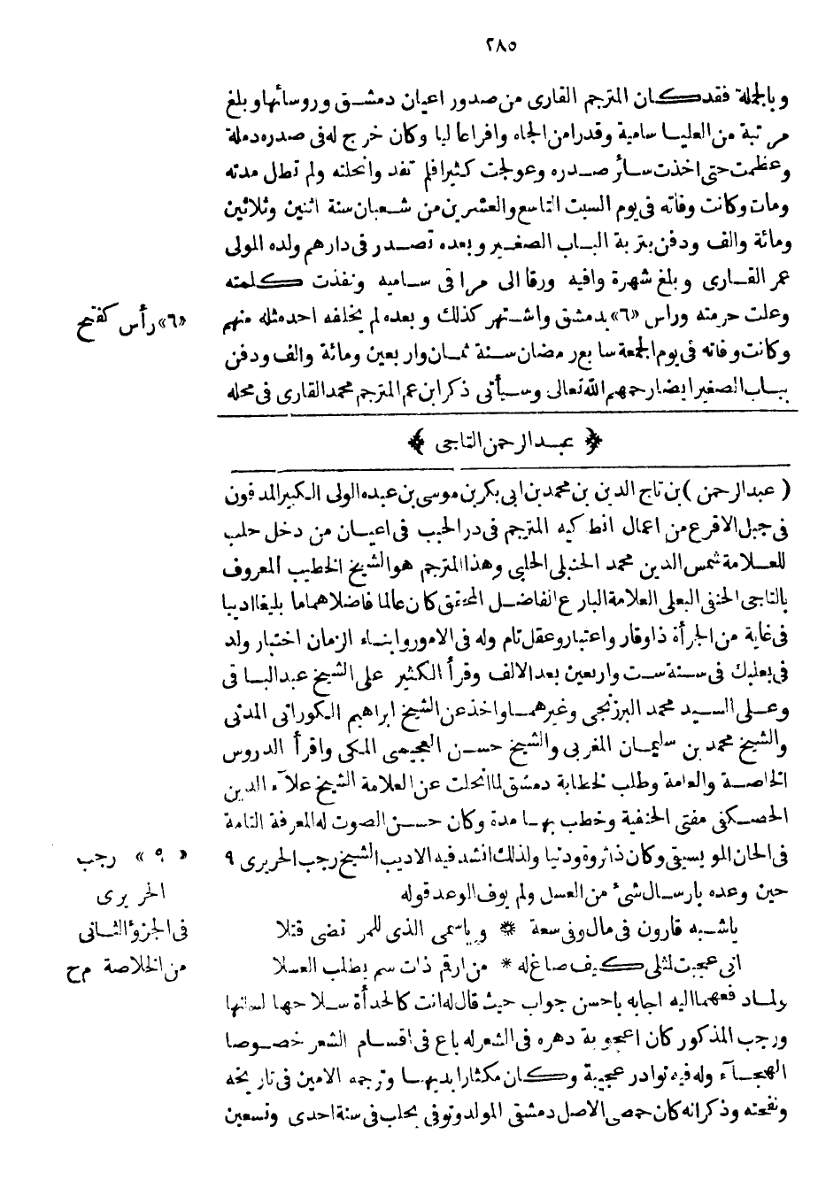 وبالجملة فقد كان المترجم القاري من صدور أعيان دمشق ورؤسائها وبلغ مرتبة من العليا سامية وقدراً من الجاه وافراً عالياً وكان خرج له في صدره دملة وعظمت حتى أخذت سائر صدره وعولجت كثيراً فلم تفد وانحلته ولم تطل مدته ومات وكانت وفاته في يوم السبت التاسع والعشرين من شعبان سنة اثنين وثلاثين ومائة وألف ودفن بتربة الباب الصغير وبعده تصدر في دارهم ولده المولى عمر القاري وبلغ شهرة وافية ورقا إلى مراقي سامية ونفذت كلمته وعلت حرمته وراس بدمشق واشتهر كذلك وبعده لم يخلفه أحد مثله منهم وكانت وفاته في يوم الجمعة سابع رمضان سنة ثمان وأربعين ومائة وألف ودفن بباب الصغير أيضاً رحمهم الله تعالى وسيأتي ذكر ابن عم المترجم محمد القاري في محله.