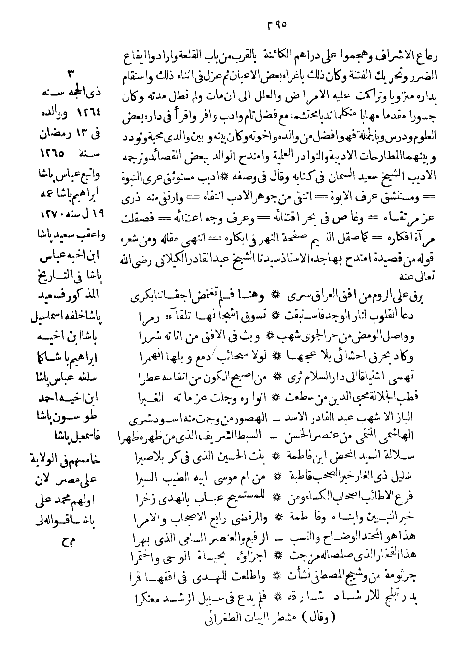 رعاع الأشراف وهجموا على دراهم الكائنة بالقرب من باب القلعة وأرادوا ايقاع الضرر وتحريك الفتنة وكان ذلك باغراء بعض الأعيان ثم عزل في أثناء ذلك واستقام بداره منزوياً وتراكمت عليه الأمراض والعلل إلى أن مات ولم تطل مدته وكان جسوراً مقدماً مهاباً متكلماً ندباً محتشماً مع فضل تام وأدب وافر وأقرأ في داره بعض العلوم ودرس وبالجملة فهو أفضل من والده واخوته وكان بينه وبين والدي محبة وتودد وبينهما المطارحات الأدبية والنوارد العلمية وامتدح الوالد ببعض القصائد وترجمه الأديب الشيخ سعيد السمان في كتابه وقال في وصفه أديب مستوثق عري النبوة ومستنشق عرف الأبوة انتقى من جوهر الأدب انتقاه وارتقى منه ذرى عز مرتقاه وغاص في بحر اقتنائه وعرف وجه اعتنائه فصقلت مرآة أفكاره كما صقل النسيم صفحة النهر في أبكاره انتهى مقاله ومن شعره قوله من قصيدة امتدح بها جده الاستاذ سيدنا الشيخ عبد القادر الكيلاني رضي الله تعالى عنه.