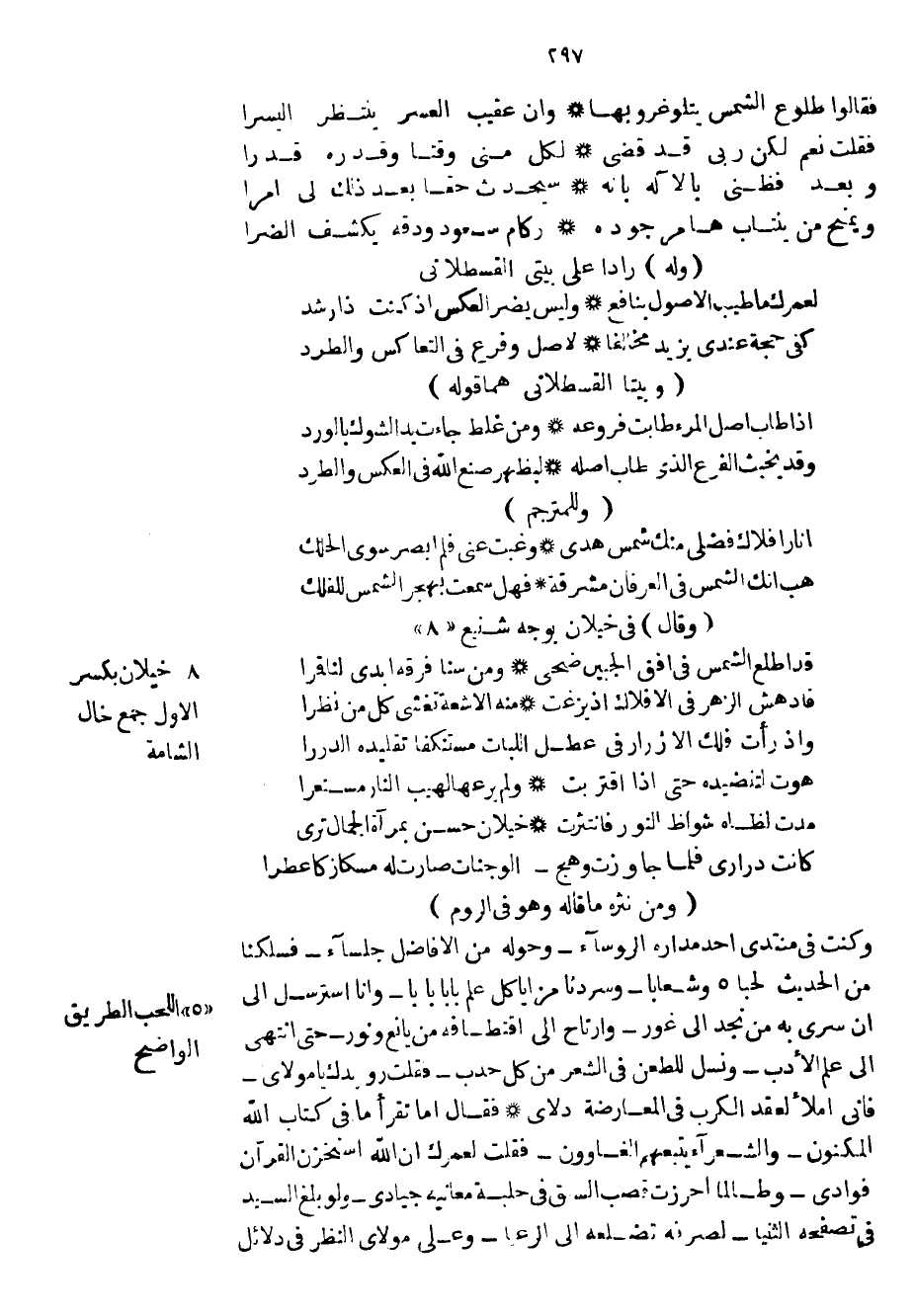 وكنت في منتدى أحد مداره الرؤساء وحوله من الأفاضل جلساء فسلكنا من الحديث لحباً وشعاباً وسردنا مزايا كل علم باباً باباً وأنا أسترسل إلى أن سرى به من نجد إلى غور وأرتاح إلى اقتطافه من يانع ونور حتى انتهى إلى علم الأدب ونسل للطعن في الشعر من كل حدب فقلت رويدك يا مولاي فإني أملأ لعقد الكرب في المعارضة دلاي فقال أما تقرأ ما في كتاب الله المكنون والشعراء يتبعهم الغاوون فقلت لعمرك إن الله استخزن القرآن فوادي وطالما أحرزت قصب السق في حلبة معانيه جيادي ولو بلغ السيد في تصفحه الثنيا لصرفه تضلعه إلى الرعيا وعلى مولاي النظر في دلائل