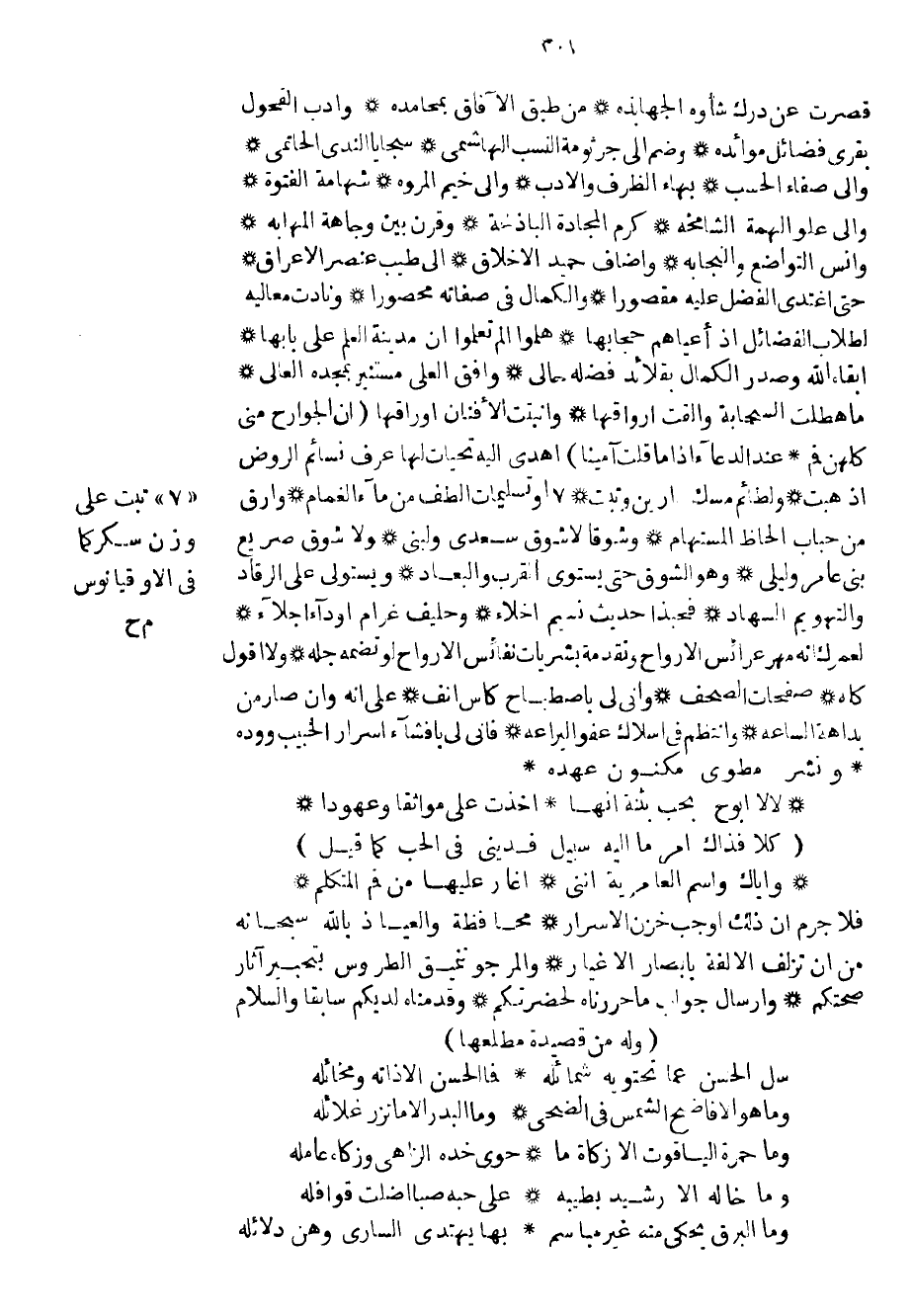قصرت عن درك شأوه الجهابذة من طبق الآفاق بمحامده وأدب الفحول بقرى فضائل موائده وضم إلى جرثومة النسب الهاشمي سجايا الندى الحاتمي وإلى صفاء الحسب بهاء الظرف والأدب وإلى خيم المروة شهامة الفتوة وإلى علو الهمة الشامخة كرم المجادة الباذخة وقرن بين وجاهة المهابة وأنس التواضع والنجابة وأضاف حميد الأخلاق إلى طيب عنصر الأعراق حتى أغتدي الفضل عليه مقصوراً والكمال في صفاته محصوراً ونادت معاليه لطلاب الفضائل إذ أعياهم حجابها هلموا ألم تعلموا إن مدينة العلم على بابها ابقاء الله وصدر الكمال بقلائد فضله حالي وأفق العلى مستنير بمجده العالي ما هطلت السحابة وألقت أرواقها وأنبتت الأفنان أوراقها إن الجوارح مني كلهن فم عند الدعاء إذا ما قلت آميناً أهدي إليه تحيات لها عرف نسائم الروض إذ هبت ولطائم مسك أرين وتبت أو تسليمات ألطف من ماء الغمام وأرق من حباب ألحاظ المستهام وشوقاً لا شوق سعدي ولبنى ولا شوق صريع بني عامر وليلى وهو الشوق حتى يستوي القرب والبعاد ويستولي على الرقاد والتهويم السهاد فحبذا حديث نسيم اخلاء وحليف غرام أو داء اجلاء لعمرك إنه مهر عرائس الأرواح وتقدمة بشريات نفائس الأرواح لو تضمه جله ولا أقول كله صفحات الصحف وإني لي باصطباح كأس أنف على إنه وأن صار من بداهة الساعة وانتظم في أسلاك عفو اليراعة فأنى لي بافشاء أسرار الحبيب ووده ونشر مطوى مكنون عهده