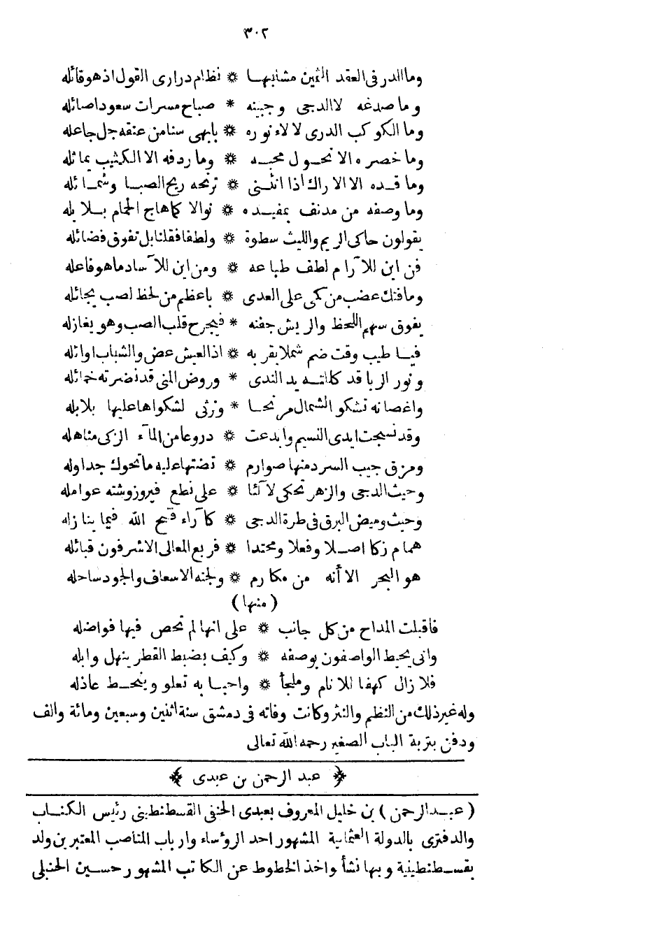 عبد الرحمن بن خليل المعروف بعبدي الحنفي القسطنطيني رئيس الكتاب والدفتري بالدولة العثمانية المشهور أحد الرؤساء وأرباب المناصب المعتبرين ولد بقسطنطينية وبها نشأ وأخذ الخطوط عن الكاتب المشهور حسين الحنبلي