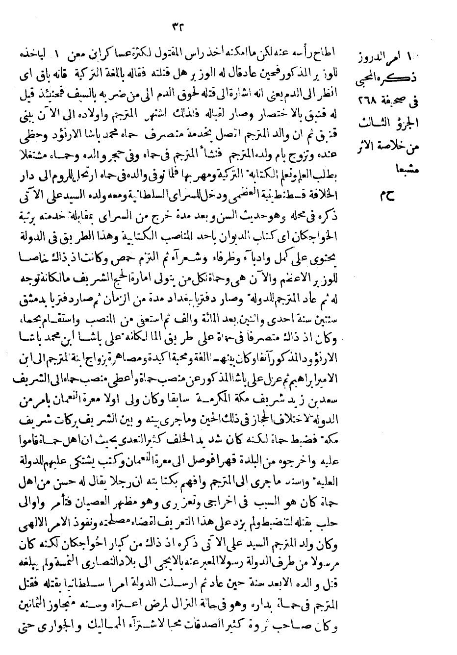 أطاح رأسه عنه لكن ما أمكنه أخذ رأس المقتول لكثرة عساكر ابن معن ليأخذه للوزير المذكور فحين عاد قال له الوزير هل قتلته فقاله باللغة التركية فإنه باق أي انظر إلى الدم يعني انه اشارة إلى قتله لحوق الدم إلى من ضربه بالسيف فحينئذ قيل له قنبق بالاختصار وصار لقباً له فلذلك اشتهر المترجم وأولاده إلى الآن ببني قنبق ثم ان والد المترجم اتصل بخدمة متصرف حماه محمد باشا الارنؤد وحظى عنده وتزوج بأم ولده المترجم فنشأ المترجم في حماه وفي حجر والده وحماه مشتغلاً بطلب العلم وتعلم الكتابة التركية ومهر بها فلما توفي والده في حماه ارتحل للروم إلى دار الخلافة قسطنطينية العظمى ودخل للسراي السلطانية ومعه ولده السيد علي الآتي ذكره في محله وهو حديث السن وبعد مدة خرج من السراي بمقابلة خدمته برتبة الخواجكان أي كتاب الديوان بأحد المناصب الكتأبية وهذا الطريق في الدولة يحتوي على كمل وادباء وظرفاء وشعراء ثم التزم حمص وكأنت اذ ذاك خاصاً للوزير الأعظم والآن هي وحماة لكل من يتولى امارة الحج الشريف مالكانة توجه له ثم عاد المترجم للدولة وصار دفترياً ببغداد مدة من الزمان ثم صار دفترياً بدمشق سنتين سنة احدى واثنين بعد المائة وألف ثم استعفى من المنصب واستقام بحماه وكان اذ ذاك متصرفاً في حماة على طريق المالكانة علي باشا ابن محمد باشا الارنؤود المذكور آنفاً وكان بينهما الفة ومحبة أكيدة ومصاهرة بزواج ابنة المترجم إلى ابن الأمير إبراهيم ثم عزل علي باشا المذكور عن منصب حماة وأعطى منصب حماه إلى الشريف سعد بن زيد شريف مكة المكرمة سابقاً وكان ولي أولاً معرة النعمان بأمر من الدولة لأختلاف الحجاز في ذلك الحين وما جرى بينه وبين الشريف بركات شريف مكة فضبط حماة لكنه كان شديد الخلف كثير التعدي بحيث أن أهل حماة قاموا عليه وأخرجوه من البلدة قهراً فوصل إلى معرة النعمان وكتب يشتكي عليهم للدولة العلية وأسند ما جرى إلى المترجم وأفهم بكتابته ان رجلاً يقال له حسن من أهل حماة كان هو السبب في اخراجي وتعزيري وهو مظهر العصيان فتأمر وأوالي حلب بقتله لتنضبط ولم يزد على هذا التعريف لقضاء مصلحته ونفوذ الأمر الالهي وكان ولد المترجم السيد علي الآتي ذكره اذ ذاك من كبار الخواجكان لكنه كان مرسولاً من طرف الدولة رسولاً المعبر عنه بالايجي إلى بلاد النصارى النمسة ولم يبلغه قتل والده الا بعد سنة حين عاد ثم أرسلت الدولة أمراً سلطانياً بقتله فقتل المترجم في حماة بداره وهو في حالة النزال لمرض اعتراه وسنه متجأوز الثمانين وكان صاحب ثروة كثير الصدقات محباً لاشتراء المماليك والجواري حتى