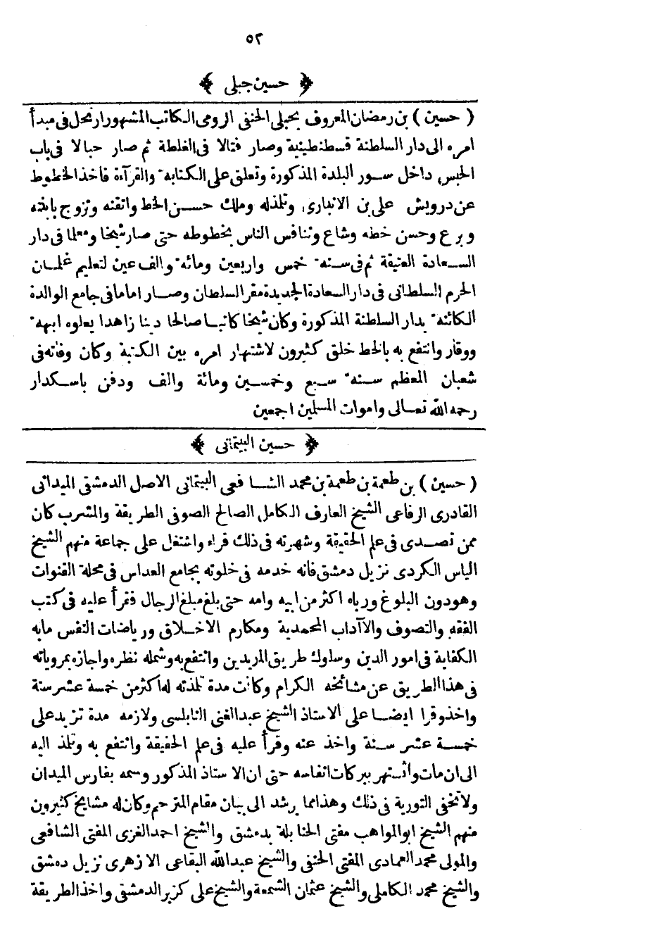 حسين بن رمضان المعروف بجبلي الحنفي الرومي الكاتب المشهور ارتحل في مبدأ أمره إلى دار السلطنة قسطنطينية وصار فتالاً في الغلطة ثم صار حبالاً في باب الحبس داخل سور البلدة المذكورة وتعلق على الكتابة والقراءة فأخذ الخطوط عن درويش علي بن الأنباري وتلمذ له وملك حسن الخط وأتقنه وتزوج بابنته وبرع وحسن خطه وشاع وتنافس الناس بخطوطه حتى صار شيخاً ومعلماً في دار السعادة العتيقة ثم في سنة خمس وأربعين ومائة وألف عين لتعليم غلمان الحرم السلطاني في دار السعادة الجديدة مقر السلطان وصار اماماً في جامع الوالدة الكائنة بدار السلطنة المذكورة وكان شيخاً كاتباً صالحاً ديناً زاهداً يعلوه أبهة ووقار وأنتفع به بالخط خلق كثيرون لأشتهار أمره بين الكتبة وكان وفاته في شعبان المعظم سنة سبع وخمسين ومائة وألف ودفن باسكدار رحمه الله تعالى وأموات المسلمين أجمعين.