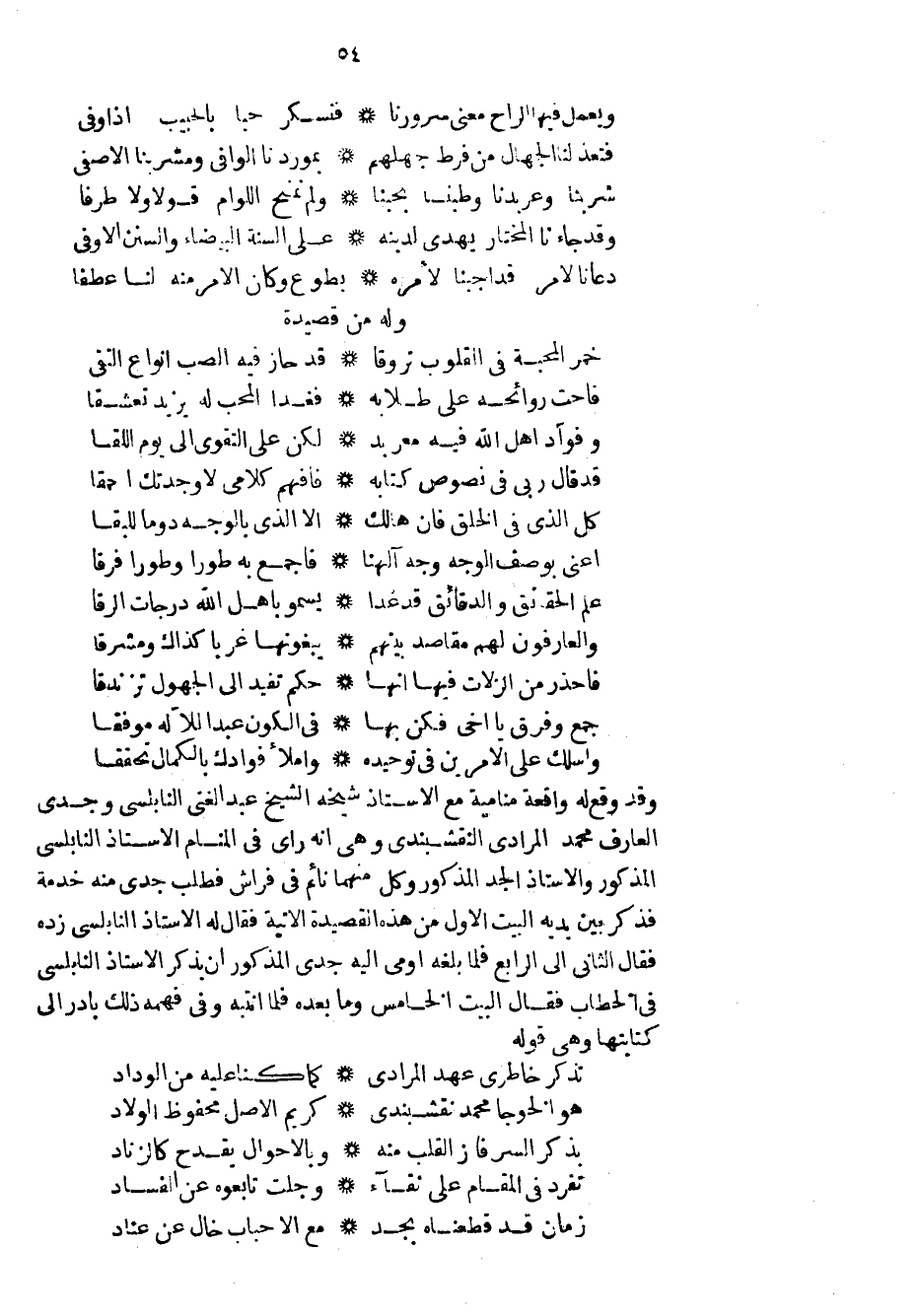 وقد وقع له واقعة منامية مع الاستاذ شيخه الشيخ عبد الغني النابلسي وجدي العارف محمد المرادي النقشبندي وهي انه رأى في المنام الاستاذ النابلسي المذكور والاستاذ الجد المذكور وكل منهما نائم في فراش فطلب جدي منه خدمة فذكر بين يديه البيت الأول من هذه القصيدة الآتية فقال له الاستاذ النابلسي زده فقال الثاني إلى الرابع فلما بلغه أومى إليه جدي المذكور ان يذكر الاستاذ النابلسي في الخطاب فقال البيت الخامس وما بعده فلما أنتبه وفي فهمه ذلك بادر إلى كتابتها وهي قوله