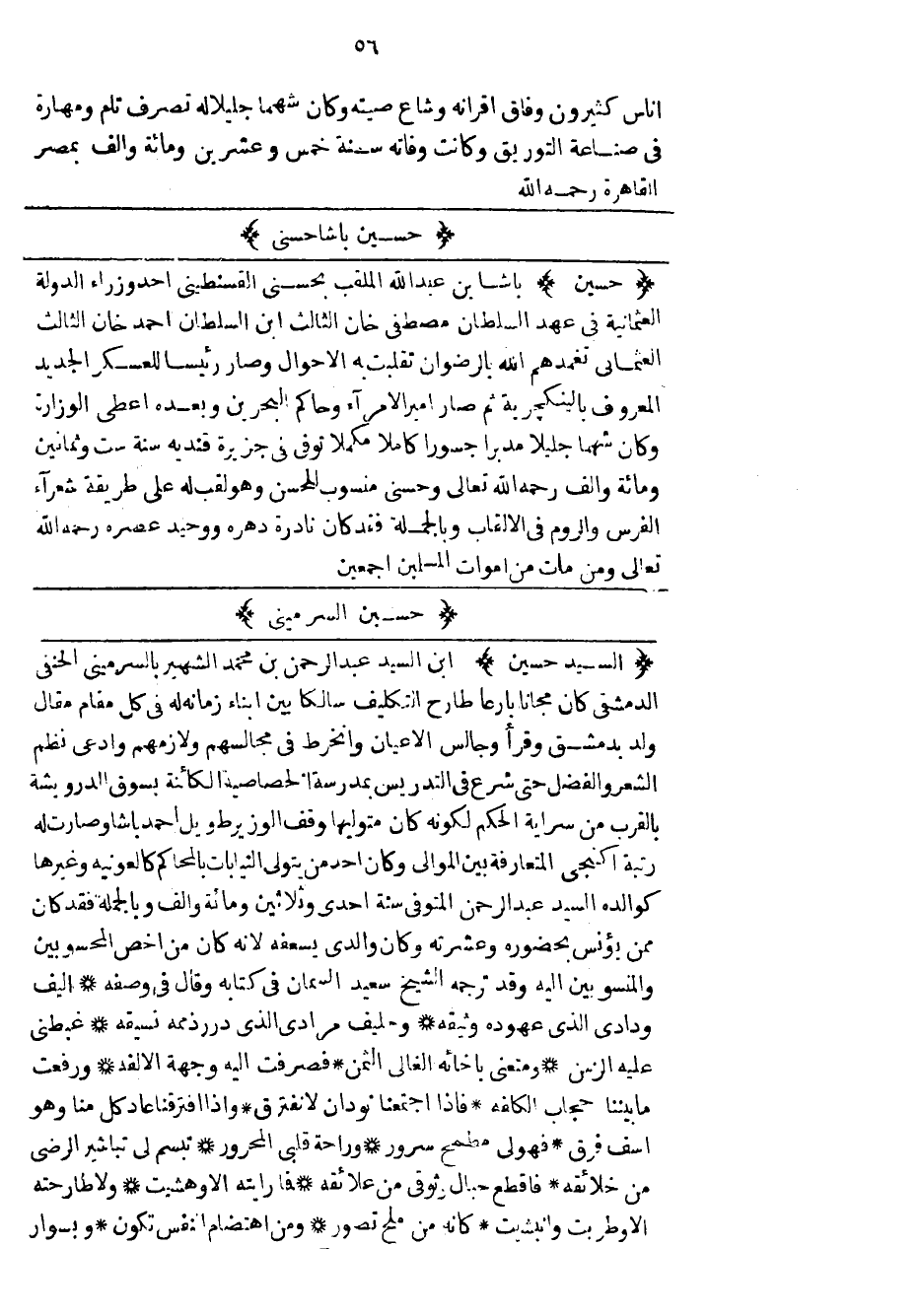 حسين باشا بن عبد الله الملقب بحسني القسنطيني أحد وزراء الدولة العثمانية في عهد السلطان مصطفى خان الثالث ابن السلطان أحمد خان الثالث العثماني تغمدهم الله بالرضوان تقلبت به الأحوال وصار رئيساً للعسكر الجديد المعروف بالينكجرية ثم صار أمير الأمراء وحاكم البحرين وبعده أعطى الوزارة وكان شهماً جليلاً مدبراً جسوراً كاملاً مكملاً توفي في جزيرة قندية سنة ست وثمانين ومائة وألف رحمه الله تعالى وحسني منسوب للمحسن وهو لقب له على طريقة شعراء الفرس والروم في الألقاب وبالجملة فقد كان نادرة دهره ووحيد عصره رحمه الله تعالى ومن مات من أموات المسلمين أجمعين.