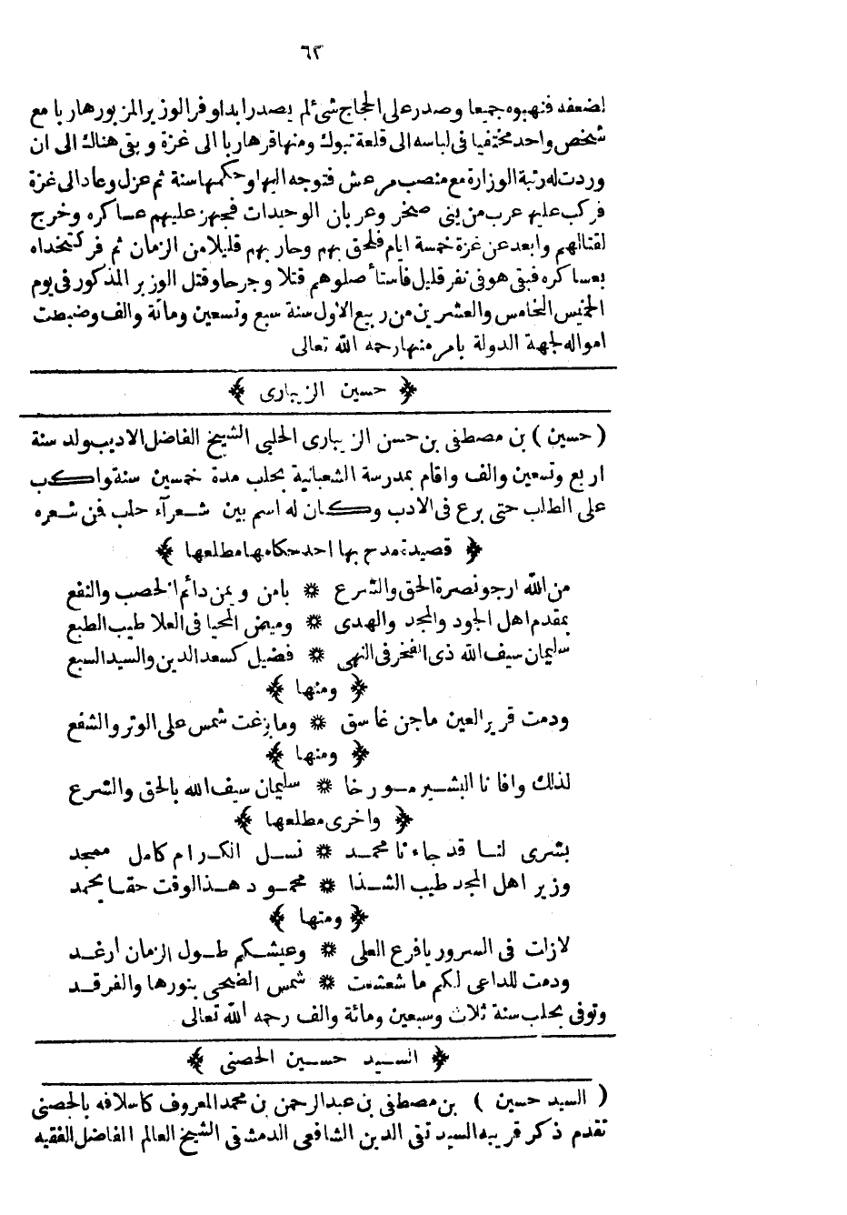 حسين بن مصطفى بن حسن الزيباري الحلبي الشيخ الفاضل الأديب ولد سنة أربع وتسعين وألف وأقام بمدرسة الشعبانية بحلب مدة خمسين سنة وأكب على الطلب حتى برع في الأدب وكان له اسم بين شعراء حلب فمن شعره قصيدة مدح بها أحد حكامها مطلعها