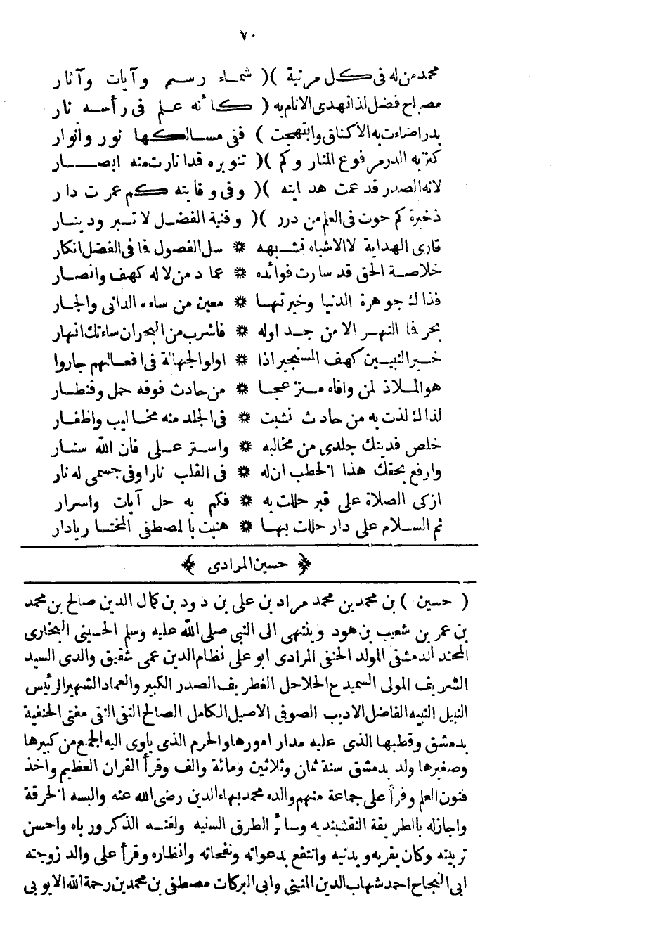 حسين بن محمد بن محمد مراد بن علي بن دود بن كمال الدين صالح بن محمد بن عمر بن شعيب بن هود وينتهي إلى النبي صلى الله عليه وسلم الحسيني البخاري المحتد الدمشقي المولد الحنفي المرادي أبو علي نظام الدين عمي شقيق والدي السيد الشريف المولى السميدع الحلاحل الغطريف الصدر الكبير والعماد الشهير الرئيس النبيل النبيه الفاضل الأديب الصوفي الأصيل الكامل الصالح التقي النقي مفتي الحنفية بدمشق وقطبها الذي عليه مدار أمورها والحرم الذي يأوي إليه الجمع من كبيرها وصغيرها ولد بدمشق سنة ثمان وثلاثين ومائة وألف وقرأ القرآن العظيم وأخذ فنون العلم وقرأ على جماعة منهم والده محمد بهاء الدين رضي الله عنه وألبسه الخرقة وأجاز له بالطريقة النقشبندية وسائر الطرق السنية ولقنه الذكر ورباه وأحسن تربيته وكان يقربه ويدنيه وأنتفع بدعواته ونفحاته وأنظاره وقرأ على والد زوجته أبي النجاح أحمد شهاب الدين المنيني وأبي البركات مصطفى بن محمد بن رحمة الله الأيوبي