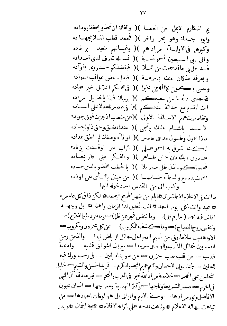 ما أنت في الأعلام الأعاشر الأيام من شهر الحجيج فيحمد لكن ذاقي كل عام مرة عيد وأنت بكل يوم أحمد أنت الخليل لذا الزمان وأهله بل وجهه اذ أنت فيه محمد ما رقم قلم وما تنفس فجر عن ظلم وما غرد طير الفلاح وتنفس روح الصباح وما كشف الكروب عن كل محزون ومكروب الا وأهديت سلاماً أرق من نسيم الصبا على خمائل الرياض أبدا وألذ من زمن الصبا بين شمائل المآرب والوصال سرمداً مع بث أشواق قلبيه وأدعية قدسيه من قلب صب حزين عن سويداه بأنين في رحب بورك فيه للعالمين لجناب ولي الاحسان والنعم عميم المجد والكرم فريد الحسن والشيم خليل المحاسن على الهمم خلاصة مراد الله خيراً في العرب والعجم نور صدقة آل النبي في الحرم صدر الشريعة وتاجها وكنز الهداية ومعراجها انسان عيون الأفاضل ونور مرادها وحسنة الأيام والليالي بل هو أوقات أعيادها من تباهت ببهائه الأعلام وتاهت بمدحه على أترابه الأقلام بهجة الجمال وبدر