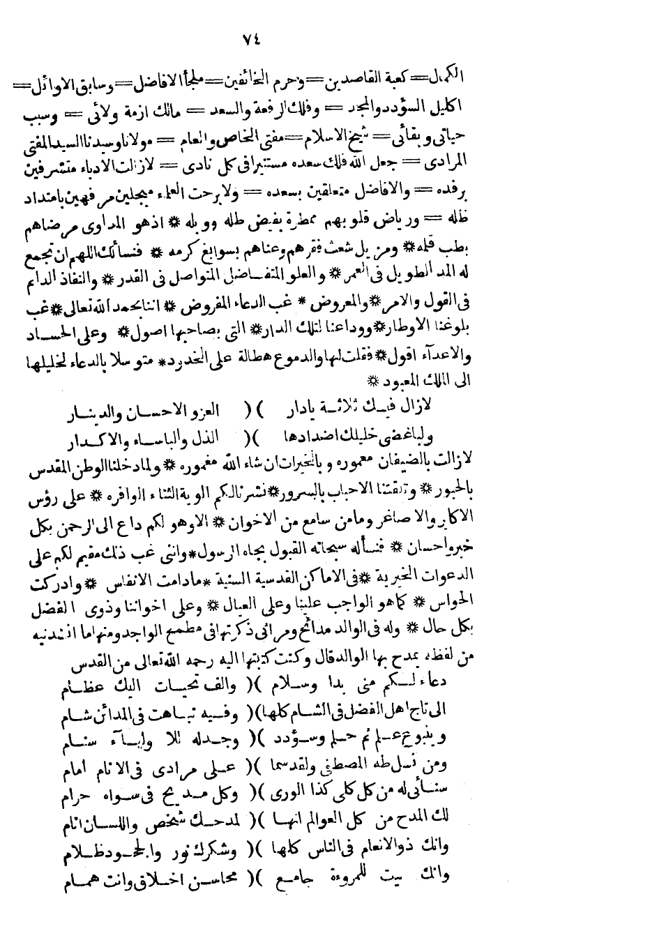 لا زالت بالضيفان معموره وبالخيرات ان شاء الله مغموره ولما دخلنا الوطن المقدس بالحبور وتلقتنا الأحباب بالسرور نشرنا لكم ألوية الثناء الوافرة على رؤس الأكابر والأصاغر وما من سامع من الأخوان الا وهو لكم داع إلى الرحمن بكل خير واحسان فنسأله سبحانه القبول بجاه الرسول وانني غب ذلك مقيم لكم على الدعوات الخيرية في الأماكن القدسية السنية ما دامت الأنفاس وأدركت الحواس كما هو الواجب علينا وعلى العيال وعلى اخواننا وذوي الفضل بكل حال وله في الوالد مدائح ومرائي ذكرتها في مطمح الواجد ومنها ما أنشدنيه من لفظه يمدح بها الوالد قال وكنت كتبتها إليه رحمه الله تعالى من القدس