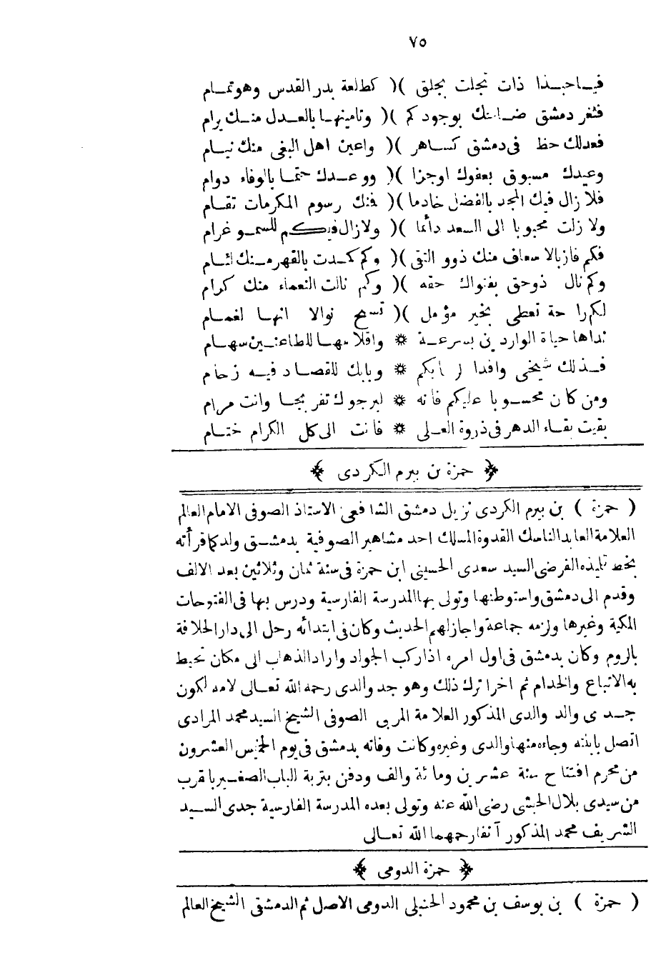 حمزة بن بيرم الكردي نزيل دمشق الشافعي الاستاذ الصوفي الامام العالم العلامة العابد الناسك القدوة المسلك أحد مشاهير الصوفية بدمشق ولد كما قرأته بخط تلميذه الفرضي السيد سعدي الحسيني ابن حمزة في سنة ثمان وثلاثين بعد الألف وقدم إلى دمشق واستطونها وتولى بها المدرسة الفارسية ودرس بها في الفتوحات المكية وغيرها ولزمه جماعة وأجاز لهم الحديث وكان في ابتدائه رحل إلى دار الخلافة بالروم وكان بدمشق في أول أمره إذا ركب الجواد وأراد الذهاب إلى مكان تحيط به الأتباع والخدام ثم أخراً ترك ذلك وهو جد والدي رحمه الله تعالى لأمه لكون جدي والد والدي المذكور العلامة المربي الصوفي الشيخ السيد محمد المرادي اتصل بابنته وجاءه منها والدي وغيره وكأنت وفاته بدمشق في يوم الخميس العشرون من محرم افتتاح سنة عشرين ومائة وألف ودفن بتربة الباب الصغير بالقرب من سيدي بلال الحبشي رضي الله عنه وتولى بعده المدرسة الفارسية جدي السيد الشريف محمد المذكور آنفاً رحمهما الله تعالى.
