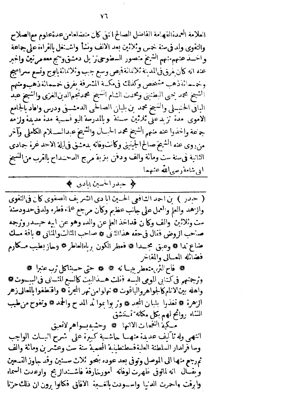 حيدر بن أحمد الشافعي الحسين أبادي الشريف الصفوي كان في التقوى والزهد والعلم والعمل على جانب عظيم وكان مرجع علماء قطره ولد في حدود سنة ست وثلاثين وألف وكان قد أخذ العلم عن والده وهو عن أبيه حيدر وترجمه صاحب الروض فقال في حقه هذا الثاني صاحب المثالث والمثاني باقة مسك ضاع ندا وعبق مجداً فعطر الكون برياه العاطر وحاز بطيب مكارم فضائله المعالي والمفاخر.