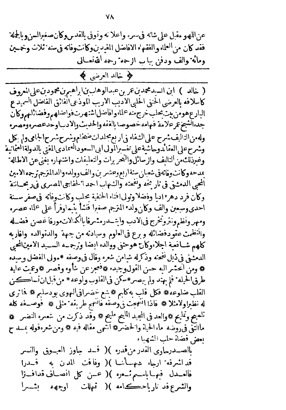 خالد ابن السيد محمد بن عمر بن عبد الوهاب بن إبراهيم بن محمود بن علي المعروف كأسلافه بالعرضي الحنفي الحلبي الأديب الأريب اللوذعي الفائق الفاضل السميدع البارع هو من بيت بحلب خرج منه علماء وأفاضل اشتهرت فواضلهم وفضائلهم وكان جده الشيخ عمر علامة فهامه خصوصياً بالفقه والحديث والأدب أوحد عصره ومصره وله من التأليف شرح على الشفاء في أربع مجلدات ضخام وشرح شرح الجامي ولم بكل وشرح على العقائد وحاشية على تفسير المولى أبي السعود العمادي المفتي بالدولة العثمانية وغير ذلك من التآليف والرسائل والتحريرات والتعليقات واشتهاره يغني عن الاطالة بمدحه وكأنت وفاته في شعبان سنة أربع وعشرين وألف وولده والد المترجم ترجمه الأمين المحبي الدمشقي في تاريخه ونفحته والشهاب أحمد الخفاجي المصري في ريحأنته وكان فرد دهره أدباً وفضلاً وتولى افتاء الحنفية بحلب وكأنت وفاته في صفر سنة احدى وسبعين وألف وكان ولده المترجم صغيراً فنشأ يتيماً وقرأ على علماء عصره ومهر ونظم ونثر وتخرج في الأدب وابتدر مشرقاً بالكمالات مورقاً غصن فضله وأنتظمت عقود فضائله وبرع في العلوم وسيادته من جهة والدة والده وأقاربه كلهم شافعية أجلاء وكان هو حنفي ووالده أيضاً وترجمه السيد الأمين المحبي الدمشقي في ذيل نفحته وذكر له شيأً من شعره وقال في وصفه مولى الفضل وسيده ومن انحشر إليه حسن القول وجيده فعجز عن شأوه وقصر وعميت عليه طرق الحيلة فلم يهتد ولم يبصر سكن في القلوب ولوعه من قبل أن تساكن القلب ضلوعه فكل قلب به كليم يتبع خضراً في الهوى بود سليم فما ترى له نظيراً ولا مثلاً فإذا أنتهجت في وصفه فأنتهج طريقة مثلي فوصفه كله تلميح وتمليح والعد في المجيد المليح مليح وقد ذكرت من شعره النضر ما التقى في روضه ماء الحياة والخضر أنتهى مقاله فيه ومن شعره قوله يمدح بعض قضاة حلب الشهباء