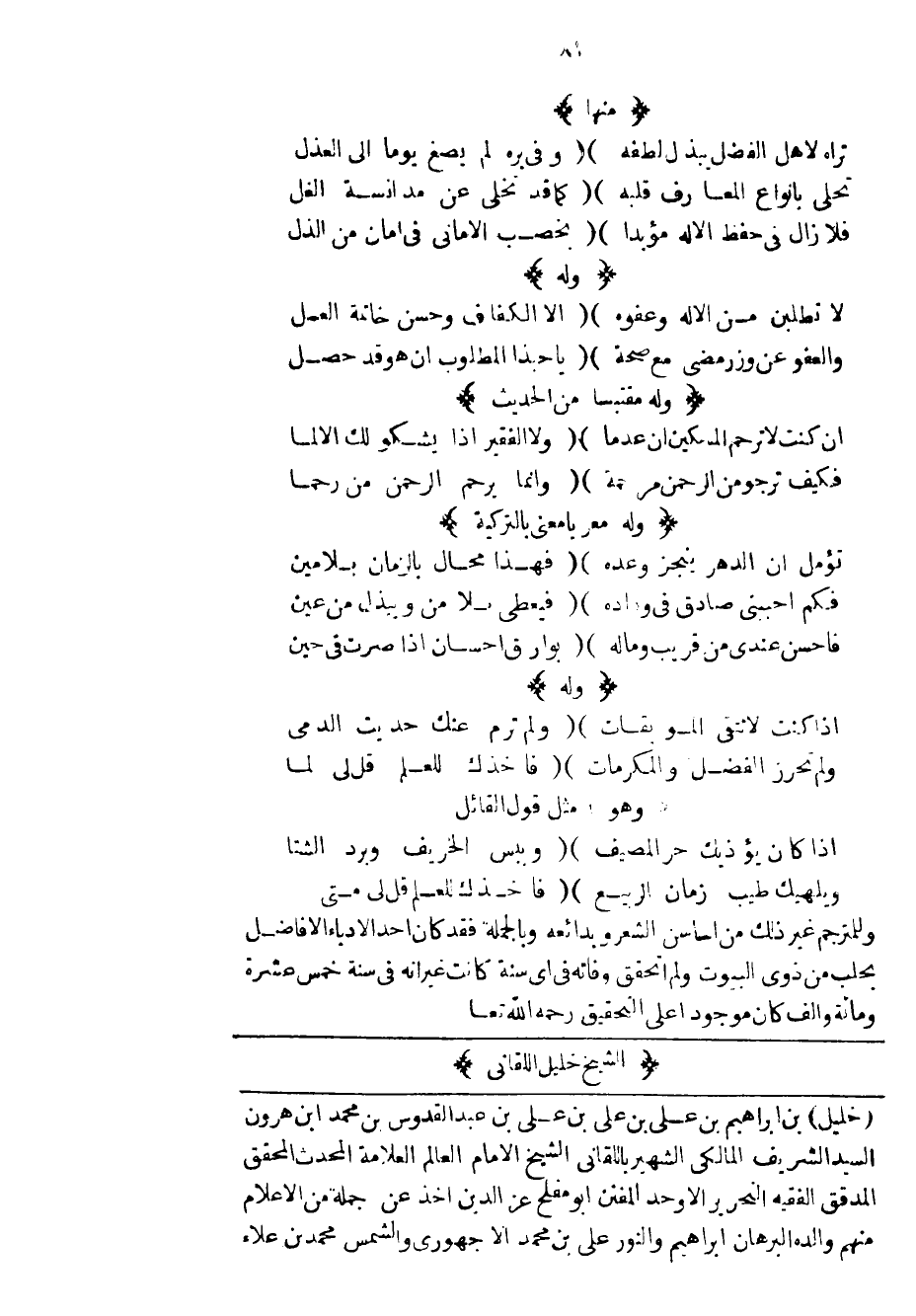 خليل بن إبراهيم بن علي بن علي بن عبد القدوس بن محمد ابن هرون السيد الشريف المالكي الشهير باللقاني الشيخ الامام العالم العلامة المحدث المحقق المدقق الفقيه التحرير الأوحد المفنن أبو مفلح عز الدين أخذ عن جملة من الأعلام منهم والده البرهان إبراهيم والنور علي بن محمد الأجهوري والشمس محمد بن علاء
