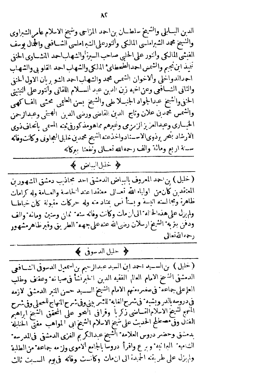 خليل بن السيد أحمد ابن لاسيد عبد الرحيم بن إسماعيل الدسوقي الشافعي الدمشقي الشيخ الامام العالم الفقيه الدين الخير نشأ في صيانة وعفاف وطلب العلم على جماعة في صغره منهم الامام الشيخ السيد حسن المنير الدمشقي لازمه في دروسه بالدرويشية في شرح الغاية للشربيني وفي شرح المنهاج للمحلي وفي شرح المنهج لشيخ الاسلام القاضي زكريا وقرأ في النحو على المحقق الشيخ إبراهيم الفتال وفي مصطلح الحديث على شيخ الاسلام الشيخ أبي المواهب مفتي الحنابلة بدمشق وحضر دروس العلامة الشيخ عبد الكريم الغزي الدمشقي في المدرسة الشامية البرانية وبرع واقرأ دروساً بالجامع الأموي ولزمه جماعة من الطلبة ولم يزل على طريقته الحميدة إلى أن مات وكأنت وفاته يوم السبت ثالث