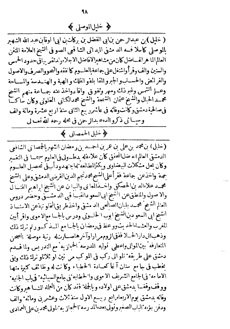 خليل بن عبد الرحمن بن أبي الفضل بن بركات بن أبي الوفا بن عبد الله الشهير بالموصلي كأسلافه الدمشقي الميداني الشافعي الصوفي الشيخ العلامة المتقن العالم الماهر الفاضل كان من مشاهير الأفاضل الأجلاء ولد تقريباً في حدود الخمس والستين وألف وقرأ واشتغل على جماعة بالعلوم كالفقه والنحو والصرف والأصول والفرائض والحساب والجبر والمقابلة والفلك والهية والهندسة والمساحة وعلم الشمس وغير ذلك ومهر وتفوق وأفاد وأخذ عنه جماعة منهم الشيخ محمد الحبال والشيخ عثمان الشمعة والشيخ محمد الكناني الخلوتي وكان ساكناً في صالحية دمشق وكأنت وفاته في عاشر ربيع الثاني سنة أربع عشرة ومائة وألف وسيأتي ذكر والده عبد الرحمن في محله رحمه الله تعالى.