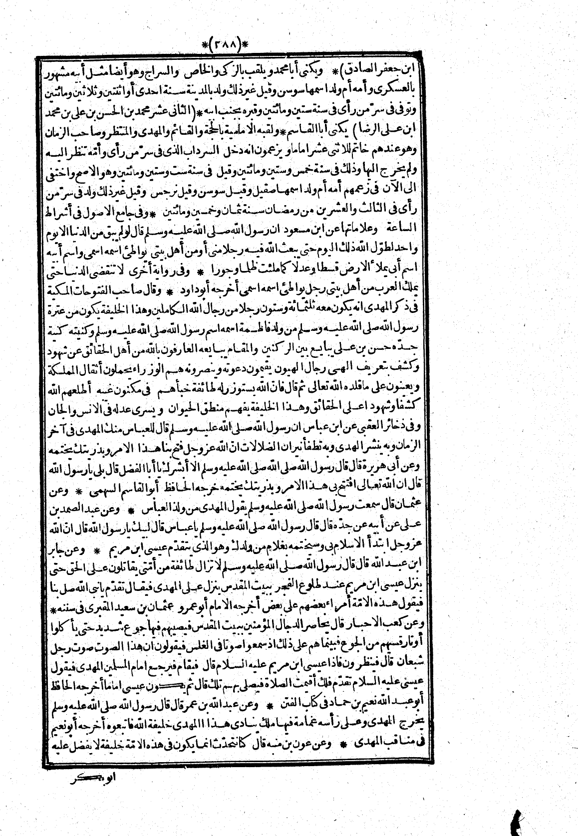 ابن جعفر الصادق) * ويكنى أبا محمد ويلقب بالزكى والخاص والسراج وهو أيضا مثل أبيه مشهور بالعسكرى وأمه أم ولد اسمها سوسن وقيل غير ذلك ولد بالمدينة سنة احدى أو اثنتين وثلاثين ومائتين وتوفى فى سرّ من رأى فى سنة ستين ومائتين وقبره بجنب ابيه* (الثانى عشر محمد بن الحسن بن على بن محمد ابن على الرضا) يكنى أبا القاسم* ولقبه الامامية بالحجة والقائم والمهدى والمنتظر وصاحب الزمان وهو عندهم خاتم للاثنى عشر اماما ويزعمون انه دخل السرداب الذى فى سرّ من رأى وأمّه تنظر اليه ولم يخرج اليها وذلك فى سنة خمس وستين ومائتين وقيل فى سنة ست وستين ومائتين وهو الاصح واختفى الى الان فى زعمهم أمه أم ولد اسمها صقيل وقيل سوسن وقيل نرجس وقيل غير ذلك ولد فى سرّ من رأى فى الثالث والعشرين من رمضان سنة ثمان وخمسين ومائتين* وفى جامع الاصول فى أشراط الساعة وعلاماتها عن ابن مسعود ان رسول الله صلى الله عليه وسلم قال لو لم يبق من الدنيا الا يوم واحد لطوّل الله ذلك اليوم حتى يبعث الله فيه رجلا منى أو من أهل بيتى يواطئ اسمه اسمى واسم أبيه اسم أبى يملأ الارض قسطا وعدلا كما ملئت ظلما وجورا* وفى رواية أخرى لا تنقضى الدنيا حتى يملك العرب من أهل بيتى رجل يواطئ اسمه اسمى أخرجه أبو داود* وقال صاحب الفتوحات المكية فى ذكر المهدى انه يكون معه ثلثمائة وستون رجلا من رجال الله الكاملين وهذا الخليفة يكون من عترة رسول الله صلى الله عليه وسلم من ولد فاطمة اسمه اسم رسول الله صلى الله عليه وسلم وكنيته كنية جدّه حسن بن على يبايع بين الركنين والمقام يبايعه العارفون بالله من أهل الحقائق عن شهود وكشف بتعريف الهى رجال الهيون يقيمون دعوته وينصرونه هم الوزراء يحملون أثقال المملكة ويعينون على ما قلده الله تعالى ثم قال فانّ الله يستوزر له طائفة خبأهم فى مكنون غيبه أطلعهم الله كشفا وشهودا على الحقائق وهذا الخليفة يفهم منطق الحيوان ويسرى عدله فى الانس والجان وفى ذخائر العقبى عن ابن عباس ان رسول الله صلى الله عليه وسلم قال للعباس منك المهدى فى آخر الزمان وبه ينشر الهدى وبه تطفأ نيران الضلالات انّ الله عز وجل فتح بنا هذا الامر وبذريتك يختمه وعن أبى هريرة قال قال رسول الله صلى الله صلى الله عليه وسلم الا أبشرك يا أبا الفضل قال بلى يا رسول الله قال ان الله تعالى افتتح بى هذا الامر وبذريتك يختمه خرجه الحافظ أبو القاسم السهمى* وعن عثمان قال سمعت رسول الله صلى الله عليه وسلم يقول المهدى من ولد العباس* وعن عبد الصمد بن على عن أبيه عن جدّه قال قال رسول الله صلى الله عليه وسلم يا عباس قال لبيك يا رسول الله قال انّ الله عز وجل ابتدأ الاسلام بى وسيختمه بغلام من ولدك وهو الذى يتقدّم عيسى ابن مريم* وعن جابر ابن عبد الله قال قال رسول الله صلى الله عليه وسلم لا تزال طائفة من أمّتى يقاتلون على الحق حتى ينزل عيسى ابن مريم عند طلوع الفجر ببيت المقدس ينزل على المهدى فيقال تقدّم يا نبى الله صل بنا فيقول هذه الامّة أمراء بعضهم على بعض أخرجه الامام أبو عمرو عثمان بن سعيد المقبرى فى سننه* وعن كعب الاحبار قال يحاصر الدجال المؤمنين ببيت المقدس فيصيبهم فيها جوع شديد حتى يأكلوا أوتار قسيهم من الجوع فبينماهم على ذلك اذ سمعوا صوتا فى الغلس فيقولون ان هذا الصوت صوت رجل شبعان قال فينظرون فاذا عيسى ابن مريم عليه السلام قال فيقام فيرجع امام المسلمين المهدى فيقول عيسى عليه السلام تقدّم فلك أقيمت الصلاة فيصلى بهم تلك قال ثم يكون عيسى اماما أخرجه الحافظ أبو عبد الله نعيم بن حماد فى كتاب الفتن* وعن عبد الله بن عمر قال قال رسول الله صلى الله عليه وسلم يخرج المهدى وعلى رأسه غمامة فيها ملك ينادى هذا المهدى خليفة الله فاتبعوه أخرجه أبو نعيم فى مناقب المهدى* وعن عون بن منبه قال كنا نتحدّث انما يكون فى هذه الامّة خليفة لا