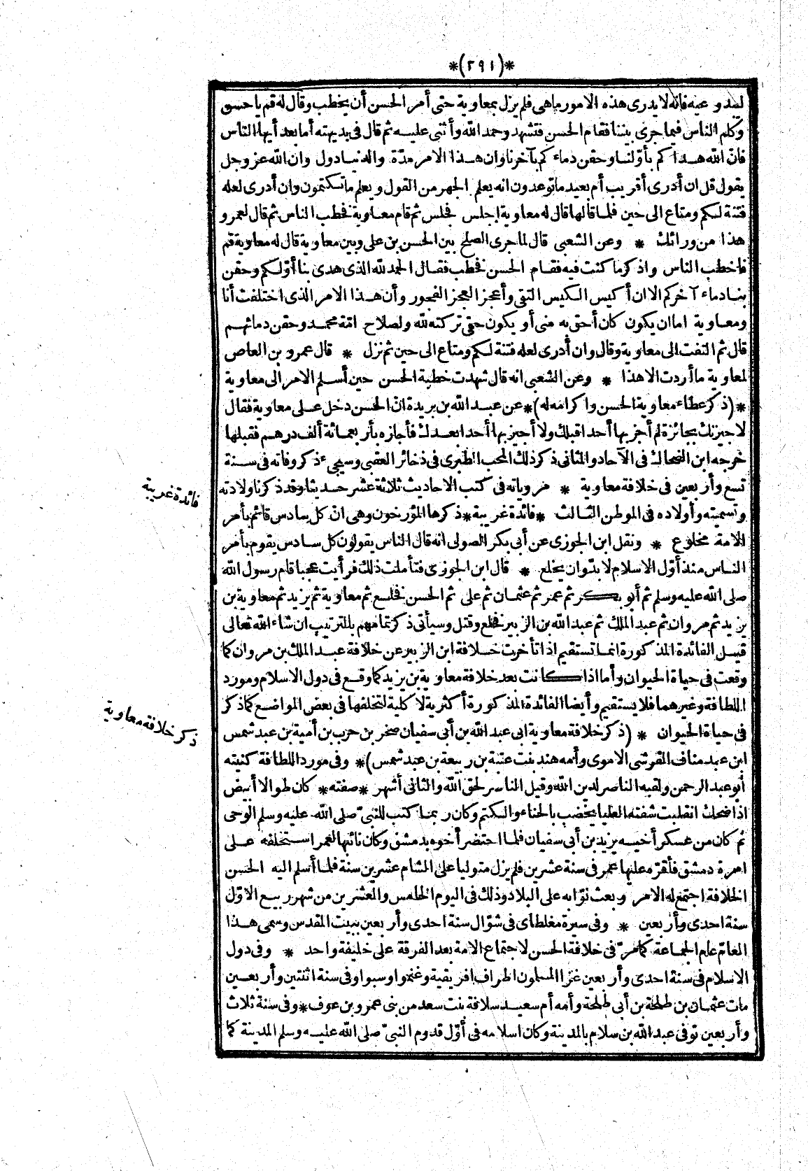 * ذكرها المؤرخون وهى انّ كل سادس قائم بأمر الامة مخلوع* ونقل ابن الجوزى عن أبى بكر الصولى انه قال الناس يقولون كل سادس يقوم بأمر الناس منذ أوّل الاسلام لا بد وان يخلع* قال ابن الجوزى فتأملت ذلك فرأيت عجبا قام رسول الله صلى الله عليه وسلم ثم أبو بكر ثم عمر ثم عثمان ثم على ثم الحسن فخلع ثم معاوية ثم يزيد ثم معاوية بن يزيد ثم مروان ثم عبد الملك ثم عبد الله بن الزبير فخلع وقتل وسيأتى ذكر تمامهم بالترتيب ان شاء الله تعالى قيل الفائدة المذكورة انما تستقيم اذا تأخرت خلافة ابن الزبير عن خلافة عبد الملك بن مروان كما وقعت فى حياة الحيوان وأما اذا كانت بعد خلافة معاوية بن يزيد كما وقع فى دول الاسلام ومورد اللطافة وغيرهما فلا يستقيم وأيضا الفائدة المذكورة أكثرية لا كلية لتخلفها فى بعض المواضع كما ذكر فى حياة الحيوان*