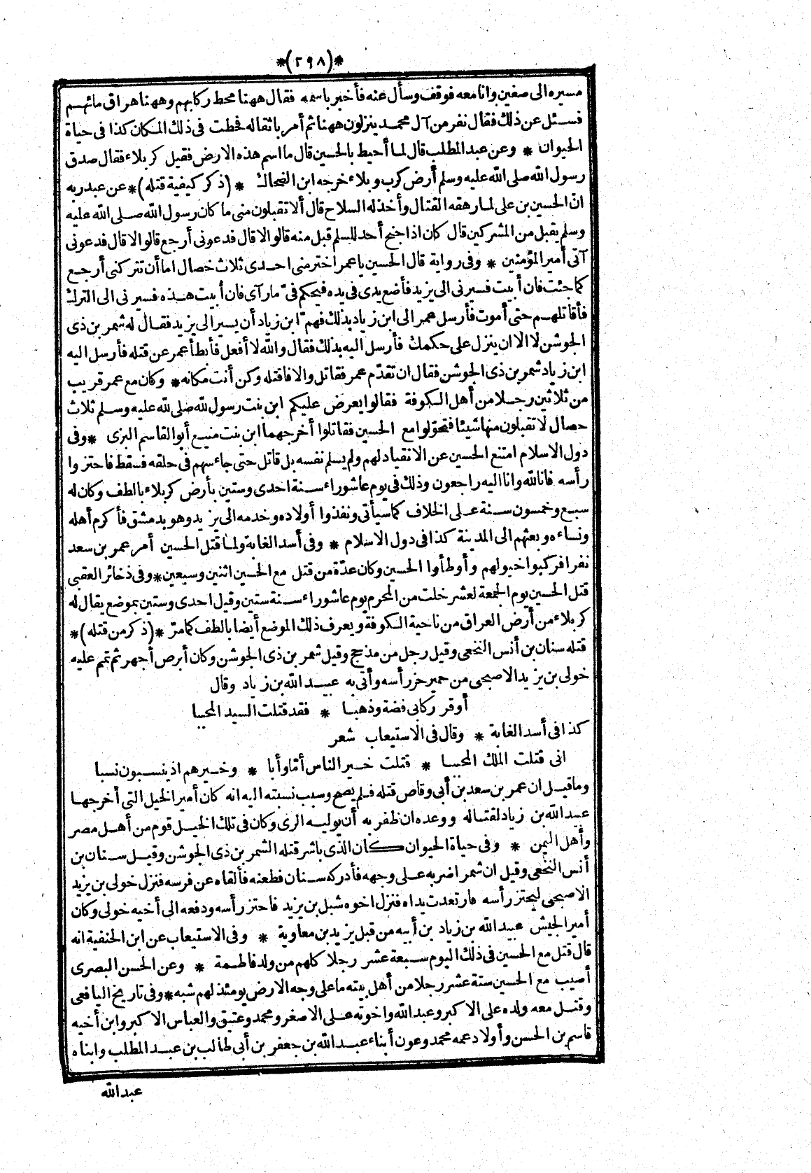 مسيره الى صفين وانا معه فوقف وسأل عنه فأخبر باسمه فقال ههنا محط ركابهم وههنا هراق مائهم فسئل عن ذلك فقال نفر من آل محمد ينزلون ههنا ثم أمر باثقاله فحطت فى ذلك المكان كذا فى حياة الحيوان* وعن عبد المطلب قال لما أحيط بالحسين قال ما اسم هذه الارض فقيل كربلاء فقال صدق رسول الله صلى الله عليه وسلم أرض كرب وبلاء خرجه ابن الضحاك* (ذكر كيفية قتله) * عن عبد ربه انّ الحسين بن على لما رهقه القتال وأخذ له السلاح قال ألا تقبلون منى ما كان رسول الله صلى الله عليه وسلم يقبل من المشركين قال كان اذا جنح أحد للسلم قبل منه قالوا لا قال فدعونى أرجع قالوا لا قال فدعونى آتى أمير المؤمنين* وفى رواية قال الحسين يا عمر اختر منى احدى ثلاث خصال اما أن تتركنى أرجع كما جئت فان أبيت فسيرنى الى يزيد فأضع يدى فى يده فيحكم فىّ ما رآى فان أبيت هذه فسيرنى الى الترك فأقاتلهم حتى أموت فأرسل عمر الى ابن زياد بذلك فهمّ ابن زياد أن يسير الى يزيد فقال له شمر بن ذى الجوشن لا الا ان ينزل على حكمك فأرسل اليه بذلك فقال والله لا أفعل فأبطأ عمر عن قتله فأرسل اليه ابن زياد شمر بن ذى الجوشن فقال ان تقدّم عمر فقاتل والا فاقتله وكن أنت مكانه* وكان مع عمر قريب من ثلاثين رجلا من أهل الكوفة فقالوا يعرض عليكم ابن بنت رسول لله صلى الله عليه وسلم ثلاث حصال لا تقبلون منها شيئا فتحوّلوا مع الحسين فقاتلوا أخرجهما ابن بنت منيع أبو القاسم البزى* وفى دول الاسلام امتنع الحسين عن الانقياد لهم ولم يسلم نفسه بل قاتل حتى جاء سهم فى حلقه فسقط فاحتزوا رأسه فانا لله وانا اليه راجعون وذلك فى يوم عاشوراء سنة احدى وستين بأرض كربلاء بالطف وكان له سبع وخمسون سنة على الخلاف كما سيأتى ونفذوا أولاده وخدمه الى يزيد وهو بدمشق فأكرم أهله ونساءه وبعثهم الى المدينة كذا فى دول الاسلام* وفى أسد الغابة ولما قتل الحسين أمر عمر بن سعد نفرا فركبوا خيولهم وأوطأوا الحسين وكان عدّة من قتل مع الحسين اثنين وسبعين* وفى ذخائر العقبى قتل الحسين يوم الجمعة لعشر خلت من المحرم يوم عاشوراء سنة ستين وقيل احدى وستين بموضع يقال له كربلاء من أرض العراق من ناحية الكوفة ويعرف ذلك الموضع أيضا بالطف كما مرّ* (ذكر من قتله) * قتله سنان بن أنس النخعى وقيل رجل من مذحج وقيل شمر بن ذى الجوشن وكان أبرص أجهر ثم تمم عليه خولى بن يزيد الاصبحى من حمير حز رأسه وأتى به عبيد الله بن زياد وقال