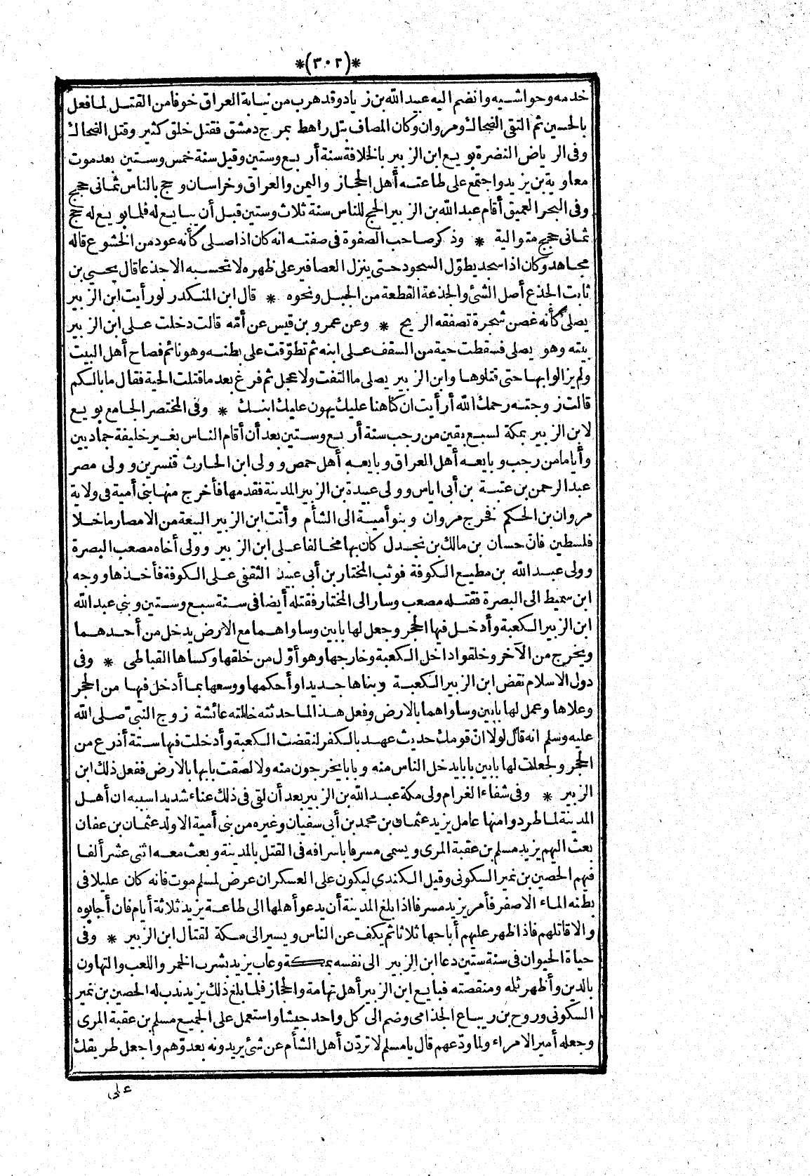 خدمه وحواشيه وانضم اليه عبيد الله بن زياد وقد هرب من نيابة العراق خوفا من القتل لما فعل بالحسين ثم التقى الضحاك ومروان وكان المصاف بتل راهط بمرج دمشق فقتل خلق كثير وقتل الضحاك وفى الرياض النضرة بويع ابن الزبير بالخلافة سنة أربع وستين وقيل سنة خمس وستين بعد موت معاوية بن يزيد واجتمع على طاعته أهل الحجاز واليمن والعراق وخراسان وحج بالناس ثمانى حجج وفى البحر العميق أقام عبد الله بن الزبير الحج للناس سنة ثلاث وستين قبل أن يبايع له فلما بويع له حج ثمانى حجج متوالية* وذكر صاحب الصفوة فى صفته انه كان اذا صلى كأنه عود من الخشوع قاله مجاهد وكان اذا سجد يطوّل السجود حتى ينزل العصافير على ظهره لا تحسبه الا جذعا قال يحيى بن ثابت الجذع أصل الشىء والجذعة القطعة من الجبل ونحوه* قال ابن المنكدر لو رأيت ابن الزبير يصلى كأنه غصن شجرة تصفقه الريح* وعن عمرو بن قيس عن أمّه قالت دخلت على ابن الزبير بيته وهو يصلى فسقطت حية من السقف على ابنه ثم تطوّقت على بطنه وهو نائم فصاح أهل البيت ولم يزالوا بها حتى قتلوها وابن الزبير يصلى ما التفت ولا عجل ثم فرغ بعد ما قتلت الحية فقال ما بالكم قالت زوجته رحمك الله أرأيت ان كنا هنا عليك يهون عليك ابنك* وفى المختصر الجامع بويع لابن الزبير بمكة لسبع بقين من رجب سنة أربع وستين بعد أن أقام الناس بغير خليفة جماديين وأياما من رجب وبايعه أهل العراق وبايعه أهل حمص وولى ابن الحارث قنسرين وولى مصر عبد الرحمن بن عتبة بن أبى اياس وولى عبيدة بن الزبير المدينة فقدمها فأخرج منها بنى أمية فى ولاية مروان بن الحكم فخرج مروان وبنو أمية الى الشأم وأتت ابن الزبير البيعة من الامصار ما خلا فلسطين فانّ حسان بن مالك بن نجدل كان بها مخالفا على ابن الزبير وولى أخاه مصعب البصرة وولى عبد الله بن مطيع الكوفة فوثب المختار بن أبى عبيد الثقفى على الكوفة فأخذها ووجه ابن سميط الى البصرة فقتله مصعب وسار الى المختار فقتله أيضا فى سنة سبع وستين وبنى عبد الله ابن الزبير الكعبة وأدخل فيها الحجر وجعل لها بابين وساواهما مع الارض يدخل من أحدهما ويخرج من الاخر وخلقوا داخل الكعبة وخارجها وهو أوّل من خلقها وكساها القباطى* وفى دول الاسلام نقض ابن الزبير الكعبة وبناها جديدا وأحكمها ووسعها بما أدخل فيها من الحجر وعلاها وعمل لها بابين وساواهما بالارض وفعل هذا لما حدثته خالته عائشة زوج النبىّ صلى الله عليه وسلم انه قال لولا انّ قومك حديث عهد بالكفر لنقضت الكعبة وأدخلت فيها ستة أذرع من الحجر ولجعلت لها بابين بابا يدخل الناس منه وبابا يخرجون منه ولا لصقت بابها بالارض ففعل ذلك ابن الزبير* وفى شفاء الغرام ولى مكة عبد الله بن الزبير بعد أن لقى فى ذلك عناء شديدا سببه ان أهل المدينة لما طردوا منها عامل يزيد عثمان بن محمد بن أبى سفيان وغيره من بنى أمية الا ولد عثمان بن عفان بعث اليهم يزيد مسلم بن عقبة المرى ويسمى مسرفا باسرافه فى القتل بالمدينة وبعث معه اثنى عشر ألفا فيهم الحصين بن نمير السكونى وقيل الكندى ليكون على العسكران عرض لمسلم موت فانه كان عليلا فى بطنه الماء الاصفر فأمر يزيد مسرفا اذا بلغ المدينة أن يدعو أهلها الى طاعة يزيد ثلاثة أيام فان أجابوه والا قاتلهم فاذا ظهر عليهم أباحها ثلاثا ثم يكف عن الناس ويسير الى مكة لقتال ابن الزبير* وفى حياة الحيوان فى سنة ستين دعا ابن الزبير الى نفسه بمكة وعاب يزيد بشرب الخمر واللعب والتهاون بالدين وأظهر ثلمه ومنقصته فبايع ابن الزبير أهل تهامة والحجاز فلما بلغ ذلك يزيد ندب له الحصين بن نمير السكونى وروح بن ريباع الجذامى وضم الى كل واحد جيشا واستعمل على الجميع مسلم بن عقبة المرى وجعله أمير الامراء ولما ودّعهم قال يا مسلم لا تردّن أهل الشأم عن شئ يريدونه بعدوّهم واجعل طريقك