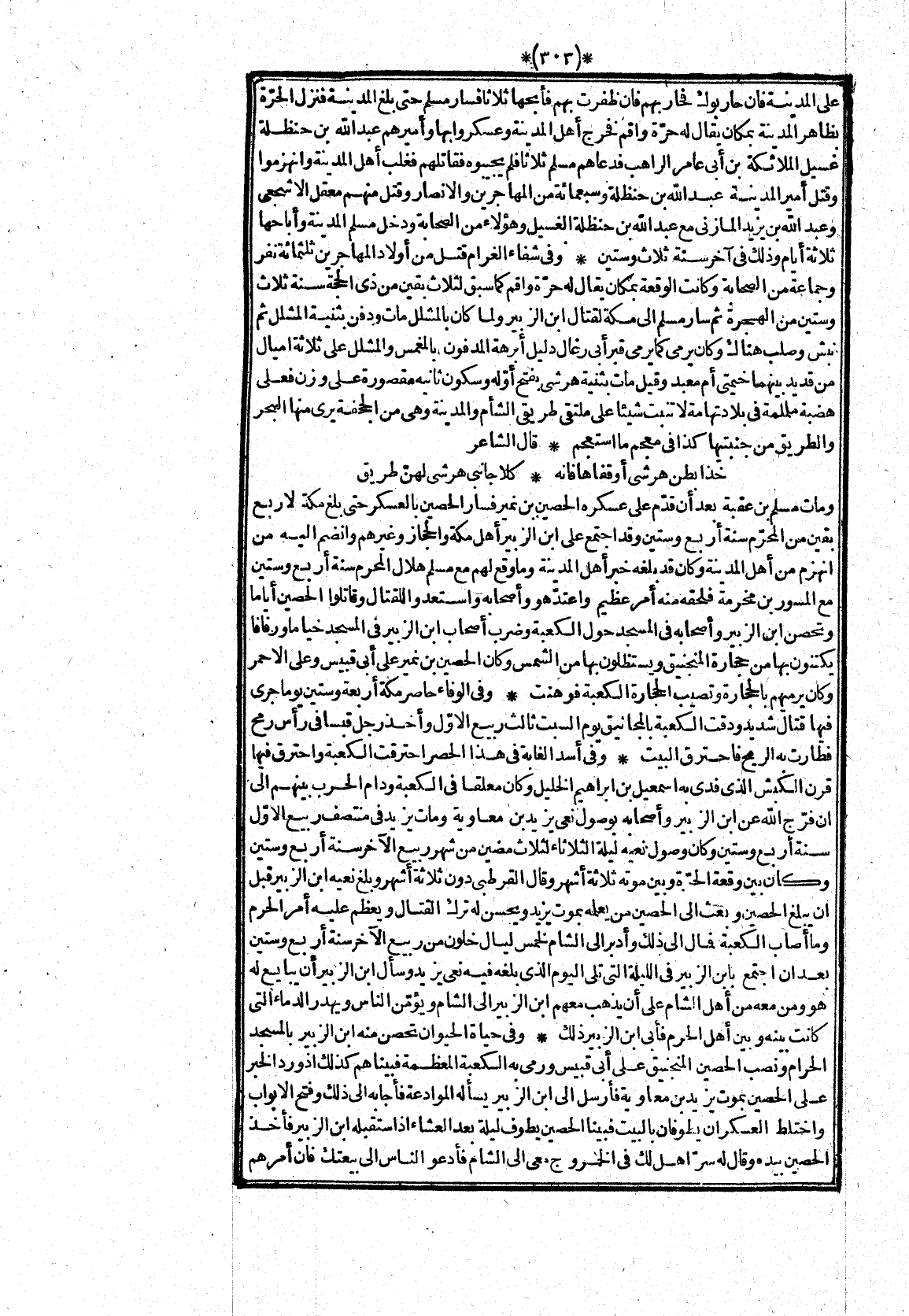على المدينة فان حاربوك فحاربهم فان ظفرت بهم فأبحها ثلاثا فسار مسلم حتى بلغ المدينة فنزل الحرّة بظاهر المدينة بمكان يقال له حرّة واقم فخرج أهل المدينة وعسكروا بها وأميرهم عبد الله بن حنظلة غسيل الملائكة بن أبى عامر الراهب فدعاهم مسلم ثلاثا فلم يجيبوه فقاتلهم فغلب أهل المدينة وانهزموا وقتل أمير المدينة عبد الله بن حنظلة وسبعمائة من المهاجرين والانصار وقتل منهم معقل الاشجعى وعبد الله بن يزيد المازنى مع عبد الله بن حنظلة الغسيل وهؤلاء من الصحابة ودخل مسلم المدينة وأباحها ثلاثة أيام وذلك فى آخر سنة ثلاث وستين* وفى شفاء الغرام قتل من أولاد المهاجرين ثلثمائة نفر وجماعة من الصحابة وكانت الوقعة بمكان يقال له حرّة واقم كما سبق لثلاث بقين من ذى الحجة سنة ثلاث وستين من الهجرة ثم سار مسلم الى مكة لقتال ابن الزبير ولما كان بالمشلل مات ودفن بثنية المشلل ثم نبش وصلب هناك وكان يرمى كما يرمى قبر أبى رغال دليل أبرهة المدفون بالمغمس والمشلل على ثلاثة اميال من قديد بينهما خيمتى أم معبد وقيل مات بثنية هرشى بفتح أوّله وسكون ثانيه مقصورة على وزن فعلى هضبة ململمة فى بلاد تهامة لا تنبت شيئا على ملتقى طريقى الشأم والمدينة وهى من الجحفة يرى منها البحر والطريق من جنبتيها كذا فى معجم ما استعجم* قال الشاعر