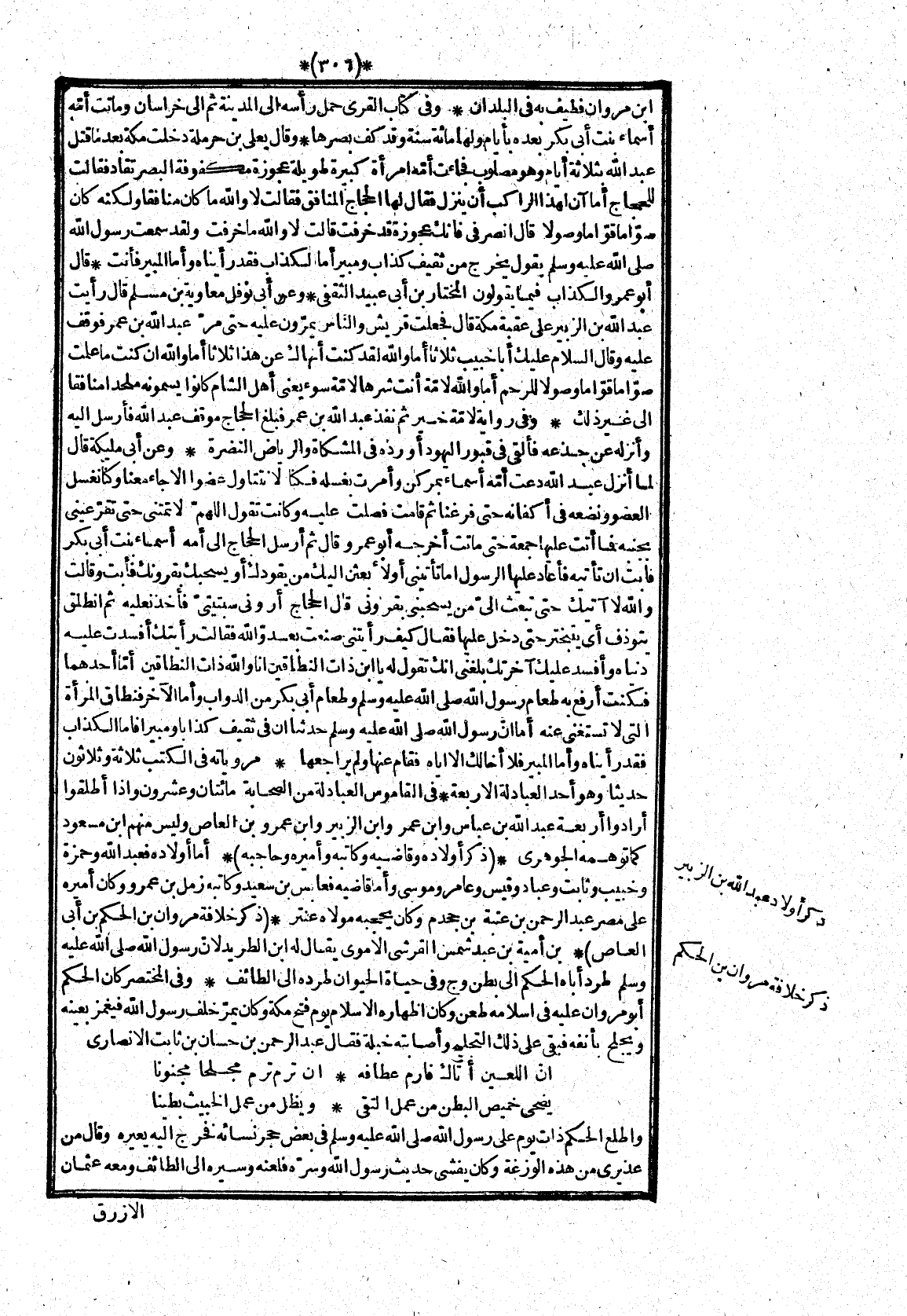 ابن مروان فطيف به فى البلدان* وفى كتاب القرى حمل رأسه الى المدينة ثم الى خراسان وماتت أمّه أسماء بنت أبى بكر بعده بأيام ولها مائة سنة وقد كف بصرها* وقال يعلى بن حرملة دخلت مكة بعد ما قتل عبد الله بثلاثة أيام وهو مصلوب فجاءت أمّه امرأة كبيرة طويلة عجوزة مكفوفة البصر تقاد فقالت للحجاج أما آن لهذا الراكب أن ينزل فقال لها الحجاج المنافق فقالت لا والله ما كان منافقا ولكنه كان صوّاما قوّاما وصولا قال انصرفى فانك عجوزة قد خرفت قالت لا والله ما خرفت ولقد سمعت رسول الله صلى الله عليه وسلم يقول يخرج من ثقيف كذاب ومبير أما لكذاب فقد رأيناه وأما المبير فأنت* قال أبو عمرو الكذاب فيما يقولون المختار بن أبى عبيد الثقفى* وعن أبى نوفل معاوية بن مسلم قال رأيت عبد الله بن الزبير على عقبة مكة قال فجعلت قريش والناس يمرّون عليه حتى مرّ عبد الله بن عمر فوقف عليه وقال السلام عليك أبا خبيب ثلاثا أما والله لقد كنت أنهاك عن هذا ثلاثا أما والله ان كنت ما علمت صوّاما قوّاما وصولا للرحم أما والله لامّة أنت شرها لامّة سوء يعنى أهل الشام كانوا يسمونه ملحدا منافقا الى غير ذلك* وفى رواية لامّة خير ثم نفذ عبد الله بن عمر فبلغ الحجاج موقف عبد الله فأرسل اليه وأنزله عن جذعه فألقى فى قبور اليهود أورده فى المشكاة والرياض النضرة* وعن أبى مليكة قال لما أنزل عبد الله دعت أمّه أسماء بمركن وأمرت بغسله فكنا لا نتتاول عضوا الاجاء معنا وكنا نغسل العضو ونضعه فى أكفانه حتى فرغنا ثم قامت فصلت عليه وكانت تقول اللهمّ لا تمتنى حتى تقرّ عينى بجنبه فما أتت عليها جمعة حتى ماتت أخرجه أبو عمرو قال ثم أرسل الحجاج الى أمه أسماء بنت أبى بكر فابت ان تأتيه فأعاد عليها الرسول اما تأتينى أو لأبعثن اليك من يقودك أو يسحبك بقرونك فأبت وقالت والله لا آتيك حتى تبعث الىّ من يسحبنى بقرونى قال الحجاج أرونى سبتيتىّ فأخذ نعليه ثم انطلق يتوذف أى يتبختر حتى دخل عليها فقال كيف رأيتنى صنعت بعدوّ الله فقالت رأيتك أفسدت عليه دنياه وأفسد عليك آخرتك بلغنى انك تقول له يا ابن ذات النطاقين انا والله ذات النطاقين أمّا أحدهما فكنت أرفع به طعام رسول الله صلى الله عليه وسلم وطعام أبى بكر من الدواب وأما الاخر فنطاق المرأة التى لا تستغنى عنه أما انّ رسول الله صلى الله عليه وسلم حدثنا ان فى ثقيف كذابا ومبيرا فاما الكذاب فقد رأيناه وأما المبير فلا أخالك الا اياه فقام عنها ولم يراجعها* مروياته فى الكتب ثلاثة وثلاثون حديثا وهو أحد العبادلة الاربعة* فى القاموس العبادلة من الصحابة مائتان وعشرون واذا أطلقوا أرادوا أربعة عبد الله بن عباس وابن عمر وابن الزبير وابن عمرو بن العاص وليس منهم ابن مسعود كما توهمه الجوهرى*