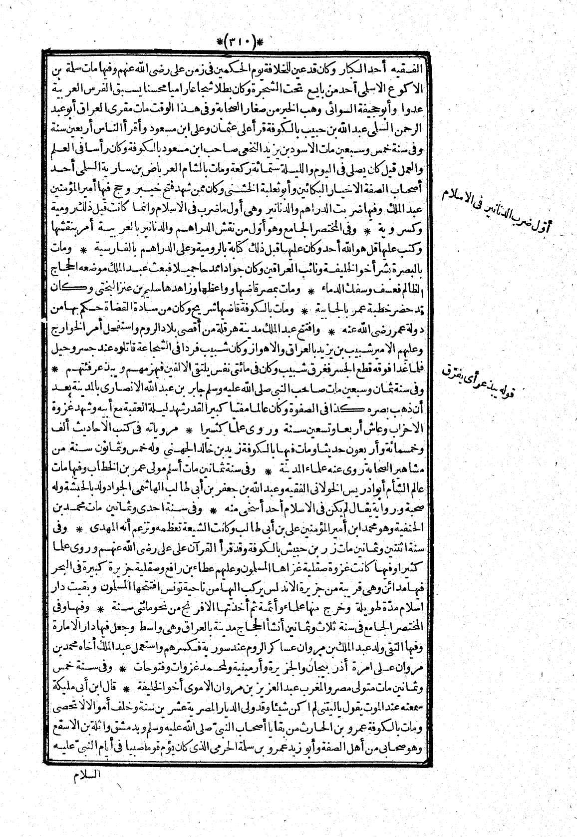 وفيها ضربت الدراهم والدنانير وهى أول ما ضرب فى الاسلام وانما كانت قبل ذلك رومية وكسروية* وفى المختصر الجامع وهو أول من نقش الدراهم والدنانير بالعربية أمر بنقشها وكتب عليها قل هو الله أحد وكان عليها قبل ذلك كتابة بالرومية وعلى الدراهم بالفارسية* ومات بالبصرة بشر أخو الخليفة ونائب العراقين وكان جوادا ممدحا جميلا فبعث عبد الملك موضعه الحجاج الظالم فعسف وسفك الدماء* ومات بمصر قاضيها وواعظها وزاهدها سليم بن عنز البختى وكان قد حضر خطبة عمر بالجابية* ومات بالكوفة قاضيها شريح وكان من سادة القضاة حكم بها من دولة عمر رضى الله عنه* وافتتح عبد الملك مدينة هرقلة من أقصى بلاد الروم واستفحل أمر الخوارج وعليهم الامير شبيب بن يزيد بالعراق والاهواز وكان شبيب فردا فى الشجاعة قاتلوه عند جسر وحيل فلما غدا فوقه قطع الجسر فغرق شبيب وكان فى مائتى نفس يلتقى الالفين فيهزمهم ويبذعر فئتهم* وفى سنة ثمان وسبعين مات صاحب النبى صلى الله عليه وسلم جابر بن عبد الله الانصارى بالمدينة بعد أن ذهب بصره كذا فى الصفوة وكان عالما مفتيا كبير القدر شهد ليلة العقبة مع أبيه وشهد غزوة الاحزاب وعاش أربعا وتسعين سنة وروى علما كثيرا* مروياته فى كتب الاحاديث ألف وخمسمائة وأربعون حديثا ومات فيها بالكوفة زيد بن خالد الجهنى وله خمس وثمانون سنة من مشاهير الصحابة روى عنه علماء المدينة* وفى سنة ثمانين مات أسلم مولى عمر بن الخطاب وفيها مات عالم الشأم أبو ادريس الخولانى الفقيه وعبد الله بن جعفر بن أبى طالب الهاشمى الجواد ولد بالحبشة وله صحبة ورواية يقال لم يكن فى الاسلام أحد أسخى منه* وفى سنة احدى وثمانين مات محمد بن الحنفية وهو محمد ابن أمير المؤمنين على بن أبى طالب وكانت الشيعة تعظمه وتزعم أنه المهدى* وفى سنة اثنتين وثمانين مات زر بن حبيش بالكوفة وقد قرأ القرآن على على رضى الله عنهم وروى علما كثيرا وفيها كانت غزوة صقلية غزاها المسلمون وعليهم عطاء بن رافع وصقلية جزيرة كبيرة فى البحر فيها مدائن وهى قريبة من جزيرة الاندلس يركب اليها من ناحية تونس افتتحها المسلمون وبقيت دار اسلام مدّة طويلة وخرج منها علماء وأئمة ثم أخذتها الافرنج من نحو مائتى سنة* وفيها وفى المختصر الجامع فى سنة ثلاث وثمانين أنشأ الحجاج مدينة بالعراق وهى واسط وجعل فيها دار الامارة وفيها التقى ولد عبد الملك بن مروان عساكر الروم عند سورية فكسرهم واستعمل عبد الملك أخاه محمد بن مروان على امرة أذربيجان والجزيرة وأرمينية ولمحمد غزوات وفتوحات* وفى سنة خمس وثمانين مات متولى مصر والمغرب عبد العزيز بن مروان الاموى أخو الخليفة* قال ابن أبى مليكة سمعته عند الموت يقول يا ليتنى لم اكن شيئا وقد ولى الديار المصرية عشرين سنة وخلف أموالا لا تحصى ومات بالكوفة عمرو بن الحارث من بقايا أصحاب النبىّ صلى الله عليه وسلم وبدمشق واثلة بن الاسقع وهو صحابى من أهل الصفة وأبو زيد عمرو بن سلمة الحرمى الذى كان يؤم قوما صبيا فى أيام النبىّ عليه