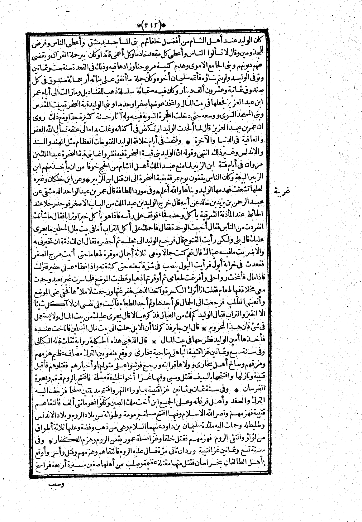 وفى مورد اللطافة قال عمر بن عبد الواحد الدمشقى عن عبد الرحمن بن يزيد بن خالد عن أبيه قال خرج الوليد بن عبد الملك من الباب الاصغر فوجد رجلا عند الحائط عند المأذنة الشرقية يأكل وحده فجاء فوقف على رأسه فاذا هو يأكل خبزا وترابا فقال ما شأنك انفردت من الناس فقال أحببت الوحدة فقال فما حملك على أكل التراب أما فى بيت مال المسلمين ما يجرى عليك قال بلى ولكن رأيت القنوع قال فرجع الوليد الى مجلسه ثم أحضره فقال ان لك ذمّة ان تخبرنى به والا ضربت ما فيه عيناك قال نعم كنت جمالا ومعى ثلاثة أجمال موقرة طعاما حتى أتيت مرج الصفر فقعدت فى خرابة أبول فرأيت البول ينصب فى شق فاتبعته حتى كشفته واذا غطاء على حفير فنزلت فاذا مال فأنخت رواحلى وأفرغت طعامى ثم أوقرتها ذهبا وغطيت الموضع فلما سرت غير بعيد وجدت معى مخلاة فيها طعام فقلت انا أترك الكسرة وآخذ الذهب ففرغتها ورجعت لا ملأها فخفى عنى الموضع وأتعبنى الطلب فرجعت الى الجمال فلم أجدها ولم أجد الطعام فاليت على نفسى ان لا آكل شيئا الا الخبز والتراب فقال الوليدكم لك من العيال فذكر عيالا قال يجرى عليك من بيت المال ولا يستعمل فى شئ فان هذا المحروم* قال ابن جابر فذكر لنا أن الابل حملت الى بيت مال المسلمين فاناخت عنده فأخذها أمين الوليد فطرحها فى بيت المال* قال الذهبى هذه الحكاية رواية ثقات قاله الكنانى وفى سنة سبع وثمانين غزا قتيبة الباهلى بناحية بخارى ووقع بينه وبين الترك مصاف عظيم هزمهم ومزقهم وصالح أهل بخارى وولاها قرابته ورجع فوثبوا على متوليها وأخيارهم فقتلوهم فأقبل قتيبة ونازلها وافتتحها بالسيف فقتل وسبى وفيها غزا أخو الخليفة مسلمة فافتتح بالروم قميقم وبحيرة الفرسان* وفى سنة ثمان وثمانين غزا قتيبة بما وراء النهر وافتتح مدينتين صالحا فزحف اليه الترك والصغد وأهل فرغانه وعلى الجميع ابن أخت ملك الصين وكانوا نحو مائتى ألف فالتقاهم قتيبة فهزمهم ونصر الله الاسلام وفيها افتتح مسلمة جرمومة وطوانة من بلاد الروم وبلاد الاندلس وطليطله وحملت اليه مائدة سليمان بن داود عليهما السلام وهى من ذهب وفضة وعليها ثلاثة أطواق من لؤلؤ والتقى الروم فهزمهم فقتل خلقا وغزا مسلمة عمورية من الروم وهزم الكفار* وفى سنة تسع وثمانين غزا قتيبة وردان ثانى مرّة فسال عليه الروم فالتقاهم وهزمهم وقتل وأسر وأوقع بأهل الطالقان بخراسان فقتل منها مقتلة عظيمة وصلب من أهلها صفين مسيرة أربعة فراسخ