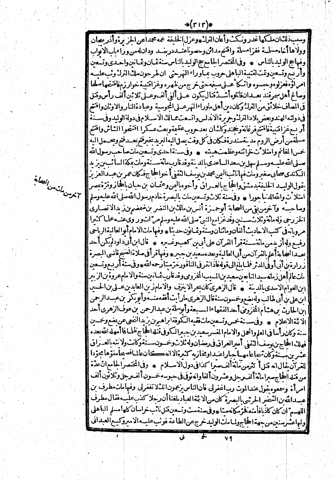 وفى سنة ثلاث وتسعين مات بالبصرة خادم رسول الله صلى الله عليه وسلم وصاحبه وآخر من بقى من الصحابة أبو حمزة أنس بن مالك بن النضر بن ضمضم بن زيد الانصارى الخزرجى وله مائة وثلاث سنين وقد غزا مع النبىّ صلى الله عليه وسلم مرّات وروى عنه علما كثيرا مروياته فى كتب الاحاديث ألفان ومائتان وستة وثمانون حديثا* وفيها مات الامام أبو العالية الرباحى رفيع وله أزيد من مائة سنة قرأ القرآن على أبى بن كعب وغيره* قال ابن أبى داود لم يكن أحد بعد الصحابة أعلم بالقرآن من أبى العالية وبعده سعيد بن جبير* وفيها قرأ فى صلاة الصبح قاضى البصرة زرارة بن أبى أوفى المدثر فلما بلغ الى قوله فاذا نقر فى الناقور خرّ ميتا رحمه الله* وفى سنة أربع وتسعين مات عالم أهل زمانه سيد التابعين سعيد بن المسيب المخزومى وقد قارب ثمانين سنة والامام عروة بن الزبير ابن العوام الاسدى بالمدينة* قال الزهرى كان بحر الا ينزف والامام زين العابدين على بن الحسين ابن على بن أبى طالب وله بضع وخمسون سنة قال الزهرى ما رأيت أفقه منه وأبو بكر بن عبد الرحمن ابن الحارث بن هشام المخزومى أحد الفقهاء السبعة وأبو سلمة بن عبد الرحمن بن عوف الزهرى أحد الائمة الاعلام* وفى سنة خمس وتسعين مات فقيه الكوفة ابراهيم بن يزيد النخعى عن بضع وخمسين سنة وكان رأسا فى العلم والعمل والامام المفسر سعيد بن جبير الكوفى قتله الحجاج ظلما فما أمهله الله بعده فهلك الحجاج بن يوسف الثقفى أمير العراق فى رمضان وله ثلاث وخمسون سنة وكانت ولايته بالعراق عشرين سنة وكان شجاعا مهيبا جبارا عنيدا ومخازيه كثيرة الا انه كان عالما فصيحا مفوّها مجوّدا للقرآن يقال انه قتل أكثر من مائة ألف صبرا كذا فى دول الاسلام* وفى المختصر الجامع انّ عدّة من قتله الحجاج صبرا مائة ألف رجل وعشرون ألفا وانه توفى فى حبوسه خمسون ألف رجل وثلاثون ألف امرأة وسمعوه يقول عند الموت رب اغفرلى فان الناس يزعمون انك لا تغفرلى وفيها مات مطرف بن عبد الله بن الشخير الحرشى بالبصرة كان من الائمة العباد بلغنا أن رجلا كذب عليه فقال مطرف اللهمّ ان كان كاذبا فأمته فخرّ مكانه ميتا* وفى سنة ست وتسعين قتل نائب خراسان كلها مسلم الباهلى وليها عشر سنين من جهة الحجاج ولما مات الوليد خرج عن الطاعة فوثب عليه الامير وكيع العبدانى