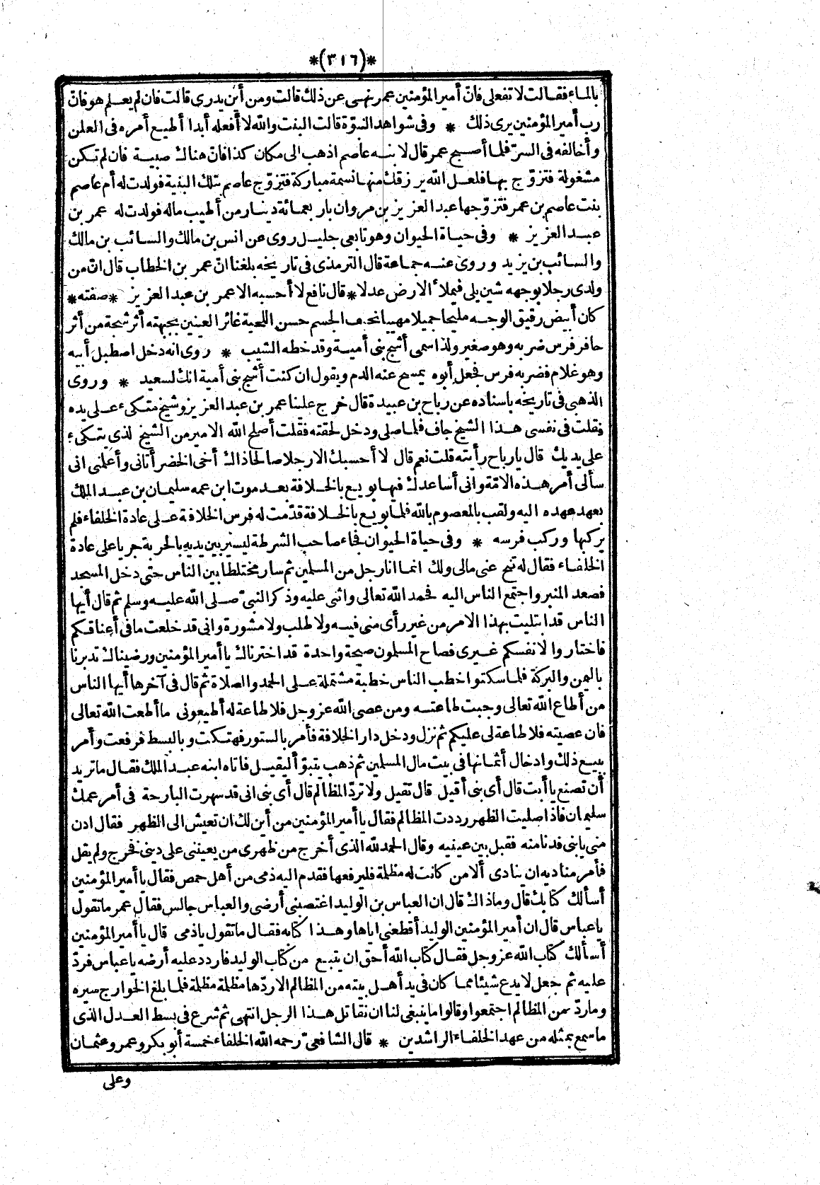 بالماء فقالت لا تفعلى فانّ أمير المؤمنين عمر نهى عن ذلك قالت ومن أين يدرى قالت فان لم يعلم هو فانّ رب أمير المؤمنين يرى ذلك* وفى شواهد النبوّة قالت البنت والله لا أفعله أبدا أطيع أمره فى العلن وأخالفه فى السرّ فلما أصبح عمر قال لابنه عاصم اذهب الى مكان كذا فانّ هناك صبية فان لم تكن مشغولة فتزوّج بها فلعل الله يرزقك منها نسمة مباركة فتزوّج عاصم بتلك البنية فولدت له أم عاصم بنت عاصم بن عمر فتزوّجها عبد العزيز بن مروان باربعمائة دينار من أطيب ماله فولدت له عمر بن عبد العزيز* وفى حياة الحيوان وهو تابعى جليل روى عن انس بن مالك والسائب بن مالك والسائب بن يزيد وروى عنه جماعة قال الترمذى فى تاريخه بلغنا انّ عمر بن الخطاب قال انّ من ولدى رجلا بوجهه شين يلى فيملأ الارض عدلا* قال نافع لا أحسبه الاعمر بن عبد العزيز* صفته* كان أبيض رقيق الوجه مليحا جميلا مهيبا نحيف الجسم حسن اللحية غائر العينين بجبهته أثر شجة من أثر حافر فرس ضربه وهو صغير ولذا سمى أشج بنى أمية وقد خطه الشيب* روى انه دخل اصطبل أبيه وهو غلام فضربه فرس فجعل أبوه يمسح عنه الدم ويقول ان كنت أشج بنى أمية انك لسعيد* وروى الذهبى فى تاريخه باسناده عن رباح بن عبيدة قال خرج علينا عمر بن عبد العزيز وشيخ متكىء على يده ونقلت فى نفسى هذا الشيخ جاف فلما صلى ودخل لحقته فقلت أصلح الله الامير من الشيخ لذى يتكىء على يديك قال يا رباح رأيته قلت نعم قال لا أحسبك الا رجلا صالحا ذاك أخى الخضر أتانى وأعلمنى انى سألى أمر هذه الامّة وانى أساعدك فيها بويع بالخلافة بعد موت ابن عمه سليمان بن عبد الملك بعهد عهده اليه ولقب بالمعصوم بالله فلما بويع بالخلافة قدّمت له فرس الخلافة على عادة الخلفاء فلم يركبها وركب فرسه* وفى حياة الحيوان فجاء صاحب الشرطة ليسير بين يديه بالحربة جريا على عادة الخلفاء فقال له تنح عنى مالى ولك انما انا رجل من المسلمين ثم سار مختلطا بين الناس حتى دخل المسجد فصعد المنبر واجتمع الناس اليه فحمد الله تعالى واثنى عليه وذكر النبىّ صلى الله عليه وسلم ثم قال أيها الناس قد ابتليت بهذا الامر من غير رأى منى فيه ولا طلب ولا مشورة وانى قد خلعت ما فى أعناقكم فاختاروا لانفسكم غيرى فصاح المسلمون صيحة واحدة قد اخترناك يا أمير المؤمنين ورضيناك تدبرنا باليمن والبركة فلما سكتوا خطب الناس خطبة مشتملة على الحمد والصلاة ثم قال فى آخرها أيها الناس من أطاع الله تعالى وجبت طاعته ومن عصى الله عز وجل فلا طاعة له أطيعونى ما أطعت الله تعالى فان عصيته فلا طاعة لى عليكم ثم نزل ودخل دار الخلافة فأمر بالستور فهتكت وبالبسط فرفعت وأمر ببيع ذلك وادخال أثمانها فى بيت مال المسلمين ثم ذهب يتبوّأ ليقيل فاتاه ابنه عبد الملك فقال ما تريد أن تصنع يا أبت قال أى بنى أقيل قال تقيل ولا تردّ المظالم قال أى بنى انى قد سهرت البارحة فى أمر عمك سليمان فاذا صليت الظهر رددت المظالم فقال يا أمير المؤمنين من أين لك ان تعيش الى الظهر فقال ادن منى يا بنى فدنا منه فقبل بين عينيه وقال الحمد لله الذى أخرج من ظهرى من يعيننى على دينى فخرج ولم يقل فأمر مناديه ان ينادى ألا من كانت له مظلمة فيرفعها فقدم اليه ذمى من أهل حمص فقال يا أمير المؤمنين أسألك كتابك قال وما ذاك قال ان العباس بن الوليد اغتصبنى أرضى والعباس جالس فقال عمر ما تقول يا عباس قال ان أمير المؤمنين الوليد أقطعنى اياها وهذا كتابه فقال ما تقول يا ذمى قال يا أمير المؤمنين أسألك كتاب الله عز وجل فقال كتاب الله أحق ان يتبع من كتاب الوليد فاردد عليه أرضه يا عباس فردّ عليه ثم جعل لا يدع شيئا مما كان فى يد أهل بيته من المظالم الا ردّها مظلمة مظلمة فلما بلغ الخوارج سيره وما ردّ من المظالم اجتمعوا وقالوا ما ينبغى لنا ان نقاتل هذا الرجل انتهى ثم شرع فى بسط العدل الذى ما سمع بمثله من عهد الخلفاء الراشدين* قال الشافعىّ رحمه الله الخلفاء خمسة أبو بكر وعمر