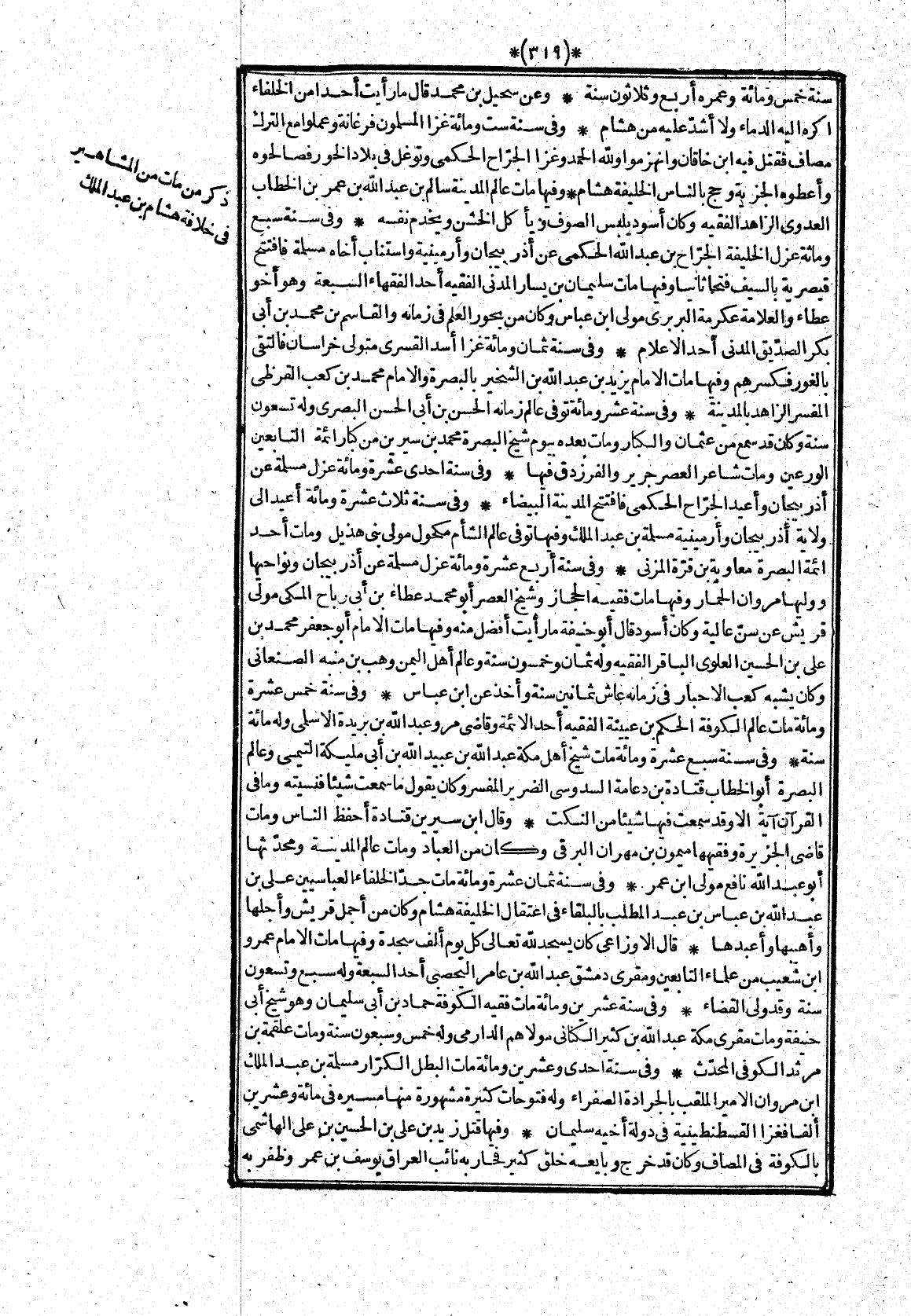 وفيها مات عالم المدينة سالم بن عبد الله بن عمر بن الخطاب العدوى الزاهد الفقيه وكان أسود يلبس الصوف ويأكل الخشن ويخدم نفسه* وفى سنة سبع وماثة عزل الخليفة الجرّاح بن عبد الله الحكمى عن أذربيجان وأرمينية واستناب أخاه مسلمة فافتتح قيصرية بالسيف فتحا ثانيا وفيها مات سليمان بن يسار المدنى الفقيه أحد الفقهاء السبعة وهو أخو عطاء والعلامة عكرمة البربرى مولى ابن عباس وكان من بحور العلم فى زمانه والقاسم بن محمد بن أبى بكر الصدّيق المدنى أحد الاعلام* وفى سنة ثمان ومائة غزا أسد القسرى متولى خراسان فالتقى بالغور فكسرهم وفيها مات الامام يزيد بن عبد الله بن الشخير بالبصرة والامام محمد بن كعب القرظى المفسر الزاهد بالمدينة* وفى سنة عشر ومائة توفى عالم زمانه الحسن بن أبى الحسن البصرى وله تسعون سنة وكان قد سمع من عثمان والكبار ومات بعده بيوم شيخ البصرة محمد بن سيرين من كبار ائمة التابعين الورعين ومات شاعر العصر جرير والفرزدق فيها* وفى سنة احدى عشرة ومائة عزل مسلمة عن أذربيجان وأعيد الجرّاح الحكمى فافتتح المدينة البيضاء* وفى سنة ثلاث عشرة ومائة أعيد الى ولاية أذربيجان وأرمينية مسلمة بن عبد الملك وفيها توفى عالم الشأم مكحول مولى بنى هذيل ومات أحد ائمة البصرة معاوية بن قرّة المزنى* وفى سنة أربع عشرة ومائة عزل مسلمة عن أذربيجان ونواحيها ووليها مروان الحمار وفيها مات فقيه الحجاز وشيخ العصر أبو محمد عطاء بن أبى رباح المكى مولى قريش عن سنّ عالية وكان أسود قال أبو حنيفة ما رأيت أفضل منه وفيها مات الامام أبو جعفر محمد بن على بن الحسين العلوى الباقر الفقيه وله ثمان وخمسون سنة وعالم أهل اليمن وهب بن منبه الصنعانى وكان يشبه كعب الاحبار فى زمانه عاش ثمانين سنة وأخذ عن ابن عباس* وفى سنة خمس عشرة ومائة مات عالم الكوفة الحكم بن عيينة الفقيه أحد الائمة وقاضى مرو عبد الله بن بريدة الاسلمى وله مائة سنة* وفى سنة سبع عشرة ومائة مات شيخ أهل مكة عبد الله بن عبيد الله بن أبى مليكة التيمى وعالم البصرة أبو الخطاب قتادة بن دعامة السدوسى الضرير المفسر وكان يقول ما سمعت شيئا فنسيته وما فى القرآن آية الا وقد سمعت فيها شيئا من النكت* وقال ابن سيرين قتادة أحفظ الناس ومات قاضى الجزيرة وفقيهها ميمون بن مهران البرقى وكان من العباد ومات عالم المدينة ومحدّثها أبو عبد الله نافع مولى ابن عمر* وفى سنة ثمان عشرة ومائة مات جدّ الخلفاء العباسيين على بن عبد الله بن عباس بن عبد المطلب بالبلقاء فى اعتقال الخليفة هشام وكان من أجمل قريش وأجلها وأهيبها وأعبدها* قال الاوزاعى كان يسجد لله تعالى كل يوم ألف سجدة وفيها مات الامام عمرو ابن شعيب من علماء التابعين ومقرى دمشق عبد الله بن عامر اليحصبى أحد السبعة وله سبع وتسعون سنة وقد ولى القضاء* وفى سنة عشرين ومائة مات فقيه الكوفة حماد بن أبى سليمان وهو شيخ أبى حنيفة ومات مقرى مكة عبد الله بن كثير الكنانى مولاهم الدارمى وله خمس وسبعون سنة ومات علقمة بن مرثد الكوفى المحدّث* وفى سنة احدى وعشرين ومائة مات البطل الكرّار مسلمة بن عبد الملك ابن مروان الامير الملقب بالجرادة الصفراء وله فتوحات كثيرة مشهورة منها مسيره فى مائة وعشرين ألفا فغزا القسطنطينية فى دولة أخيه سليمان* وفيها قتل زيد بن على بن الحسين بن على الهاشمى بالكوفة فى المصاف وكان قد خرج وبايعه خلق كثير فحاربه نائب العراق يوسف بن عمر وظفر به