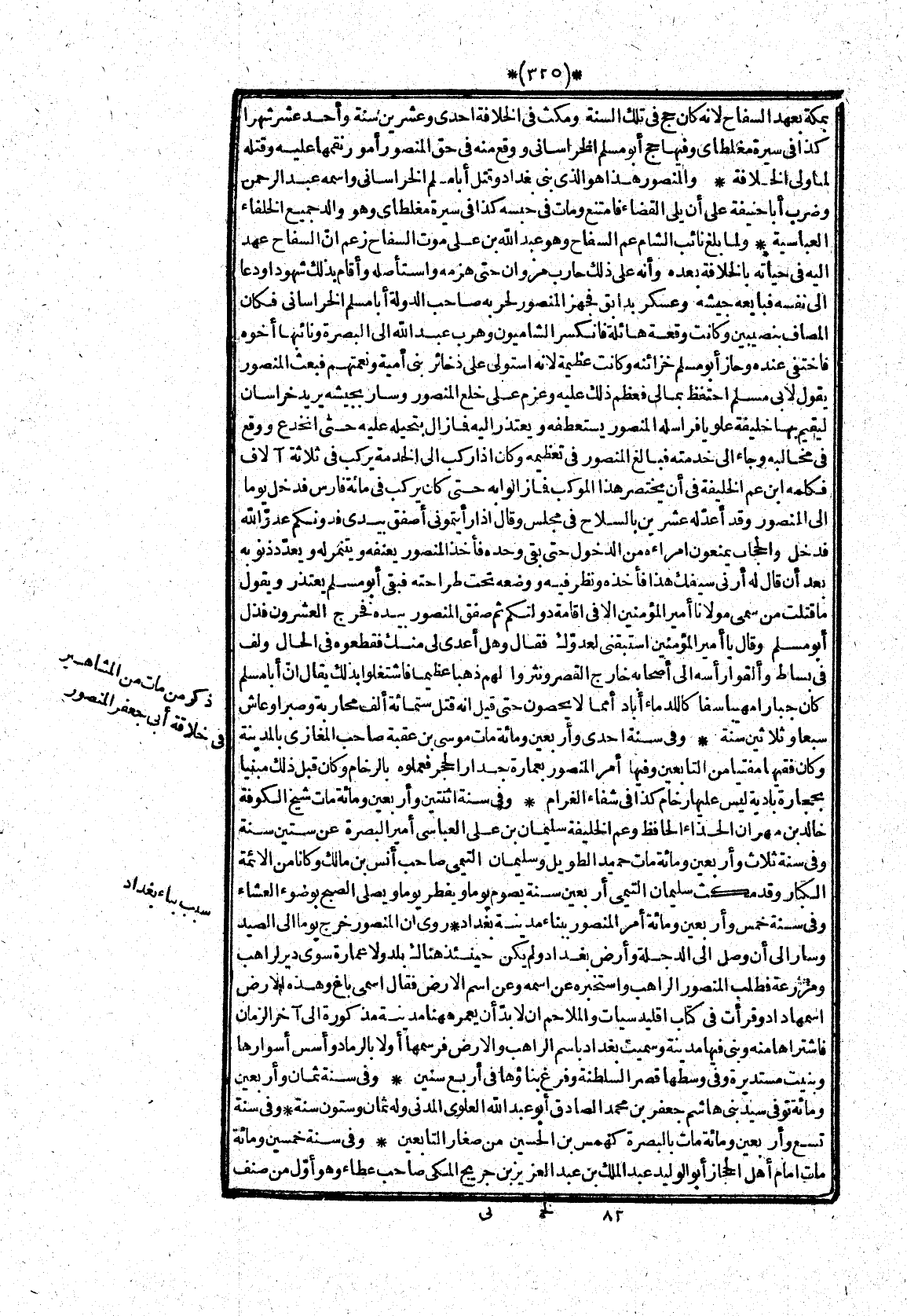 بمكة بعهد السفاح لانه كان حج فى تلك السنة ومكث فى الخلافة احدى وعشرين سنة وأحد عشر شهرا كذا فى سيرة مغلطاى وفيها حج أبو مسلم الخراسانى ووقع منه فى حق المنصور أمور نقمها عليه وقتله لما ولى الخلافة* والمنصور هذا هو الذى بنى بغداد وقتل أبا مسلم الخراسانى واسمه عبد الرحمن وضرب أبا حنيفة على أن يلى القضاء فامتنع ومات فى حبسه كذا فى سيرة مغلطاى وهو والد جميع الخلفاء العباسية* ولما بلغ نائب الشام عم السفاح وهو عبد الله بن على موت السفاح زعم انّ السفاح عهد اليه فى حياته بالخلافة بعده وأنه على ذلك حارب مروان حتى هزمه واستأصله وأقام بذلك شهودا ودعا الى نفسه فبايعه جيشه وعسكر بدابق فجهز المنصور لحربه صاحب الدولة أبا مسلم الخراسانى فكان المصاف بنصيبين وكانت وقعة هائلة فانكسر الشاميون وهرب عبد الله الى البصرة ونائبها أخوه فاختفى عنده وحاز أبو مسلم خزائنه وكانت عظيمة لانه استولى على ذخائر بنى أمية ونعمتهم فبعث المنصور يقول لابى مسلم احتفظ بمالى فعظم ذلك عليه وعزم على خلع المنصور وسار بجيشه يريد خراسان ليقيم بها خليفة علويا فراسله المنصور يستعطفه ويعتذر اليه فما زال بتحيله عليه حتى انخدع ووقع فى مخالبه وجاء الى خدمته فبالغ المنصور فى تعظيمه وكان اذا ركب الى الخدمة يركب فى ثلاثة آلاف فكلمه ابن عم الخليفة فى أن يختصر هذا الموكب فما زالوا به حتى كان يركب فى مائة فارس فدخل يوما الى المنصور وقد أعدّ له عشرين بالسلاح فى مجلس وقال اذا رأيتمونى أصفق بيدى فدونكم عدوّ الله فدخل والحجاب يمنعون امراءه من الدخول حتى بقى وحده فأخذ المنصور يعنفه ويتنمر له ويعدّد ذنوبه بعد أن قال له أرنى سيفك هذا فأخذه ونظر فيه ووضعه تحت طراحته فبقى أبو مسلم يعتذر ويقول ما قتلت من سمى مولانا أمير المؤمنين الا فى اقامة دولتكم ثم صفق المنصور بيده فخرج العشرون فذل أبو مسلم وقال يا أمير المؤمنين استبقنى لعدوّك فقال وهل أعدى لى منك فقطعوه فى الحال ولف فى بساط وألقوا رأسه الى أصحابه خارج القصر ونثروا لهم ذهبا عظيما فاشتغلوا بذلك يقال انّ أبا مسلم كان جبارا مهيبا سفاكا للدماء أباد أمما لا يحصون حتى قيل انه قتل ستمائة ألف محاربة وصبرا وعاش سبعا وثلاثين سنة*