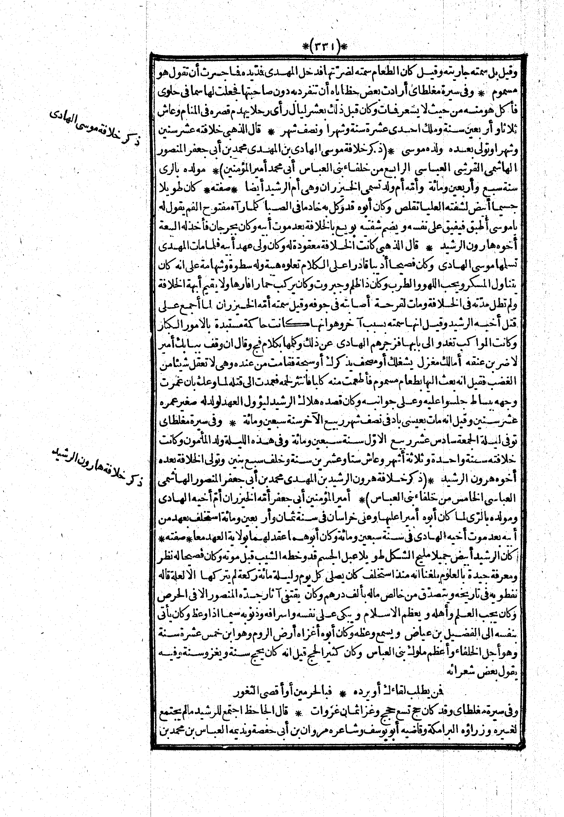 * مولده بالرى سنة سبع وأربعين ومائة وأمّه أم ولد تسمى الخيزران وهى أم الرشيد أيضا* صفته* كان طويلا جسيما أبيض لشفته العليا تقلص وكان أبوه قد وكل به خادما فى الصبا كلما رآه مفتوح الفم يقول له يا موسى أطبق فيفيق على نفسه ويضم شفتيه بويع بالخلافة بعد موت أبيه وكان بجرجان فأخذ له البيعة أخوه هارون الرشيد* قال الذهبى كانت الخلافة معقودة له وكان ولى عهد أبيه فلما مات المهدى تسلمها موسى الهادى وكان فصيحا أديبا قادرا على الكلام تعلوه هيبة وله سطوة وشهامة على انه كان يتناول المسكر ويحب اللهو والطرب وكان ذا ظلم وجبروت وكان يركب حمارا فارها ولا يقيم أبهة الخلافة ولم تطل مدّته فى الخلافة ومات لقرحة أصابته فى جوفه وقيل سمته أمّه الخيزران لما أجمع على قتل أخيه الرشيد وقيل انها سمته بسبب آخر وهو انها كانت حاكمة مستبدة بالامور الكبار وكانت المواكب تغدو الى بابها فزجرهم الهادى عن ذلك وكلمها بكلام فج وقال ان وقف ببابك أمير لاضربن عنقه أمالك مغزل يشغلك أو مصحف يذكرك أو سبحة فقامت من عنده وهى لا تعقل شيئا من الغضب فقيل انه بعث اليها بطعام مسموم فأطعمت منه كلبا فانتثر لحمه فعمدت الى قتله لما وعك بان غمرت وجهه ببساط جلسوا عليه وعلى جوانبه وكان قصده هلاك الرشيد ليؤول العهد لولد له صغير عمره عشر سنين وقيل انه مات بعيسى باد فى نصف شهر ربيع الاخر سنة سبعين ومائة* وفى سيرة مغلطاى توفى ليلة الجمعة سادس عشر ربيع الاوّل سنة سبعين ومائة وفى هذه الليلة ولد المأمون وكانت خلافته سنة واحدة وثلاثة أشهر وعاش ستا وعشرين سنة وخلف سبع بنين وتولى الخلافة بعده أخوه هرون الرشيد*