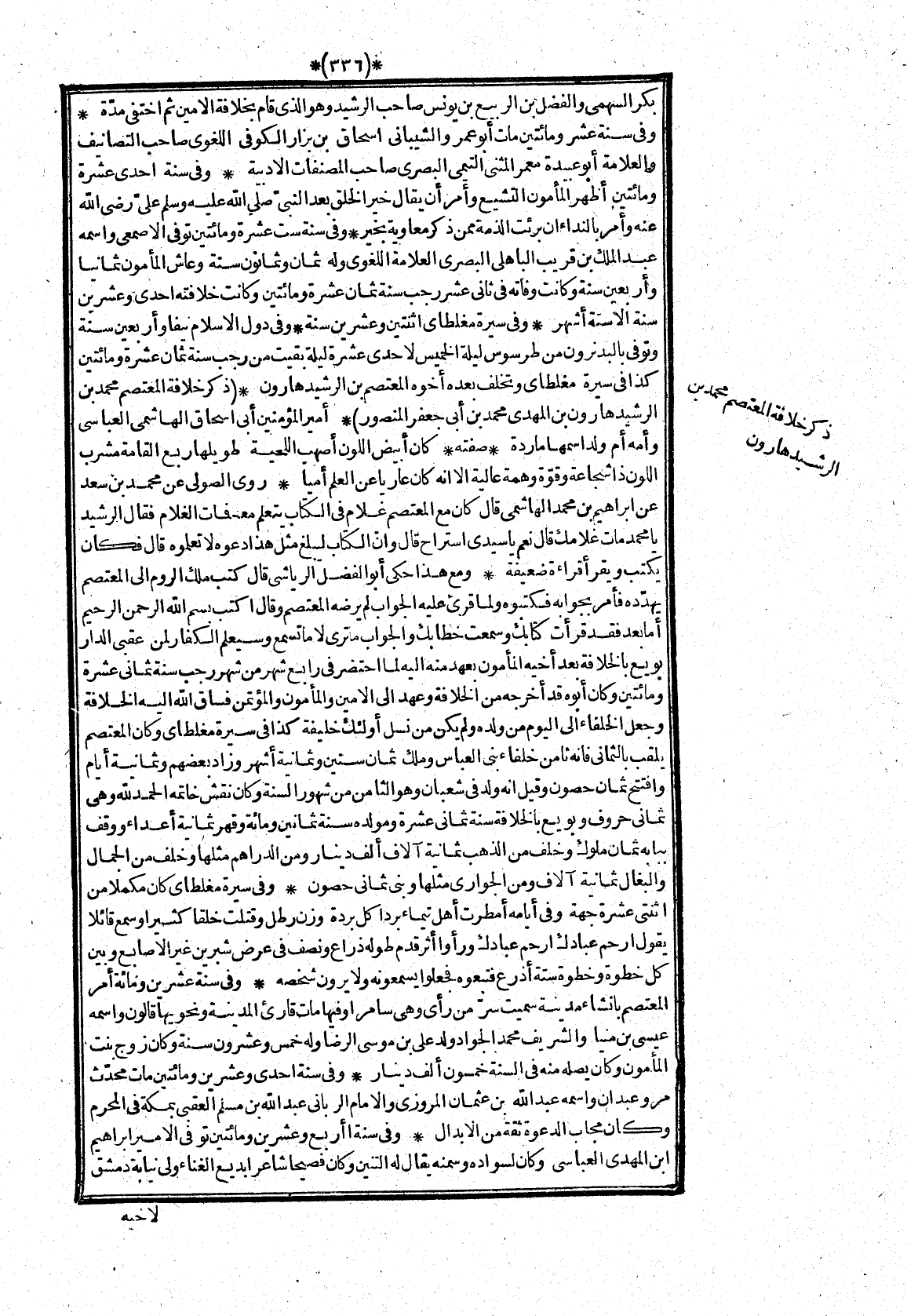 بكر السهمى والفضل بن الربيع بن يونس صاحب الرشيد وهو الذى قام بخلافة الامين ثم اختفى مدّة* وفى سنة عشر ومائتين مات أبو عمر والشيبانى اسحاق بن بزار الكوفى اللغوى صاحب التصانيف والعلامة أبو عبيدة معمر المثنى التيمى البصرى صاحب المصنفات الادبية* وفى سنة احدى عشرة ومائتين أظهر المأمون التشيع وأمر أن يقال خير الخلق بعد النبىّ صلى الله عليه وسلم علىّ رضى الله عنه وأمر بالنداء ان برئت الذمة ممن ذكر معاوية بخير* وفى سنة ست عشرة ومائتين توفى الاصمعى واسمه عبد الملك بن قريب الباهلى البصرى العلامة اللغوى وله ثمان وثمانون سنة وعاش المأمون ثمانيا وأربعين سنة وكانت وفاته فى ثانى عشر رجب سنة ثمان عشرة ومائتين وكانت خلافته احدى وعشرين سنة الا ستة أشهر* وفى سيرة مغلطاى اثنتين وعشرين سنة* وفى دول الاسلام نيفا وأربعين سنة وتوفى بالبد نرون من طرسوس ليلة الخميس لاحدى عشرة ليلة بقيت من رجب سنة ثمان عشرة ومائتين كذا فى سيرة مغلطاى وتخلف بعده أخوه المعتصم بن الرشيد هارون*