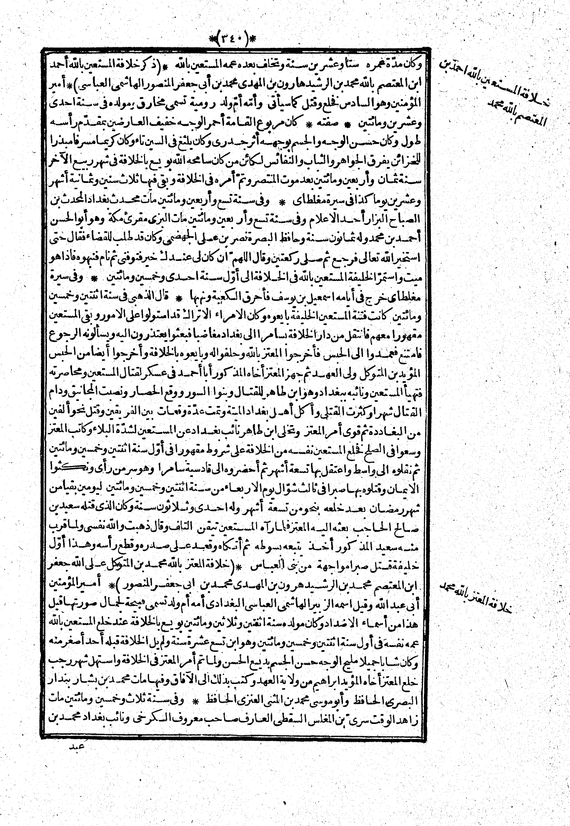 * أمير المؤمنين وهو السادس فخلع وقتل كما سيأتى وأمّه أمّ ولد رومية تسمى مخارق ومولده فى سنة احدى وعشرين ومائتين* صفته* كان مربوع القامة أحمر الوجه خفيف العارضين بمقدّم رأسه طول وكان حسن الوجه والجسم بوجهه أثر جدرى وكان يلثغ فى السين تاء وكان كريما مسرفا مبذرا للخزائن يفرق الجواهر والثياب والنفائس لكائن من كان سامحه الله بويع بالخلافة فى شهر ربيع الاخر سنة ثمان وأربعين ومائتين بعد موت المنتصر وتمّ أمره فى الخلافة وبقى فيها ثلاث سنين وثمانية أشهر وعشرين يوما كذا فى سيرة مغلطاى* وفى سنة تسع وأربعين ومائتين مات محدث بغداد المحدث بن الصباح البزار أحد الاعلام وفى سنة تسع وأربعين ومائتين مات البزى مقرئ مكة وهو أبو الحسن أحمد بن محمد وله ثمانون سنة وحافظ البصرة نصر بن على الجهضمى وكان قد طلب للقضاء فقال حتى استخير الله تعالى فرجع ثم صلى ركعتين وقال اللهمّ ان كان لى عندك خير فتوفنى ثم نام فنبهوه فاذا هو ميت واستمرّ الخليفة المستعين بالله فى الخلافة الى أوّل سنة احدى وخمسين ومائتين* وفى سيرة مغلطاى خرج فى أيامه اسمعيل بن يوسف فأحرق الكعبة ونهبها* قال الذهبى فى سنة اثنتين وخمسين ومائتين كانت فتنة المستعين الخليفة بايعوه وكان الامراء الاتراك قد استولوا على الامور وبقى المستعين مقهورا معهم فانتقل من دار الخلافة بسامرا الى بغداد مغاضبا فبعثوا يعتذرون اليه ويسألونه الرجوع فامتنع فعمدوا الى الحبس فأخرجوا المعتز بالله وحلفوا له وبايعوه بالخلافة وأخرجوا أيضا من الحبس المؤيد بن المتوكل ولى العهد ثم جهز المعتز أخاه المذكور أبا أحمد فى عسكر لقتال المستعين ومحاصرته فتهيأ المستعين ونائبه ببغداد وهو ابن طاهر للقتال وبنوا السور ووقع الحصار ونصبت المجانيق ودام القتال شهرا وكثرت القتلى وأكل أهل بغداد الميتة وتمت عدّة وقعات بين الفريقين وقتل نحو ألفين من البغاددة ثم قوى أمر المعتز وتخلى ابن طاهر نائب بغداد عن المستعين لشدّة البلاء وكاتب المعتز وسعوا فى الصلح فخلع المستعين نفسه من الخلافة على شروط مقهورا فى أوّل سنة اثنتين وخمسين ومائتين ثم نقلوه الى واسط واعتقل بها تسعة أشهر ثم أحضروه الى قادسية سامرا وهو سر من رأى ونكثوا الايمان وقتلوه بها صبرا فى ثالث شوّال يوم الاربعاء من سنة اثنتين وخمسين ومائتين ليومين بقيا من شهر رمضان بعد خلعه بنحو من تسعة أشهر وله احدى وثلاثون سنة وكان الذى قتله سعيد بن صالح الحاجب بعثه اليه المعتز فلما رآه المستعين تيقن التلف وقال ذهبت والله نفسى ولما قرب منه سعيد المذكور أخذ يتبعه بسوطه ثم أتكاه وقعد على صدره وقطع رأسه وهذا أوّل خليفة قتل صبرا مواجهة من بنى العباس*