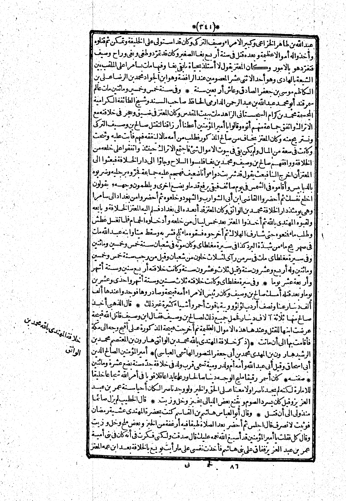 * أمير المؤمنين الصالح الدين أبى اسحاق وقيل أبى عبد الله وأمه أم ولد رومية تسمى قرب ولد فى خلافة جدّه سنة بضع عشرة ومائتين* صفته* كان أسمر رقيقا مليح الوجه دينا صالحا ورعا عابدا عاقلا قويا فى أمر الله شجاعا خليقا للامارة لكنه لم يجد ناصرا ولا معينا على الحق والخير ولو وجد ناصر الكان أحيا سنة عمر بن عبد العزيز وقيل كان يسرد الصوم ويقنع بعض الليالى بخبز وخل وزيت* قال الخطيب لم يزل صائما منذولى الى أن قتل* وقال أبو العباس هاشم بن القاسم كنت بحضرة المهتدى عشية رمضان فوثبت لانصرف قال اجلس ثم أحضر بعد الصلاة طبقا فيه أرغفة من الخبز وبعض ملح وخل وزيت وقال كل فقلت يا أمير المؤمنين قد أسبغ الله نعمه عليك قال صدقت ولكنى فكرت فى أنه كان فى بنى أمية عمر بن عبد العزيز ففاق على بنى هاشم فأخذت نفسى على ما رأيت بويع بالخلافة بعد ابن عمه المعتز
