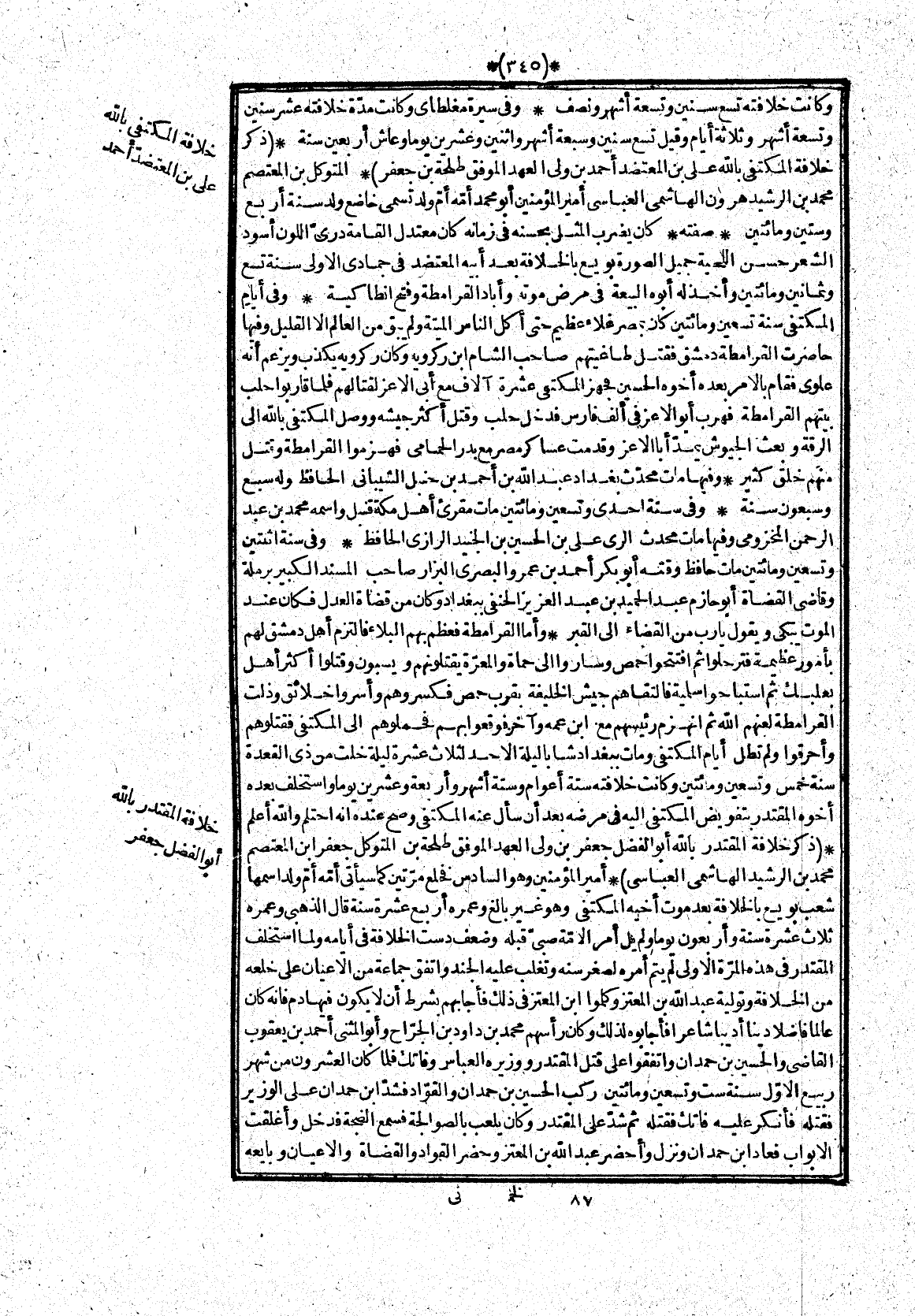 * المتوكل بن المعتصم محمد بن الرشيد هرون الهاشمى العباسى أمير المؤمنين أبو محمد أمّه أمّ ولد تسمى خاضع ولد سنة أربع وستين ومائتين* صفته* كان يضرب المثل بحسنه فى زمانه كان معتدل القامة درىّ اللون أسود الشعر حسن اللحية جميل الصورة بويع بالخلافة بعد أبيه المعتضد فى جمادى الاولى سنة تسع وثمانين ومائتين وأخذ له أبوه البيعة فى مرض موته وأباد القرامطة وفتح انطاكية* وفى أيام المكتفى سنة تسعين ومائتين كان بمصر غلاء عظيم حتى أكل الناس الميتة ولم يبق من العالم الا القليل وفيها حاصرت القرامطة دمشق فقتل طاغيتهم صاحب الشام ابن ركرويه وكان ركرويه يكذب ويزعم أنه علوى فقام بالامر بعده أخوه الحسين فجهز المكتفى عشرة آلاف مع أبى الاعز لقتالهم فلما قاربوا حلب بيتهم القرامطة فهرب أبو الاعز فى ألف فارس فدخل حلب وقتل أكثر جيشه ووصل المكتفى بالله الى الرقة وبعث الجيوش يمدّ أبا الاعز وقدمت عساكر مصر مع بدر الحمامى فهزموا القرامطة وقتل منهم خلق كثير* وفيها مات محدّث بغداد عبد الله بن أحمد بن حنبل الشيبانى الحافظ وله سبع وسبعون سنة* وفى سنة احدى وتسعين ومائتين مات مقرئ أهل مكة قنبل واسمه محمد بن عبد الرحمن المخزومى وفيها مات محدث الرى على بن الحسين بن الجنيد الرازى الحافظ* وفى سنة اثنتين وتسعين ومائتين مات حافظ وقته أبو بكر أحمد بن عمرو البصرى البزار صاحب المسند الكبير برملة وقاضى القضاة أبو حازم عبد الحميد بن عبد العزيز الحنفى ببغداد وكان من قضاة العدل فكان عند الموت يبكى ويقول يا رب من القضاء الى القبر* وأما القرامطة فعظم بهم البلاء فالتزم أهل دمشق لهم بأمور عظيمة فترحلوا ثم افتتحوا حمص وساروا الى حماة والمعرّة يقتلونهم ويسبون وقتلوا أكثر أهل بعلبك ثم استباحوا سلمية فالتقاهم جيش الخليفة بقرب حمص فكسروهم وأسروا خلائق وذلت القرامطة لعنهم الله ثم انهزم رئيسهم مع ابن عمه وآخر فوقعوا بهم فحملوهم الى المكتفى فقتلوهم وأحرقوا ولم تطل أيام المكتفى ومات ببغداد شابا ليلة الاحد لثلاث عشرة ليلة خلت من ذى القعدة سنة خمس وتسعين ومائتين وكانت خلافته ستة أعوام وستة أشهر وأربعة وعشرين يوما واستخلف بعده أخوه المقتدر بتفويض المكتفى اليه فى مرضه بعد أن سأل عنه المكتفى وصح عنده انه احتلم والله أعلم*
