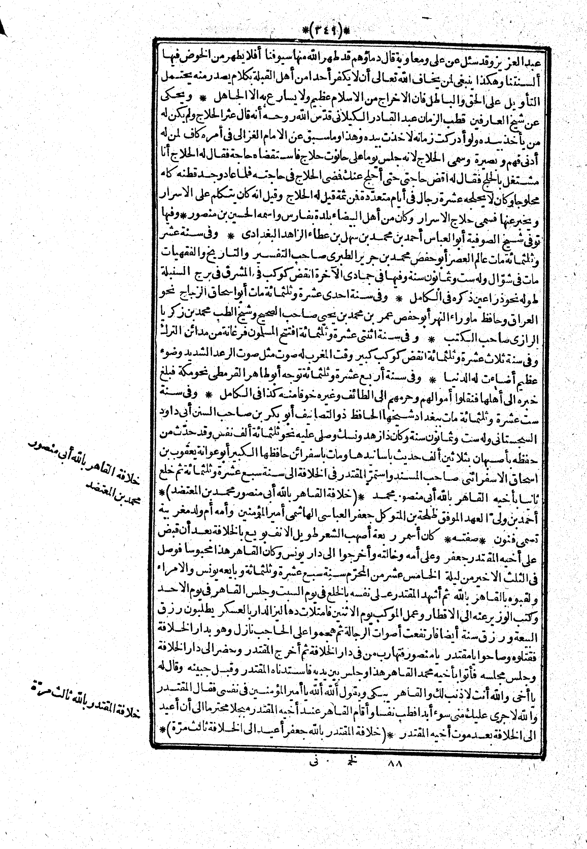 عبد العزيز وقد سئل عن على ومعاوية قال دماؤهم قد طهر الله منها سيوفنا أفلا يطهر من الخوض فيها ألسنتنا وهكذا ينبغى لمن يخاف الله تعالى أن لا يكفر أحدا من أهل القبلة بكلام يصدر منه يحتمل التأويل على الحق والباطل فان الآخراج من الاسلام عظيم ولا يسارع به الا الجاهل* ويحكى عن شيخ العارفين قطب الزمان عبد القادر الكيلانى قدّس الله روحه أنه قال عثر الحلاج ولم يكن له من يأخذ بيده ولو أدركت زمانه لاخذت بيده وهذا وما سبق عن الامام الغزالى فى أمره كاف لمن له أدنى فهم وبصيرة وسمى الحلاج لانه جلس يوما على حانوت حلاج فاستقضاه حاجة فقال له الحلاج أنا مشتغل بالحلج فقال له اقض حاجتى حتى أحلج عنك فمضى الحلاج فى حاجته فلما عاد وجد قطنه كله محلوجا وكان لا يحلجه عشرة رجال فى أيام متعدّدة فمن ثمة قيل له الحلاج وقيل انه كان يتكلم على الاسرار ويخبر عنها فسمى حلاج الاسرار وكان من أهل البيضاء بلدة بفارس واسمه الحسين بن منصور* وفيها توفى شيخ الصوفية أبو العباس أحمد بن محمد بن سهل بن عطاء الزاهد البغدادى* وفى سنة عشر وثلثمائة مات عالم العصر أبو حفص محمد بن جرير الطبرى صاحب التفسير والتاريخ والفقهيات مات فى شوّال وله ست وثمانون سنة وفيها فى جمادى الاخرة انقض كوكب فى المشرق فى برج السنبلة طوله نحو ذراعين ذكره فى الكامل* وفى سنة احدى عشرة وثلثمائة مات أبو اسحاق الزجاج نحو العراق وحافظ ما وراء النهر أبو حفص عمر بن محمد بن يحيى صاحب الصحيح وشيخ الطب محمد بن زكريا الرازى صاحب الكتب* وفى سنة اثنتى عشرة وثلثمائة افتتح المسلمون فرغانة من مدائن الترك وفى سنة ثلاث عشرة وثلثمائة انقض كوكب كبير وقت المغرب له صوت مثل صوت الرعد الشديد وضوء عظيم أضاءت له الدنيا* وفى سنة أربع عشرة وثلثمائة توجه أبو طاهر القرمطى نحو مكة فبلغ خبره الى أهلها فنقلوا أموالهم وحرمهم الى الطائف وغيره خوفا منه كذا فى الكامل* وفى سنة ست عشرة وثلثمائة مات ببغداد شيخها الحافظ ذو التصانيف أبو بكر بن صاحب السنن أبى داود السجستانى وله ست وثمانون سنة وكان ذا زهد ونسك وصلى عليه نحو ثلثمائة ألف نفس وقد حدّث من حفظه بأصبهان بثلاثين ألف حديث باسانيدها ومات باسفرائن حافظها الكبير أبو عوانة يعقوب بن اسحاق الاسفرائنى صاحب المسند واستمرّ المقتدر فى الخلافة الى سنة سبع عشرة وثلثمائة ثم خلع ثانيا بأخيه القاهر بالله أبى منصور محمد*