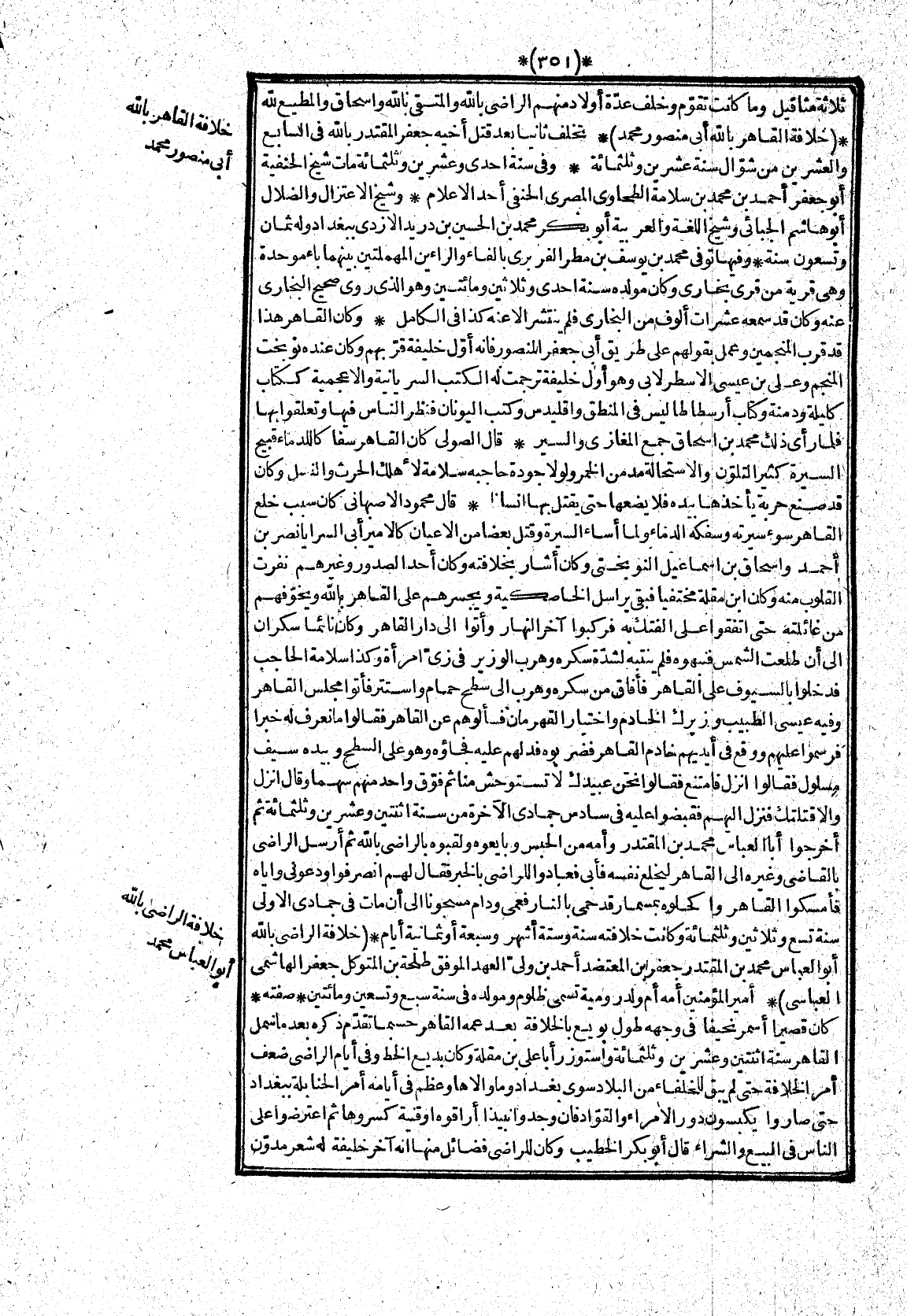 * تخلف ثانيا بعد قتل أخيه جعفر المقتدر بالله فى السابع والعشرين من شوّال سنة عشرين وثلثمائة* وفى سنة احدى وعشرين وثلثمائة مات شيخ الحنفية أبو جعفر أحمد بن محمد بن سلامة الطحاوى المصرى الحنفى أحد الاعلام* وشيخ الاعتزال والضلال أبو هاشم الجبائى وشيخ اللغة والعربية أبو بكر محمد بن الحسين بن دريد الازدى ببغداد وله ثمان وتسعون سنة* وفيها توفى محمد بن يوسف بن مطر الفربرى بالفاء والراءين المهملتين بينهما باء موحدة وهى قرية من قرى بخارى وكان مولده سنة احدى وثلاثين ومائتين وهو الذى روى صحيح البخارى عنه وكان قد سمعه عشرات ألوف من البخارى فلم ينتشر الا عنه كذا فى الكامل* وكان القاهر هذا قد قرب المنجمين وعمل بقولهم على طريق أبى جعفر المنصور فانه أوّل خليفة قرّبهم وكان عنده نوبخت المنجم وعلى بن عيسى الاسطرلابى وهو أول خليفة ترجمت له الكتب السريانية والاعجمية ككتاب كليلة ودمنة وكتاب أرسطاطاليس فى المنطق واقليدس وكتب اليونان فنظر الناس فيها وتعلقوا بها فلما رأى ذلك محمد بن اسحاق جمع المغازى والسير* قال الصولى كان القاهر سفا كاللدماء قبيح السيرة كثير التلوّن والاستحالة مدمن الخمر ولولا جودة حاجبه سلامة لأهلك الحرث والنسل وكان قد صنع حربة يأخذها بيده فلا يضعها حتى يقتل بها انسانا* قال محمود الاصبهانى كان سبب خلع القاهر سوء سيرته وسفكه الدماء ولما أساء السيرة وقتل بعضا من الاعيان كالامير أبى السرايا نصر بن أحمد واسحاق بن اسماعيل النوبختى وكان أشار بخلافته وكان أحد الصدور وغيرهم نفرت القلوب منه وكان ابن مقلة مختفيا فبقى يراسل الخاصكية ويجسرهم على القاهر بالله ويخوّفهم من غائلته حتى اتفقوا على الفتك به فركبوا آخر النهار وأتوا الى دار القاهر وكان نائما سكران الى أن طلعت الشمس فنبهوه فلم ينتبه لشدّة سكره وهرب الوزير فى زىّ امرأة وكذا سلامة الحاجب فدخلوا بالسيوف على القاهر فأفاق من سكره وهرب الى سطح حمام واستتر فأتوا مجلس القاهر وفيه عيسى الطبيب وزيرك الخادم واختيار القهرمان فسألوهم عن القاهر فقالوا ما نعرف له خبرا فرسموا عليهم ووقع فى أيديهم خادم القاهر فضربوه فدلهم عليه فجاؤه وهو على السطح وبيده سيف مسلول فقالوا انزل فامتنع فقالوا نحن عبيدك لا تستوحش مناثم فوّق واحد منهم سهما وقال انزل والا قتلتك فنزل اليهم فقبضوا عليه فى سادس جمادى الاخرة من سنة اثنتين وعشرين وثلثمائة ثم أخرجوا أبا العباس محمد بن المقتدر وأمه من الحبس وبايعوه ولقبوه بالراضى بالله ثم أرسل الراضى بالقاضى وغيره الى القاهر ليخلع نفسه فأبى فعادوا للراضى بالخبر فقال لهم انصرفوا ودعونى واياه فأمسكوا القاهر واكحلوه بمسمار قد حمى بالنار فعمى ودام مسجونا الى أن مات فى جمادى الاولى سنة تسع وثلاثين وثلثمائة وكانت خلافته سنة وستة أشهر وسبعة أو ثمانية أيام*