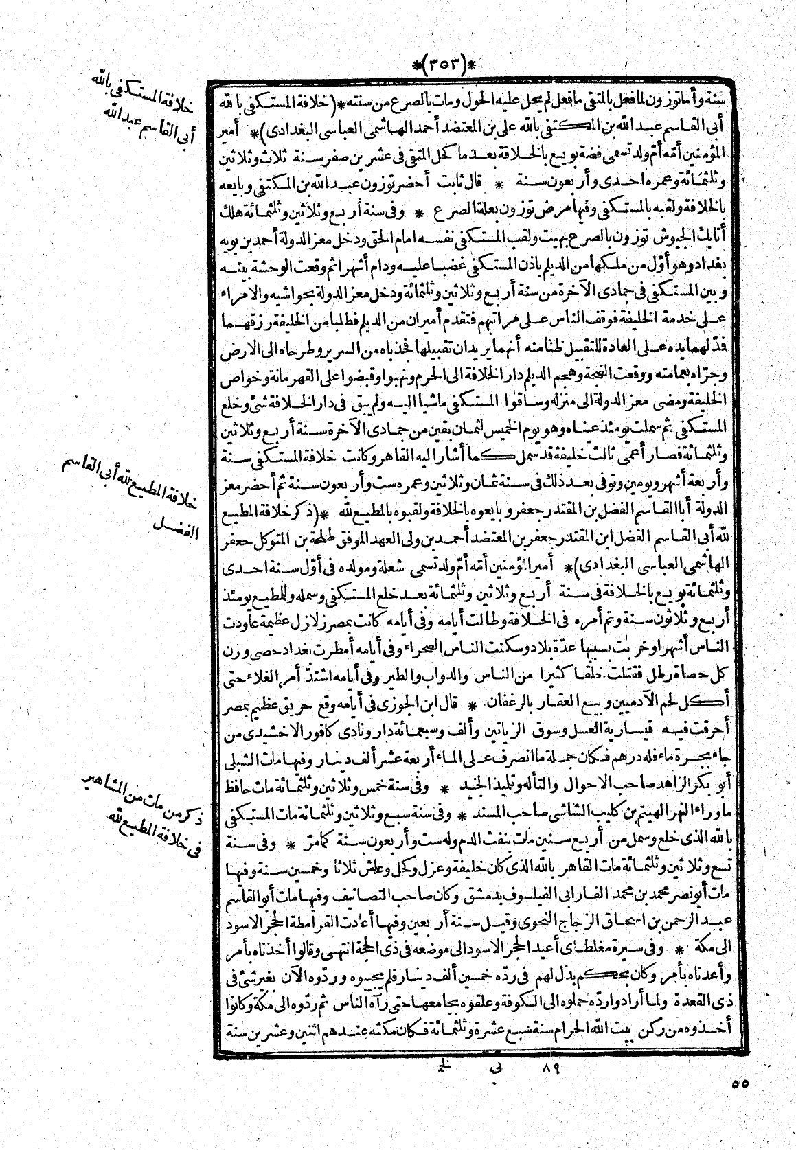 * أمير المؤمنين أمّه أمّ ولد تسمى شعلة ومولده فى أوّل سنة احدى وثلثمائة بويع بالخلافة فى سنة أربع وثلاثين وثلثمائة بعد خلع المستكفى وسمله وللمطيع يومئذ أربع وثلاثون سنة وتم أمره فى الخلافة وطالت أيامه وفى أيامه كانت بمصر زلازل عظيمة عاودت الناس أشهرا وخربت بسببها عدّة بلاد وسكنت الناس الصحراء وفى أيامه أمطرت بغداد حصى ورن كل حصاة رطل فقتلت خلقا كثيرا من الناس والدواب والطير وفى أيامه اشتدّ أمر الغلاء حتى أكل لحم الادميين وبيع العقار بالرغفان* قال ابن الجوزى فى أيامه وقع حريق عظيم بمصر أحرقت فيه قيسارية العسل وسوق الزياتين وألف وسبعمائة دار ونادى كافور الاخشيدى من جاء بجرة ماء فله درهم فكان جملة ما انصرف على الماء أربعة عشر ألف دينار وفيها مات الشبلى أبو بكر الزاهد صاحب الاحوال والتأله وتلميذ الجنيد* وفى سنة خمس وثلاثين وثلثمائة مات حافظ ما وراء النهر الهيتم بن كليب الشاشى صاحب المسند* وفى سنة سبع وثلاثين وثلثمائة مات المستكفى بالله الذى خلع وسمل من أربع سنين مات بنفث الدم وله ست وأربعون سنة كما مرّ* وفى سنة تسع وثلاثين وثلثمائة مات القاهر بالله الذى كان خليفة وعزل وكحل وعاش ثلاثا وخمسين سنة وفيها مات أبو نصر محمد بن محمد الفارابى الفيلسوف بدمشق وكان صاحب التصانيف وفيها مات أبو القاسم عبد الرحمن بن اسحاق الزجاج النحوى وقيل سنة أربعين وفيها أعادت القرامطة الحجر الاسود الى مكة* وفى سيرة مغلطاى أعيد الحجر الاسود الى موضعه فى ذى الحجة انتهى وقالوا أخذناه بأمر وأعدناه بأمر وكان بحكم بذل لهم فى ردّه خمسين ألف دينار فلم يجيبوه وردّوه الان بغير شئ فى ذى القعدة ولما أرادوا ردّه حملوه الى الكوفة وعلقوه بجامعها حتى رآه الناس ثم ردّوه الى مكة وكانوا أخذوه من ركن بيت الله الحرام سنة سبع عشرة وثلثمائة فكان مكثه عندهم اثنين وعشرين سنة