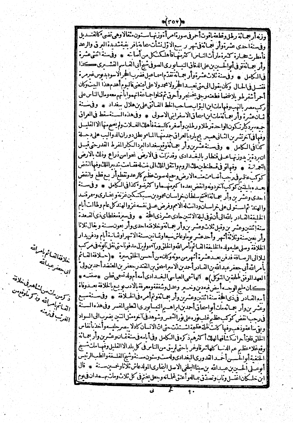 وزنه أربعمائة رطل وقطعة ياقوت أحمر فى صورة امرأة وزنها ستون مثقالا وهى تضىء كالقنديل وفى سنة احدى عشرة وأربعمائة فى شهر ربيع الاوّل نشأت سحابة بافريقية شديدة البرق والرعد فأمطرت حجارة كثيرة ما رأت الناس اكثر منها فأهلكت كل من أصابته* وفى سنة اثنتى عشرة وأربعمائة توفى أبو الحسين بن على الدقاق النيسابورى الصوفى شيخ أبى القاسم القشيرى كذا فى الكامل* وفى سنة ثلاث عشرة وأربعمائة تقدّم اسماعيل فضرب الحجر الاسود بدبوس غير مرة فقتل فى الحال وكان يقول الى متى نعبد الحجر ولا محمد ولا على ليمنعنى فاليوم أهدم هذا البيت وكان أحمر أشقر طويلا ضخما فطعنه رجل بخنجر وأحرق ثم قتلوا جماعة اتهموا بأنهم معه ومال الناس على ركب مصر بالنهب وفيها مات ابن البوّاب صاحب الخط الفائق على بن هلال ببغداد* وفى سنة ثمان عشرة وأربعمائة مات ابن اسحاق الاسفراينى الاصولى* وفى هذه السنة سقط فى العراق جميعه برد كبار تكون الواحدة رطلا ورطلين وأصغره كالبيضة فأهلك الغلات ولم يصح منها الا القليل وفيها فى آخر تشرين الثانى هب ريح بارد بالعراق جمد منها الماء وبطل دوران الدواليب على دجلة كذا فى الكامل* وفى سنة عشرين وأربعمائة وقع ببغداد البرد الكبار المفرط القدر حتى قيل ان بردة يزيد وزنها على قنطار بالبغدادى وقد نزلت فى الارض نحوا من ذراع وذلك بالارض النعمانية* وفيها توفى قسطنطين ملك الروم وانتقل الملك الى بنت له فقامت بتدبير الملك وفيها انقض كوكب عظيم فى رجب أضاءت منه الارض وسمع له صوت عظيم كالرعد وتقطع أربع قطع وانقض بعده بليلتين كوكب آخر دونه وانقض بعده اكبر منهما واكثر ضوء كذا فى الكامل* وفى سنة احدى وعشرين وأربعمائة افتتح سلطان خراسان محمود بن سبكتكين غزنة وبخارى وسمرقند والهند ثم استولى على خراسان ودانت له الامم وفرض على نفسه غزو الهند كل عام وطالت أيام الخليفة القادر بالله الى أن توفى ليلة الاثنين حادى عشر ذى الحجة* وفى سيرة مغلطاى ذى القعدة سنة اثنتين وعشرين وقيل ثلاث وعشرين وأربعمائة وخلافته احدى وأربعون سنة ويقال ثلاثا وأربعين سنة وثلاثة أشهر وأحد عشر يوما وعاش سبعا وثمانين سنة الاشهر او ثمانية أيام ودفن بدار الخلافة وصلى عليه ولده الخليفة القائم بأمر الله والخلق ورآءه ولم يزل مدفونا حتى نقل تابوته فى مركب ليلا الى الرصافة فدفن بعد عشرة أشهر من موته وكان من أحسن الخلق سيرة*