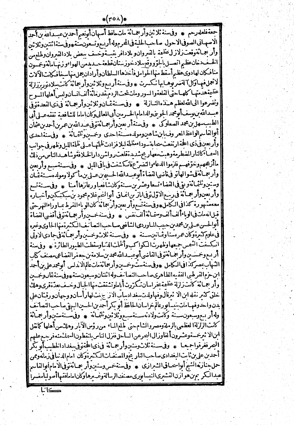 جمعة فلعله رحم* وفى سنة ثلاثين وأربعمائة مات حافط أصبهان أبو نعيم أحمد بن عبد الله بن أحمد الاصبهانى الصوفى الاحول صاحب الحلية فى المحرم وله أربع وتسعون سنة* وفى سنة اثنتين وثلاثين وأربعمائة وقعت زلازل عظيمة بالقيروان وبلاد افريقية وخسف ببعض بلاد القيروان وطلع من الخسف دخان عظيم اتصل بالجوّ ووقع ببلاد خوزستان قطعة حديد من الهواء وزنها مائة وخمسون منا فكان لها دوى عظيم أسقط منها الحوامل فأخذها السلطان وأراد ان يعمل منها سيفا فكانت الالات لا تعمل فيها وكل آلة ضربوها بها تكسرت* وفى سنة أربع وثلاثين وأربعمائة كانت ببلاد توريز زلزلة عظيمة هدمتها كلها حتى القلعة والسور ومات تحت الردم بقدر مائة ألف انسان ولبس أهلها المسوح وتضرعوا الى الله لعظم هذه النازلة* وفى سنة ثمان وثلاثين وأربعمائة فى ذى القعدة توفى عبد الله بن يوسف أبو محمد الجوينى والد امام الحرمين أبى المعالى وكان اماما للشافعية تفقه على أبى الطيب سهل بن محمد الصعلوكى* وفى سنة أربعين وأربعمائة توفى عبيد الله بن عمر بن أحمد بن عثمان أبو القاسم الواعظ المعروف بابن شاهين ومولده سنة احدى وخمسين وثلثمائة* وفى سنة احدى وأربعين فى ذى الحجة ارتفعت سحابة سوداء مظلمة ليلا فزادت ظلمتها على ظلمة الليل وظهر فى جوانب السماء كالنار المضطرمة وهبت معها ريح شديدة قلعت رواشن دار الخلافة وشاهد الناس من ذلك ما أزعجهم وخوّفهم فلزموا الدعاء والتضرّع فانكشفت فى باقى الليل* وفى سنة سبع وأربعين وأربعمائة فى شوالها توفى قاضى القضاة أبو عبد الله الحسين بن على بن مأكولا ومولده سنة ثمان وستين وثلثمائة وبقى فى القضاء تسعا وعشرين سنة وكان شافعيا ورعا نزها أمينا* وفى سنة تسع وأربعين وأربعمائة فى ربيع الاوّل توفى اياز بن انماق أبو النجم غلام محمود بن سبكتكين وأخباره معه مشهورة كذا فى الكامل* وفى سنة تسع وأربعين وأربعمائة كان الوباء المفرط بما وراء النهر حتى قيل انه مات فى الوباء ألف ألف وستمائة ألف نفس* وفى سنة خمسين وأربعمائة توفى أقضى القضاة أبو الحسن على بن محمد بن حبيب الماوردى الشافعى صاحب التصانيف الكثيرة منها الحاوى وغيره فى علوم كثيرة وكان عمره ستا وثمانين سنة* وفى سنة ثلاث وخمسين وأربعمائة فى جمادى الاولى انكسفت الشمس جميعها وظهرت الكواكب وأظلمت الدنيا وسقطت الطيور الطائرة* وفى سنة أربع وخمسين وأربعمائة توفى القاضى أبو عبد الله محمد بن سلامة بن جعفر القضاعى مصنف كتاب الشهاب بمصر كذا فى الكامل* وفى سنة ست وخمسين وأربعمائة مات عالم الاندلس أبو محمد على بن أحمد ابن حزم القرطبى الفقيه الظاهرى صاحب التصانيف وله اثنتان وسبعون سنة* وفى سنة ثمان وخمسين وأربعمائة كانت زلزلة عظيمة بخراسان تكرّرت أياما وتشققت منها الجبال وخسف بعدّة قرى وهلك خلق كثير نقله ابن الاثير قال وفيها ولدت ببغداد بباب الازج بنت لها رأسان ووجهان ورقبتان على بدن واحد وفيها مات بنيسابور عالم خراسان الحافظ أبو بكر أحمد بن الحسين البيهقى صاحب التصانيف وله أربع وسبعون سنة وكانت ولادته سنة سبع وثلاثين وثلثمائة* وفى سنة ستين وأربعمائة كانت الزلزلة العظمى بالرملة ومصر والشام حتى طلع الماء من رؤس الابار وهلك من أهلها كما نقل ابن الاثير خمسة وعشرون ألفا وزال البحر عن الساحل فنزل الناس يلتقطون السمك منه فرجع عليهم البحر فغرقوا جميعا* وفى سنة ثلاث وستين وأربعمائة فى ذى الحجة توفى ببغداد الخطيب أبو بكر أحمد بن على بن ثابت البغدادى صاحب التاريخ والمصنفات الكثيرة وكان امام الدنيا فى زمانه وممن حمل جنازته الشيخ أبو اسحاق الشيرازى* وفى سنة خمس وستين وأربعمائة توفى الامام ابو القاسم عبد الكريم بن هوازن القشيرى النيسابورى مصنف الرسالة وغيرها وكان اماما فقيها أصوليا مفسرا