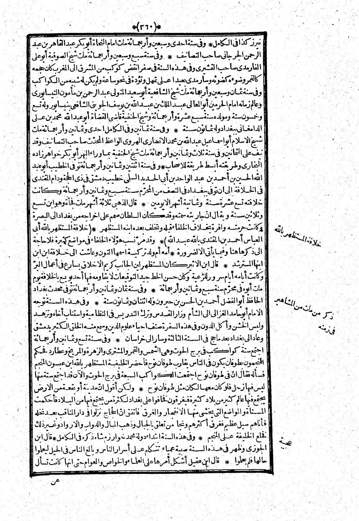 وفى سنة ثمان وثمانين وأربعمائة توفى محدث بغداد الحافظ أبو الفضل أحمد بن الحسن بن حيرون وله اثنتان وثمانون سنة* وفى هذه السنة توجه الامام أبو حامد الغزالى الى الشأم وزار القدس وترك التدريس فى النظامية واستناب أخاه وتزهد ولبس الخشن وأكل الدون وفى هذه السفرة صنف احياء علوم الدين وسمع منه الخلق الكثير بدمشق وعاد الى بغداد بعد ما حج فى السنة الثالثة وسار الى خراسان* وفى سنة تسع وثمانين وأربعمائة اجتمع ستة كواكب فى برج الحوت وهى الشمس والقمر والمشترى والزهرة والمريخ وعطارد فحكم المنجمون بطوفان يكون فى الناس يقارب طوفان نوح فأحضر الخليفة المستظهر بالله ابن عبسون المنجم فسأله فقال انّ فى طوفان نوح اجتمعت الكواكب السبعة فى برج الحوت والان قد اجتمع ستة منها ليس فيها زحل فلو كان معها لكان مثل طوفان نوح* ولكن أقول انّ مدينة أو بقعة من الارض يجتمع فيها عالم كثير من بلاد كثيرة فيغرقون فخافوا على بغداد لكثرة من يجتمع فيها من البلاد فأحكمت المسناة والمواضع التى يخشى منها الانفجار والغرق فاتفق انّ الحجاج نزلوا فى دار المناقب بعد نخله فأناهم سيل عظيم فغرق أكثرهم ونجا من تعلق بالجبال وذهب المال والدواب والارواد وغير ذلك فخلع الخليفة على المنجم* وفى هذه السنة ابتداء دولة محمد خوارزم شاه ذكره فى الكامل*