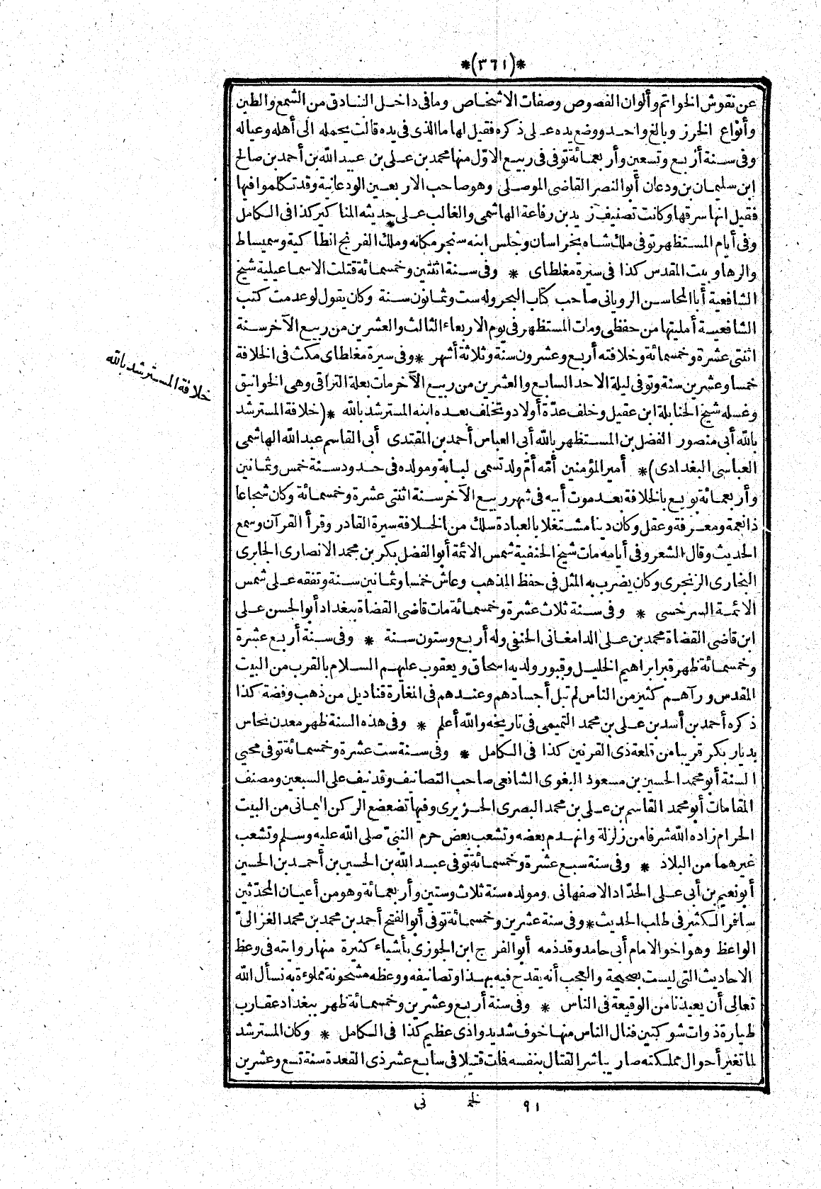 عن نقوش الخواتم وألوان الفصوص وصفات الاشخاص وما فى داخل البنادق من الشمع والطين وأنواع الخرز وبالغ واحد ووضع يده على ذكره فقيل لها ما الذى فى يده قالت يحمله الى أهله وعياله وفى سنة أربع وتسعين وأربعمائة توفى فى ربيع الاوّل منها محمد بن على بن عبيد الله بن أحمد بن صالح ابن سليمان بن ودعان أبو النصر القاضى الموصلى وهو صاحب الاربعين الودعانية وقد تكلموا فيها فقيل انها سرقها وكانت تصنيف زيد بن رفاعة الهاشمى والغالب على حديثه المناكير كذا فى الكامل وفى أيام المستظهر توفى ملك شاه بخراسان وجلس ابنه سنجر مكانه وملك الفرنج انطاكية وسميساط والرها وبيت المقدس كذا فى سيرة مغلطاى* وفى سنة اثنتين وخمسمائة قتلت الاسماعيلية شيخ الشافعية أبا المحاسن الرويانى صاحب كتاب البحر وله ست وثمانون سنة وكان يقول لو عدمت كتب الشافعية أمليتها من حفظى ومات المستظهر فى يوم الاربعاء الثالث والعشرين من ربيع الاخر سنة اثنتى عشرة وخمسمائة وخلافته أربع وعشرون سنة وثلاثة أشهر* وفى سيرة مغلطاى مكث فى الخلافة خمسا وعشرين سنة وتوفى ليلة الاحد السابع والعشرين من ربيع الاخر مات بعلة التراقى وهى الخوانيق وغسله شيخ الحنابلة ابن عقيل وخلف عدّة أولاد وتخلف بعده ابنه المسترشد بالله*