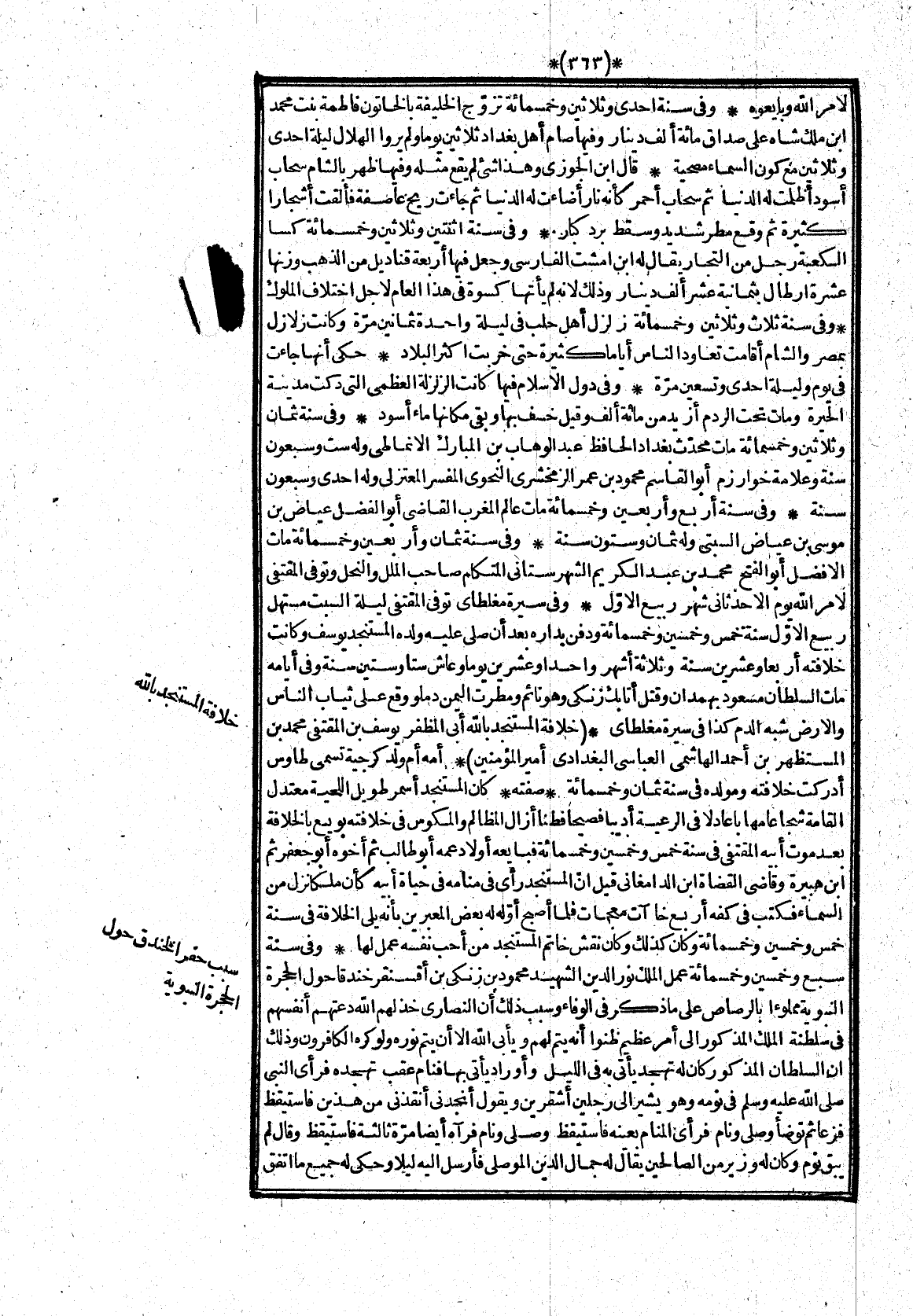 لامر الله وبايعوه* وفى سنة احدى وثلاثين وخمسمائة تزوّج الخليفة بالخاتون فاطمة بنت محمد ابن ملك شاه على صداق مائة ألف دينار وفيها صام أهل بغداد ثلاثين يوما ولم يروا الهلال ليلة احدى وثلاثين مع كون السماء مصحية* قال ابن الجوزى وهذا شئ لم يقع مثله وفيها ظهر بالشام سحاب أسود أظلمت له الدنيا ثم سحاب أحمر كأنه نار أضاءت له الدنيا ثم جاءت ريح عاصفة فألقت أشجارا كثيرة ثم وقع مطر شديد وسقط برد كبار* وفى سنة اثنتين وثلاثين وخمسمائة كسا الكعبة رجل من التجار يقال له ابن امشت الفارسى وجعل فيها أربعة قناديل من الذهب وزنها عشرة ارطال بثمانية عشر ألف دينار وذلك لانه لم يأتها كسوة فى هذا العام لاجل اختلاف الملوك* وفى سنة ثلاث وثلاثين وخمسمائة زلزل أهل حلب فى ليلة واحدة ثمانين مرّة وكانت زلازل بمصر والشام أقامت تعاود الناس أياما كثيرة حتى خربت اكثر البلاد* حكى أنها جاءت فى يوم وليلة احدى وتسعين مرّة* وفى دول الاسلام فيها كانت الزلزلة العظمى التى دكت مدينة الحيرة ومات تحت الردم أزيد من مائة ألف وقيل خسف بها وبقى مكانها ماء أسود* وفى سنة ثمان وثلاثين وخمسمائة مات محدّث بغداد الحافظ عبد الوهاب بن المبارك الانماطى وله ست وسبعون سنة* وعلامة خوارزم أبو القاسم محمود بن عمر الزمخشرى النحوى المفسر المعتزلى وله احدى وسبعون سنة* وفى سنة أربع وأربعين وخمسمائة مات عالم المغرب القاضى أبو الفضل عياض بن موسى بن عياض السبتى وله ثمان وستون سنة* وفى سنة ثمان وأربعين وخمسمائة مات الافضل أبو الفتح محمد بن عبد الكريم الشهرستانى المتكلم صاحب الملل والنحل وتوفى المقتفى لامر الله يوم الاحد ثانى شهر ربيع الاوّل* وفى سيرة مغلطاى توفى المقتفى ليلة السبت مستهل ربيع الاوّل سنة خمس وخمسين وخمسمائة ودفن بداره بعد أن صلى عليه ولده المستنجد يوسف وكانت خلافته أربعا وعشرين سنة وثلاثة أشهر واحدا وعشرين يوما وعاش ستا وستين سنة وفى أيامه مات السلطان مسعود بهمدان وقتل أتابك زنكى وهو نائم ومطرت اليمن دما ووقع على ثياب الناس والارض شبه الدم كذا فى سيرة مغلطاى*