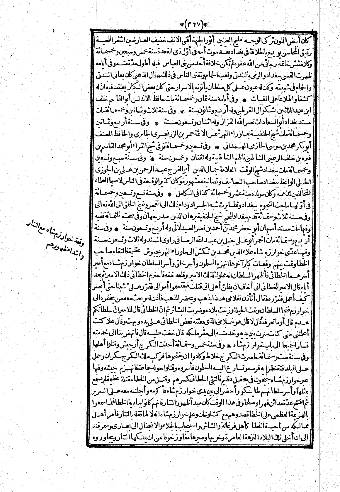 وفى سنة أربع وستمائة مات المعمر أبو على حنبل بن عبد الله الرصافى راوى المسند وله ثلاث وتسعون سنة وفيها عدّى خوارزم شاه علاء الدين محمد بن تكش الى ماوراء النهر بجيوش عظيمة فالتقاه صاحب الخطا وتمت بينهم وقعات كبار آخرها انهزم المسلمون وأسر خلق وأسر السلطان خوارزم شاه مع أمير أسرهما الخطائى فأظهر السلطان انه مملوك لذلك الامير وقلعه خفه فاحترم الخطائى ذلك الامير ثم بعد أيام قال الامير للخطائى انى أخاف ان يظنّ أهلى انى قتلت فيقتسموا أموالى فقرّر علىّ شيئا حتى أبصر كيف أعمل فقرّره فقال أتأذن لغلامى هذا يذهب ويحضر الذهب فأذن له وبعث معه من يخفره الى خوارزم فنجا السلطان وتمت الحيلة وزينت بلاده وضربت البشائر ثم انّ الخطائى قال للامير انّ سلطانكم عدم قال أو ما تعرفه قال لا قال هو غلامى الذى بعثته فعض الخطائى على يده وبهت وقال هلا كنت أعلمتنى حتى كنت سرت بين يديه وخدمته الى مقر ملكه قال خفت عليه قال فانهض بنا الى خدمته فسارا جميعا الى باب خوارزم شاه* وفى سنة خمس وستمائة أخذت الكرج أرجيش وقتلوا أهلها وفى سنة ست وستمائة حاصرت الكرج خلاط وكادوا ان يفتحوها فركب ملك الكرج سكران وحمل على البلد فتقنطر به فرسه وتسارع اليه المسلمون فأسروه وقتلوا حوله جماعة فانهزم جيشه وفيها عبر خوارزم شاه جيحون فى جحفل عظيم فالتقى الخطا فكسرهم وقتل من الخطا مقتلة عظيمة لم يسمع بمثلها وأسر سلطانهم طاينكو وأحضر الى بين يدى خوارزم شاه فأكرمه وأجلسه معه على السرير ثم افتتح عدّة مدائن قهرا وصالحا وفى هذا الوقت كان مبدأ ظهور التتار فانهم كانوا ببادية الخطا فلما سمعوا بالهزيمة العظمى على الخطا قصدوهم مع كشلوخان وعلم خوارزم شاه انه لا طاقة له بالتتار فأمر أهل ممالكه من ناحية الخطا كأهل فرغانة والشاش واسبيجاب بالجلاء والانجفال الى بخارى وسمرقند الى ان أخلى تلك البلاد النزهة العامرة وخربها وصيرها مفاوز خوفا من ان يملكها التتار ويجاوروه