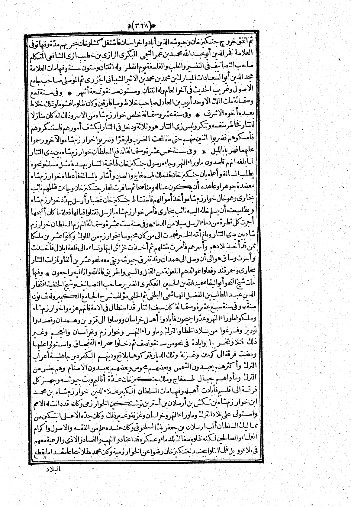 ثم اتفق خروج جنكيزخان وجيوشه الذين أبادوا خراسان فاشتغل كشلوخان بحربهم مدّة وفيها توفى العلامة فخر الدين أبو عبد الله محمد بن عمر التيمى البكرى الرازى بن خطيب الرى الشافعى المتكلم صاحب التصانيف فى التفسير والطب والفلسفة يوم الفطر وله اثنتان وستون سنة وفيها مات العلامة مجد الدين أبو السعادات المبارك بن محمد بن محمد بن الاثير الشيبانى الجزرى ثم الموصلى صاحب جامع الاصول وغريب الحديث فى آخر العام وله اثنتان وستون سنة وتسعة أشهر* وفى سنة تسع وستمائة مات الملك الاوحد أيوب بن العادل صاحب خلاط وميافارقين وكان ظلوما غشوما وتملك خلاط بعده أخوه الاشرف* وفى سنة عشر وستمائة خلص خوارزم شاه من الاسر وذلك انه كان منازلا للتتار فخاطر بنفسه وتنكر ولبس زى التتار هو وثلاثة ودخل فى التتار ليكشف أمورهم فاستنكروهم فأمسكوهم فضربوا اثنين منهم حتى ماتا تحت الضرب ولم يقرّا وضربوا خوارزم شاه والاخر ورسموا عليهما فهربا بالليل* وفى سنة خمس عشرة وستمائة اندفع السلطان خوارزم شاه بين يدى التتار لما بلغه انهم قاصدون ماوراء النهر وجاءه رسول جنكيزخان طاغية التتار بهدية مثل مسك ونحوه يطلب المسالمة وأعلمه بان جنكيزخان قد ملك طمغاج والصين وأشار بالمسالمة فأعطاه خوارزم شاه معضدة جوهرا وعاهده أن يكون عينا له ومناصحا ثم سافرت تجار جنكيزخان وجاءت فظلمهم نائب بخارى وهو خال خوارزم شاه وأخذ أموالهم فاستشاط جنكيزخان غضبا وأرسل يهدّد خوارزم شاه ويطلب منه أن يسلم خاله اليه نائب بخارى فأمر خوارزم شاه بالرسل فقتلوا فيا لها فعلة ما كان أقبحها أجرت كل قطرة من دماء الرسل سيلا من الدماء* وفى سنة ست عشرة وستمائة انهزم السلطان خوارزم شاه بين يدى التتار وبلغ أمّه الخبر فعمدت الى من كان محبوسا بخوارزم من الملوك وكانوا عشرين ملكا ممن قد أخذ بلادهم وأسرهم فأمرت بقتلهم ثم أخذت خزائن ابنها ونساءه الى قلعة ابلال فأخذت وأسرت وساق هو الى أن وصل الى همدان وقد تفرق جيوشه وبقى معه نحو عشرين ألفا ونازلت التتار بخارى وسمرقند وفعلوا عوائدهم الملعونة من القتل والسبى والحريق فانا لله وانا اليه راجعون* وفيها مات شيخ النحو أبو البقاء عبد الله بن الحسين العكبرى الضرير صاحب التصانيف وشيخ الحنفية افتخار الدين عبد المطلب بن الفضل الهاشمى البلخى ثم الحلبى مؤلف شرح الجامع الكبير وله ثمانون سنة* وفى سنة سبع عشرة وستمائة كان سيف التتار قد استطال فى الامة فانهم هزموا خوارزم شاه وملكوا ماوراء النهر وعدّوا جيحون فأبادوا أهل خراسان ووصلوا الى قزوين وهمدان وقصدوا توريز وفرغوا من بلاد الخطا والترك وماوراء النهر وخوارزم وخراسان والعجم وغير ذلك قتلا وتخريبا وابادة فى نحو من سنة ونصف ثم دخلوا صحراء القفجاق واستولوا عليها ومضت فرقة الى كرمان وغزنة وتلك الديار فتركوها بلاقع ودينهم الكفر دين جاهلية أعراب الترك وأكثرهم يعبدون الشمس وبعضهم مجوس وبعضهم يعبدون الاصنام وهم جنس من الترك ومأواهم جبال طمغاج وملك جنكيزخان عدّة أقاليم وبث جيوشه وجهز كل فرقة الى اقليم فأبادت أهله وفيها مات السلطان الكبير علاء الدين خوارزم شاه بن محمد ابن خوارزم شاه بن تكش بن أرسلان بن أستر بن توشتكين الخوارزمى وكان قدد انت له الامم واستولى على بلاد الترك وماوراء النهر وخراسان وغزنة وغير ذلك وكان جدّه الاعلى البتكين من مماليك السلطان ألب ارسلان بن جعفر بك السلجوقى وكان عنده علم من الفقه والاصول واكرام العلماء والصالحين لكنه ظلوم سفاك للدماء وعسكره قد اعتادوا النهب والفساد والاذى والرعية معهم فى بلاء وويل فلما ابتلوا بجند جنكيزخان رضوا عن الخوارزمية وكان محمد بطلا شجاعا مقداما يقطع