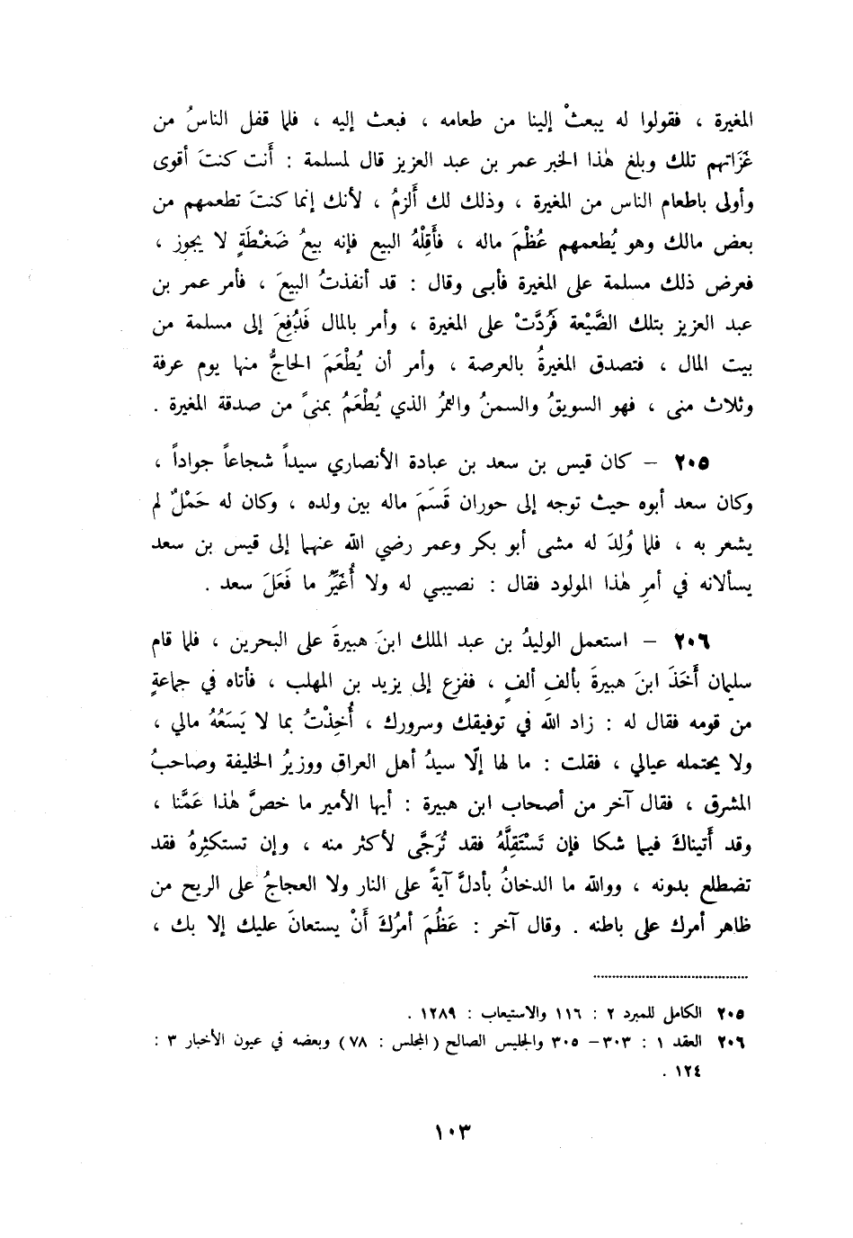«206» - استعمل الوليد بن عبد الملك ابن هبيرة على البحرين، فلما قام سليمان أخذ ابن هبيرة بألف ألف، ففزع إلى يزيد بن المهلب، فأتاه في جماعة من قومه فقال له: زاد الله في توفيقك وسرورك، أخذت بما لا يسعه مالي، ولا يحتمله عيالي، فقلت: ما لها إلّا سيد أهل العراق ووزير الخليفة وصاحب المشرق، فقال آخر من أصحاب ابن هبيرة: أيها الأمير ما خصّ هذا عمّنا، وقد أتيناك فيما شكا فإن تستقلّه فقد ترجّى لأكثر منه، وإن تستكثره فقد تضطلع بدونه، ووالله ما الدخان بأدلّ آية على النار ولا العجاج على الريح من ظاهر أمرك على باطنه. وقال آخر: عظم أمرك أن يستعان عليك إلا بك،