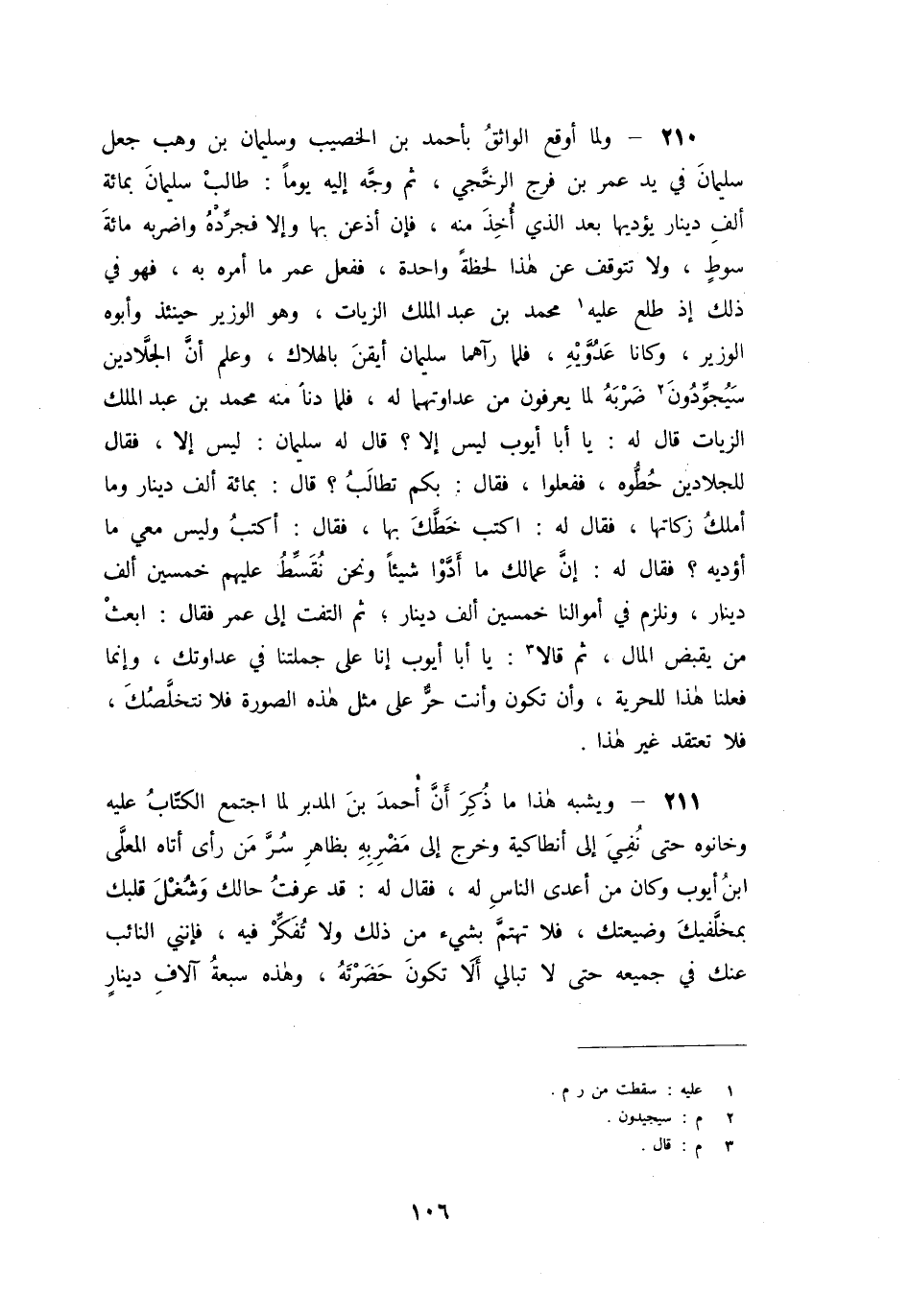 211- ويشبه هذا ما ذكر أنّ أحمد بن المدبر لما اجتمع الكتّاب عليه وخانوه حتى نفي إلى أنطاكية وخرج إلى مضربه بظاهر سرّ من رأى أتاه المعلّى ابن أيوب وكان من أعدى الناس له، فقال له: قد عرفت حالك وشغل قلبك بمخلّفيك وضيعتك، فلا تهتمّ بشيء من ذلكم ولا تفكّر فيه، فإنني النائب عنك في جميعه حتى لا تبالي ألا تكون حضرته، وهذه سبعة آلاف دينار