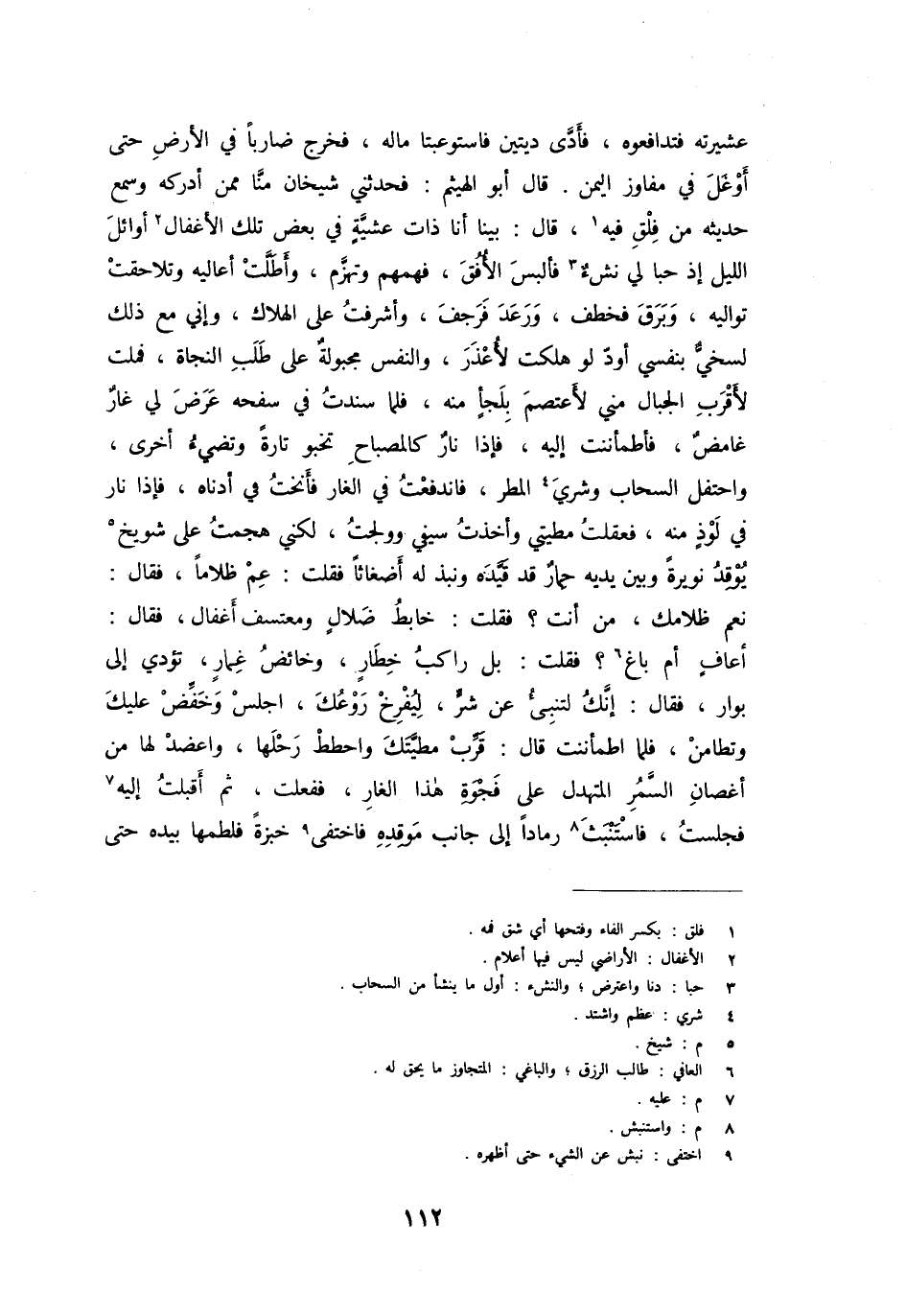 عشيرته فتدافعوه، فأدّى ديتين فاستوعبتا ماله، فخرج ضاربا في الأرض حتى أوغل في مفاوز اليمن. قال أبو الهيثم: فحدثني شيخان منّا ممن أدركه وسمع حديثه من فلق فيه [1] ، قال: بينا أنا ذات عشيّة في بعض تلك الأغفال [2] أوائل الليل إذ حبا لي نشء [3] فألبس الأفق، فهمهم وتهزّم، وأطلّت أعاليه وتلاحقت تواليه، وبرق فخطف، ورعد فرجف، وأشرفت على الهلاك، وإني مع ذلك لسخيّ بنفسي أودّ لو هلكت لأعذر، والنفس مجبولة على طلب النجاة، فملت لأقرب الجبال مني لأعتصم بلجأ منه، فلما سندت في سفحه عرض لي غار غامض، فأطمأننت إليه، فإذا نار كالمصباح تخبو تارة وتضيء أخرى، واحتفل السحاب وشري [4] المطر، فاندفعت في الغار فأنخت في أدناه، فإذا نار في لوذ منه، فعقلت مطيتي وأخذت سيفي وولجت، لكني هجمت على شويخ [5] يوقد نويرة وبين يديه حمار قد قيّده ونبذ له أضغاثا فقلت: عم ظلاما، فقال: