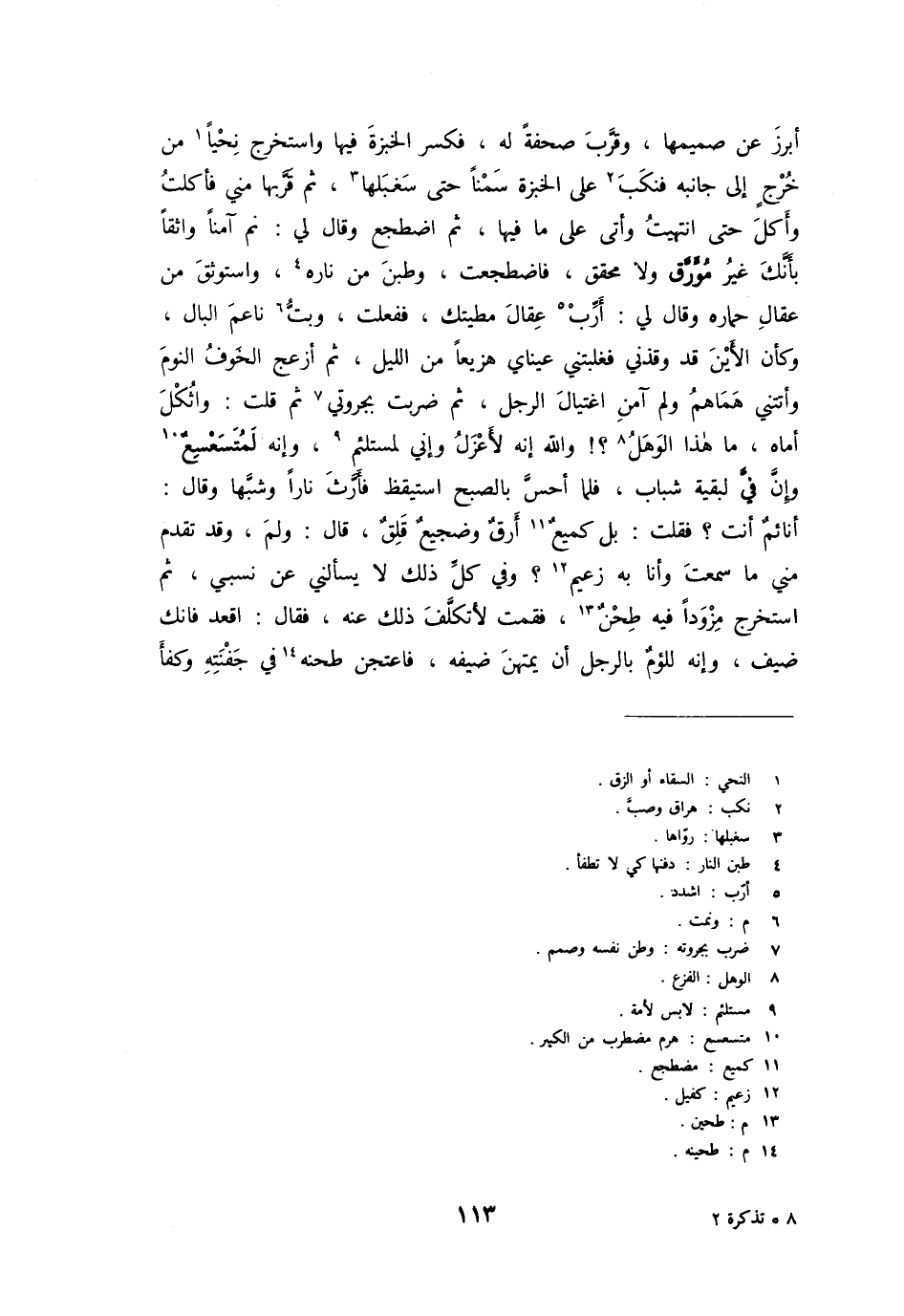 أبرز عن صميمها، وقرّب صحفة له، فكسر الخبزة فيها واستخرج نحيا [1] من خرج إلى جانبه فنكب [2] على الخبزة سمنا حتى سغبلها [3] ، ثم قرّبها مني فأكلت وأكل حتى انتهيت وأتى على ما فيها، ثم اضطجع وقال لي: نم آمنا واثقا بأنّك غير موّرّق ولا محقق، فاضطجعت، وطبن من ناره [4] ، واستوثق من عقال حماره وقال لي: أرّب [5] عقال مطيتك، ففعلت، وبتّ [6] ناعم البال، وكأن الأين قد وقذني فغلبتني عيناي هزيعا من الليل، ثم أزعج الخوف النوم وأتتني هماهم ولم آمن اغتيال الرجل، ثم ضربت بجروتي [7] ثم قلت: واثكل أماه، ما هذا الوهل [8] ؟! والله إنه لأعزل وإني لمستلئم [9] ، وإنه لمتسعسع [10] وإنّ فيّ لبقية شباب، فلما أحسّ بالصبح استيقظ فأرّث نارا وشبّها وقال: